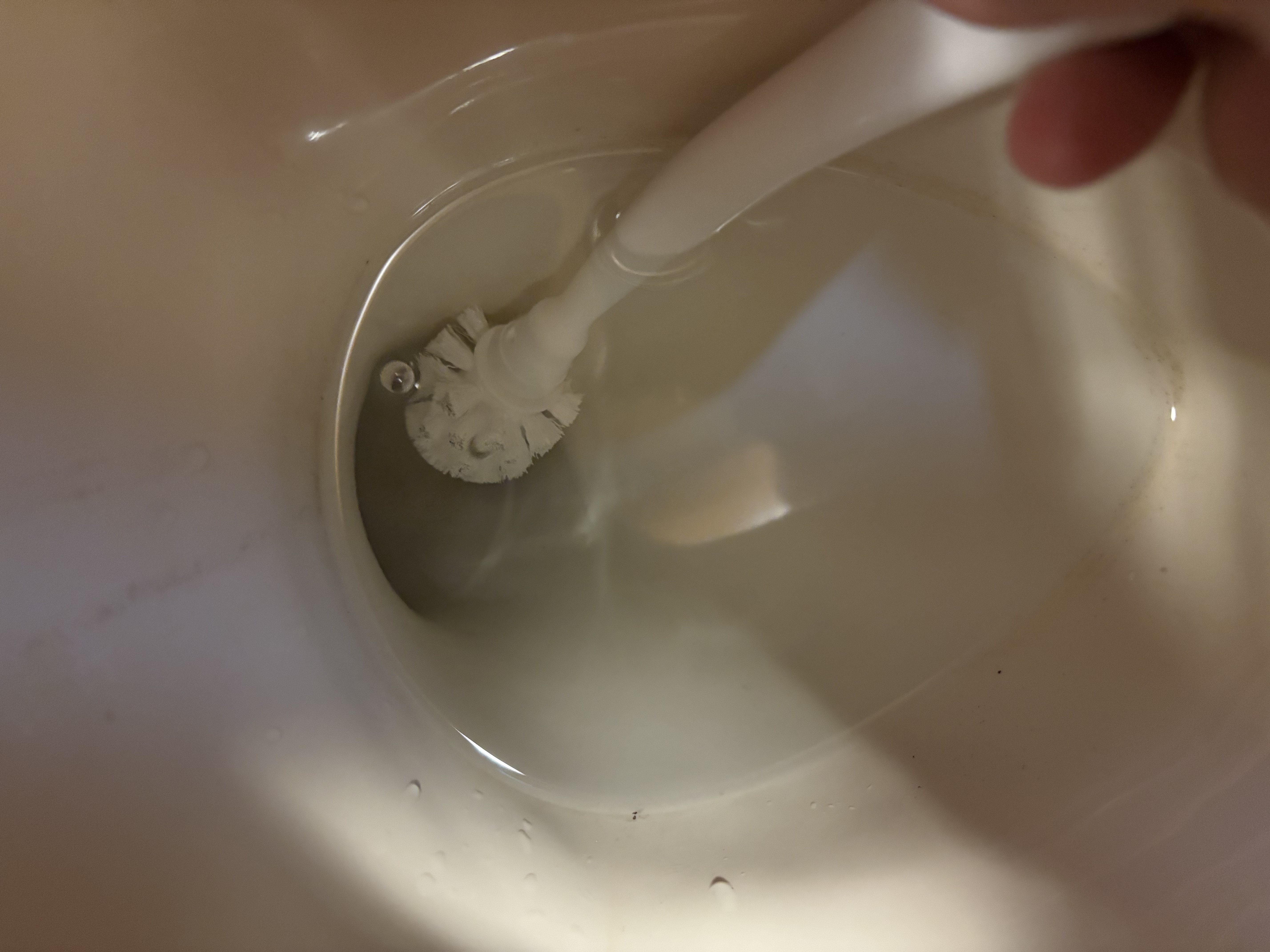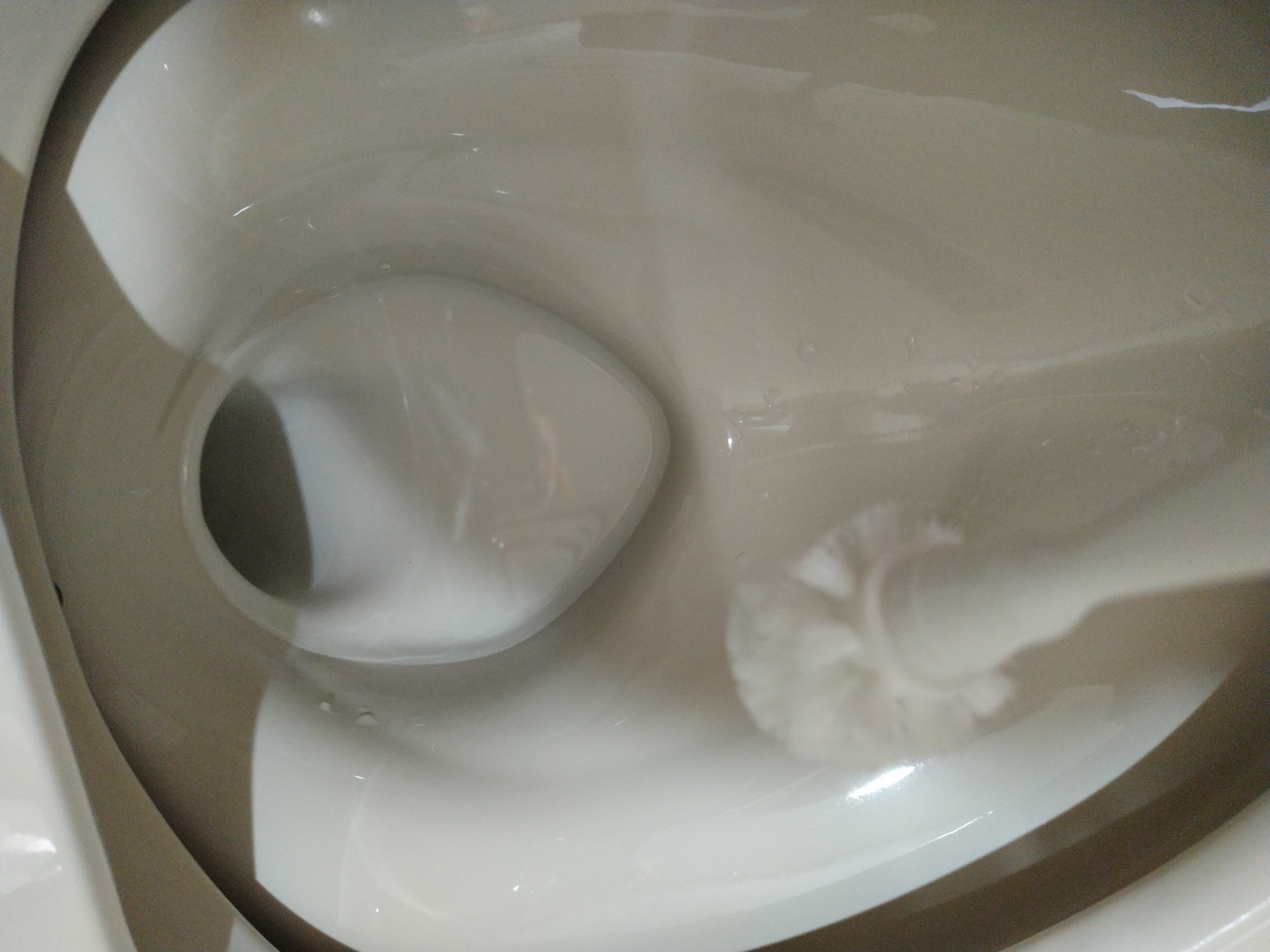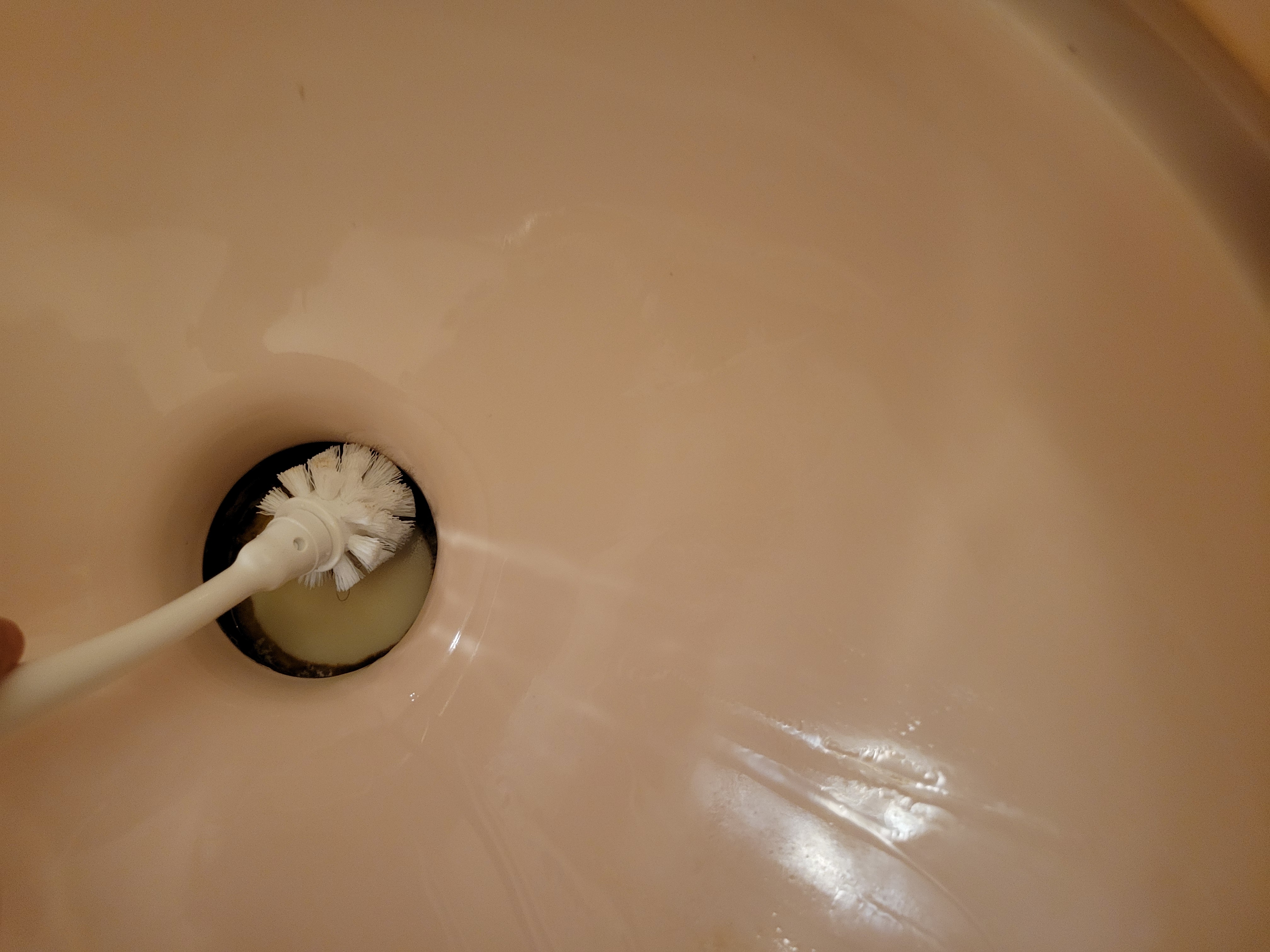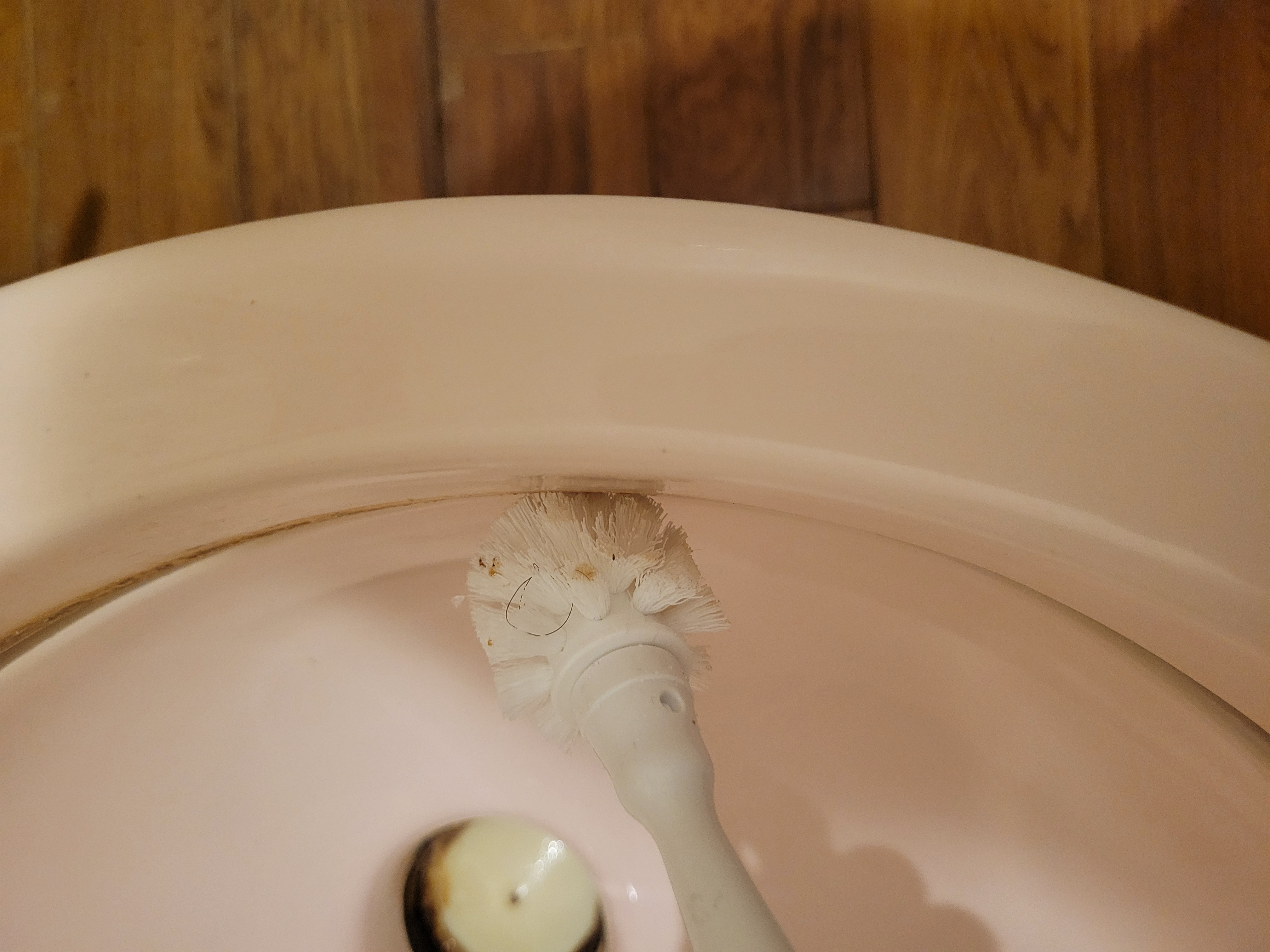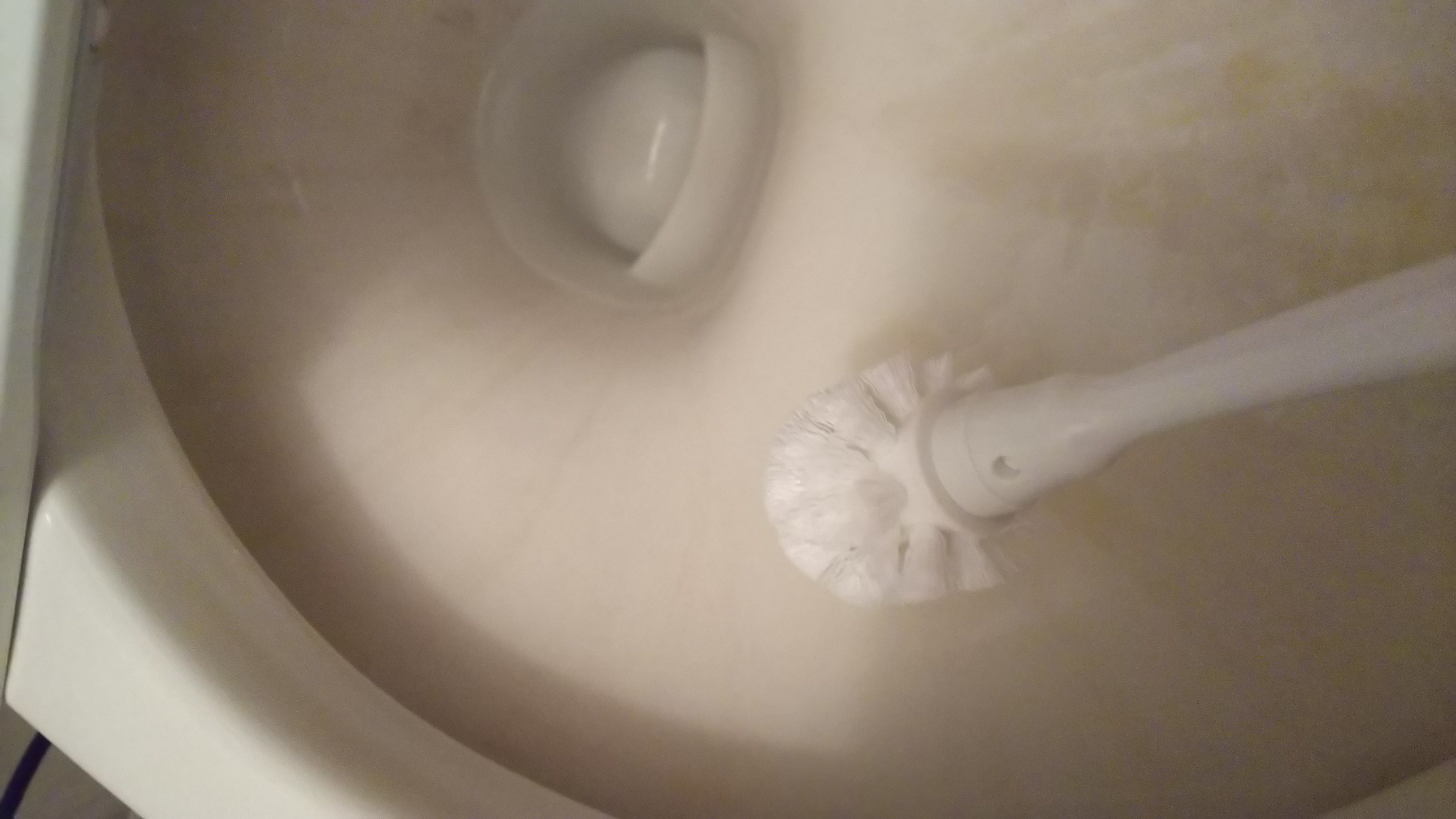 便器はともかくシンク上の受け皿の掃除をずっと怠っていて、ブルーレットの汚れがこびりついているのを見ない振りをしていたけどブラシのせいで掃除する気になった。 でも完全に綺麗にはならなかった(泣)。 |