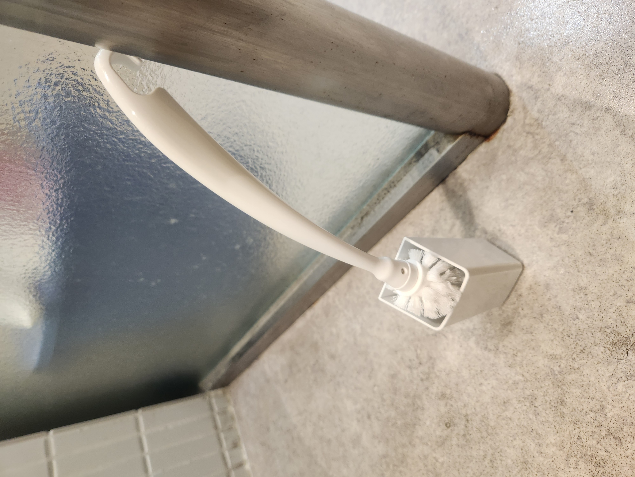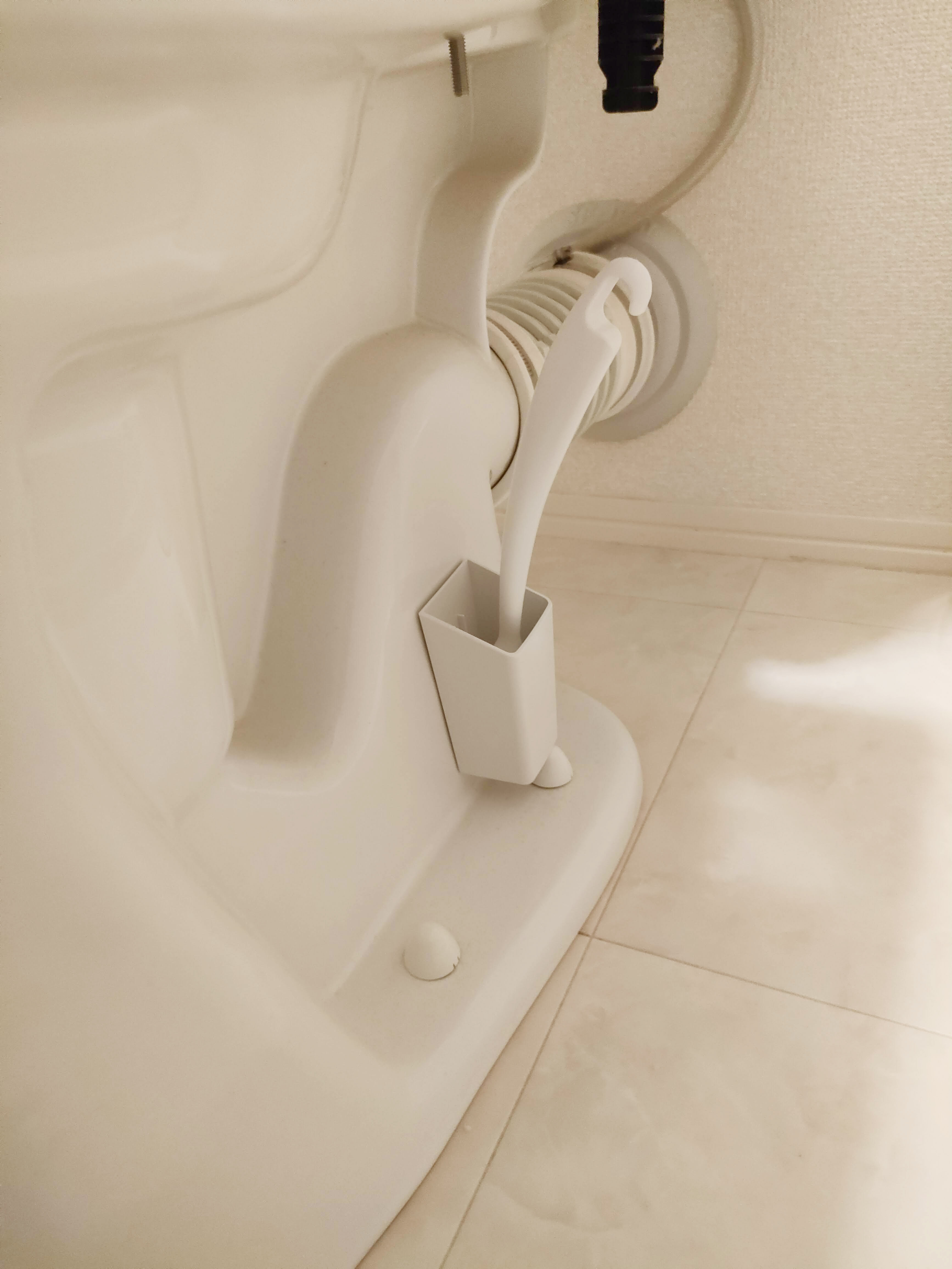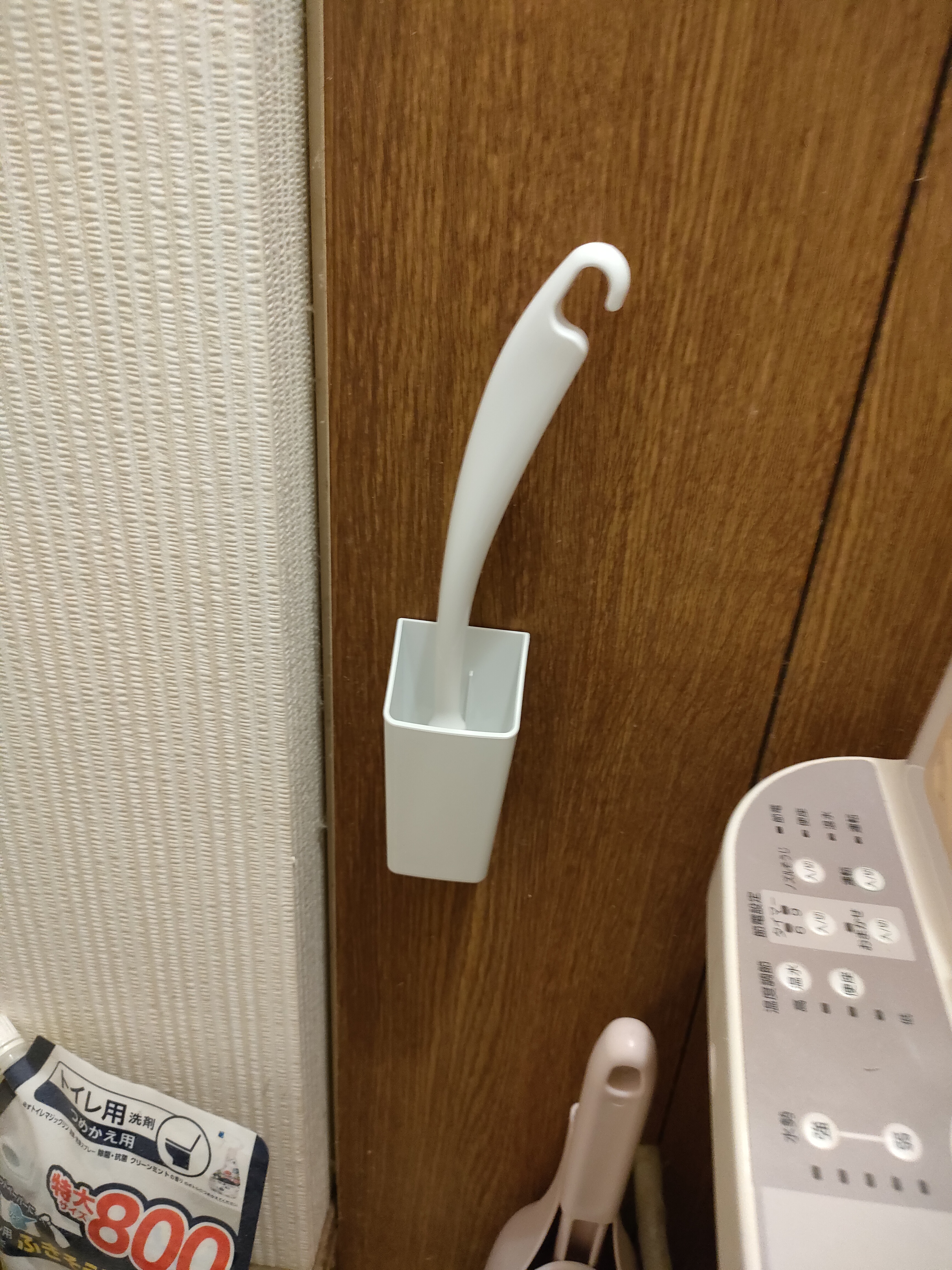 トイレタンクの横に貼り付けられるので、場所も取らず、すっきり✨床掃除のときに動かす必要もないので、とっても楽です!コンパクトなヘッドなので、縁まで掃除もしやすいです。 ただ、柄が短いため、奥の方を掃除しようとする際、水が跳ねる気がして、ちょっと心配しながら使ってます。柄の部分に伸縮性を持たせたら、コンパクトさを活かしつつ、水跳ねも気にせず、しっかりトイレ掃除ができるのではないかと思います。 |