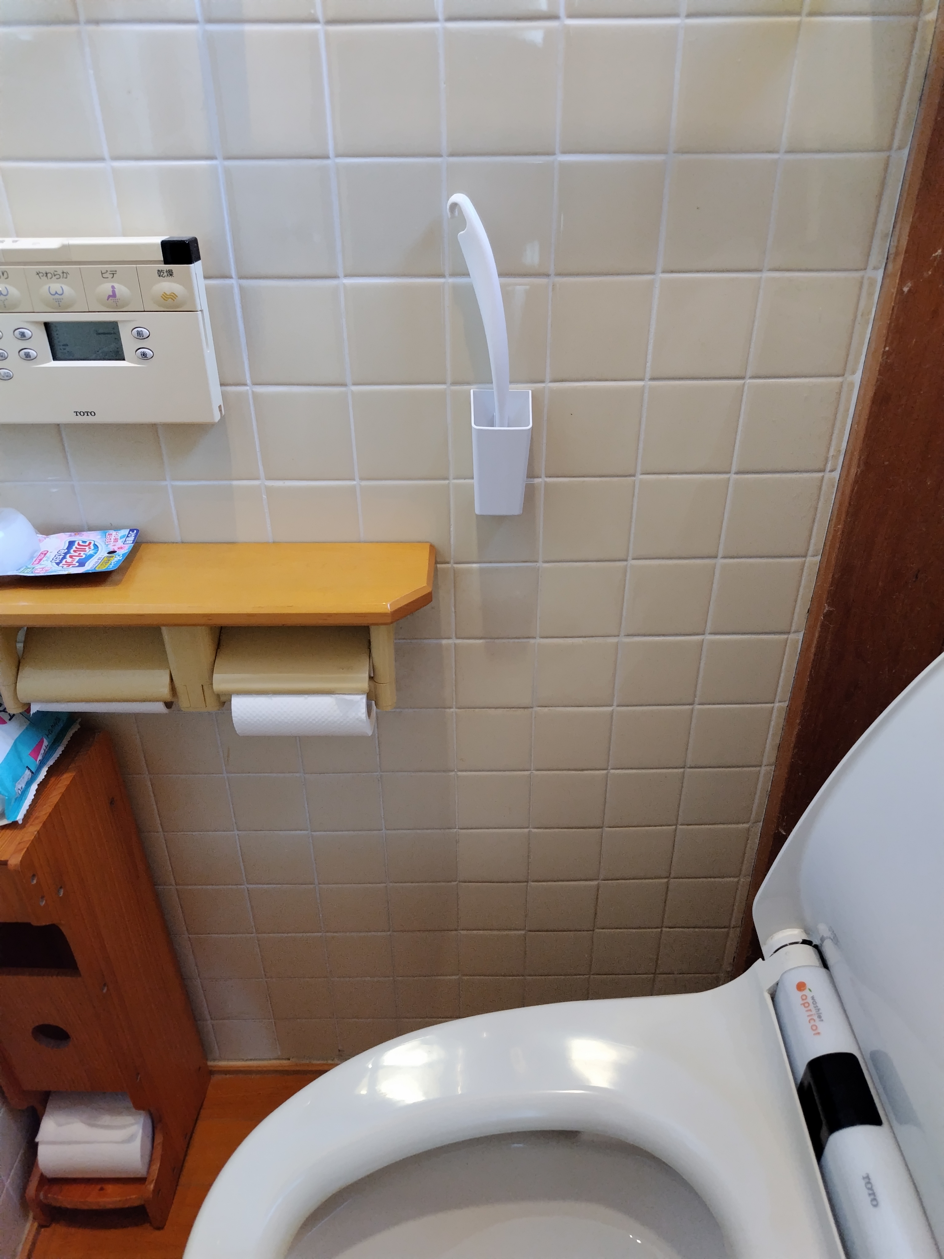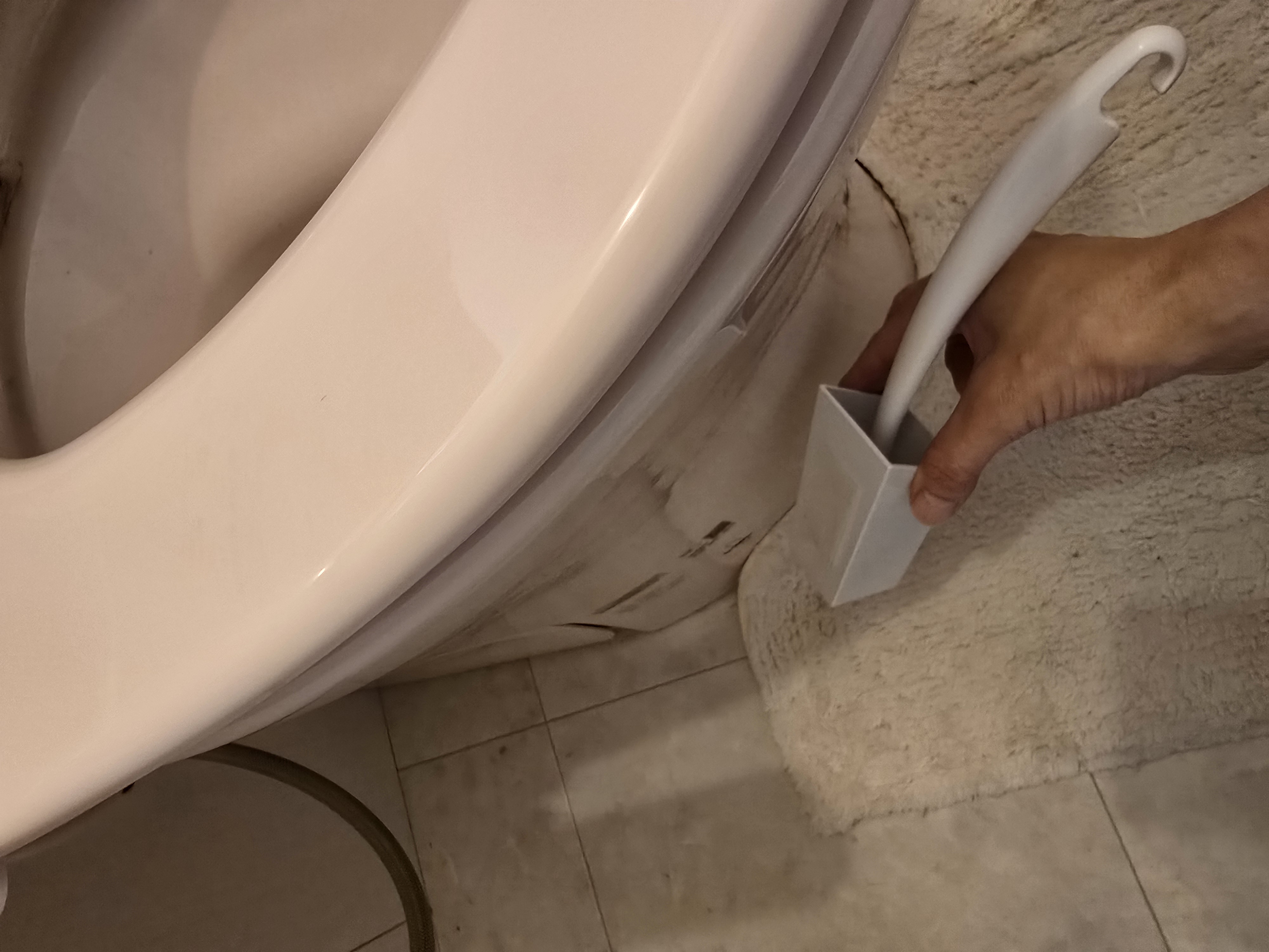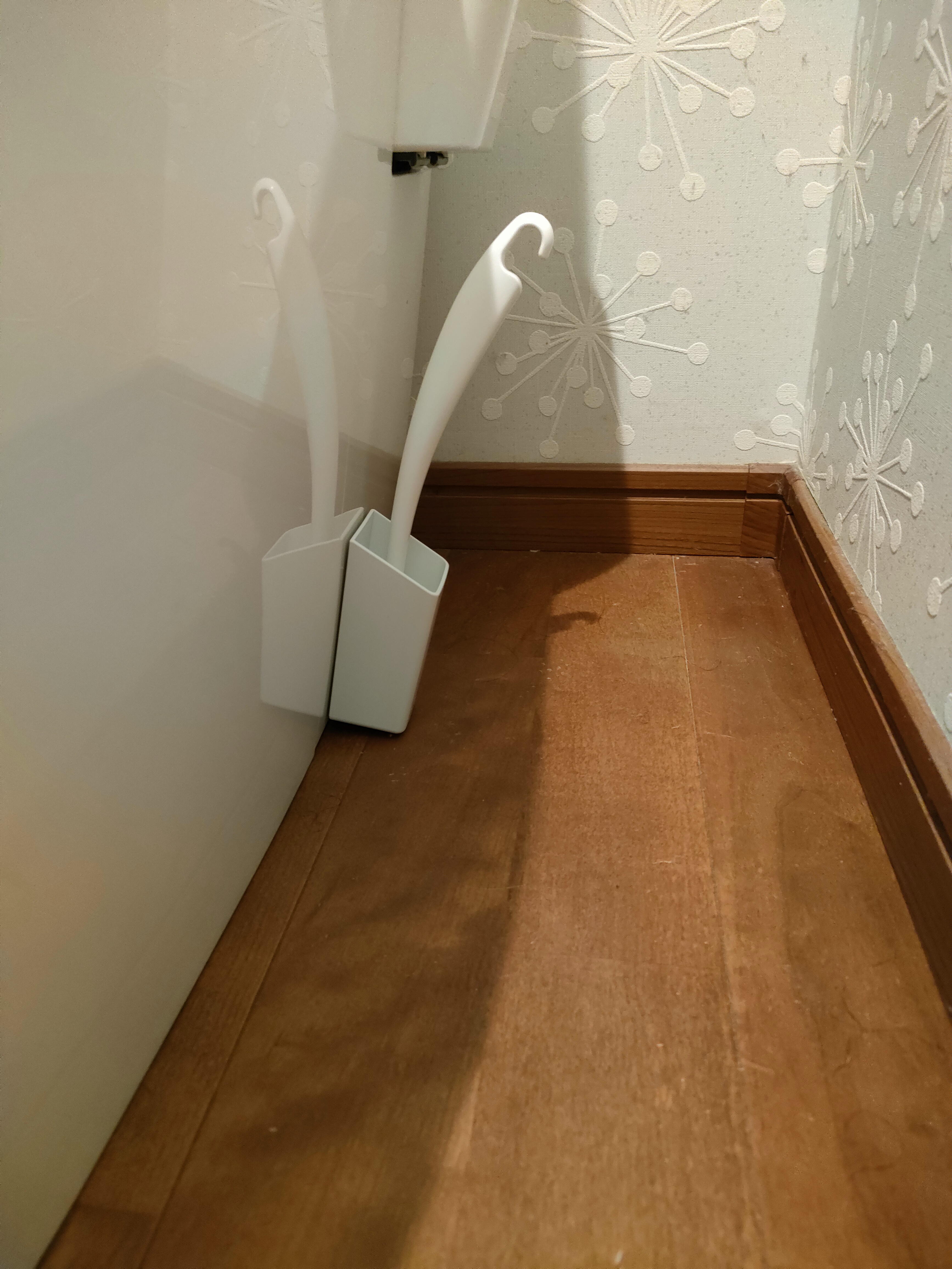 トイレタンクの横に貼り付けられるので、場所も取らず、すっきり✨床掃除のときに動かす必要もないので、とっても楽です!コンパクトなヘッドなので、縁まで掃除もしやすいです。 ただ、柄が短いため、奥の方を掃除しようとする際、水が跳ねる気がして、ちょっと心配しながら使ってます。柄の部分に伸縮性を持たせたら、コンパクトさを活かしつつ、水跳ねも気にせず、しっかりトイレ掃除ができるのではないかと思います。 |