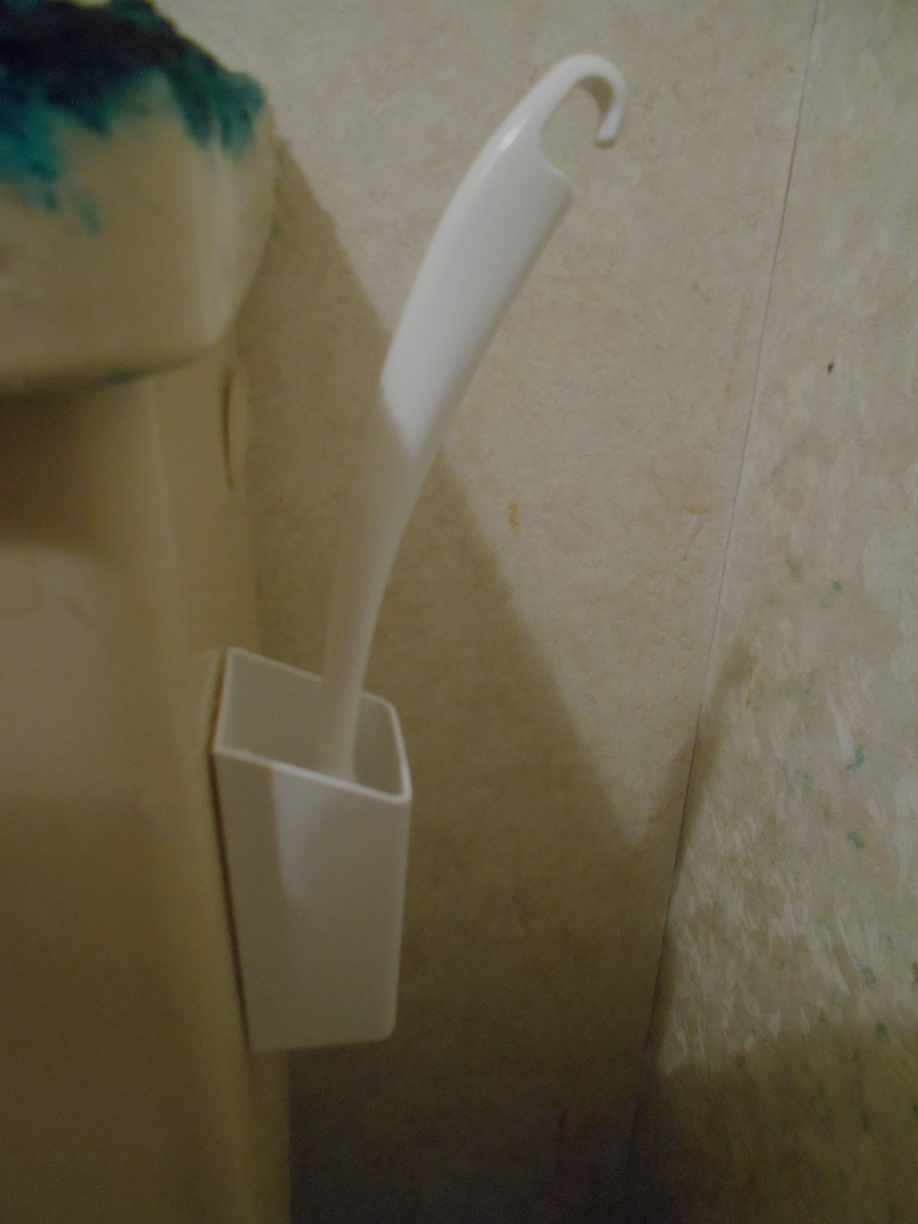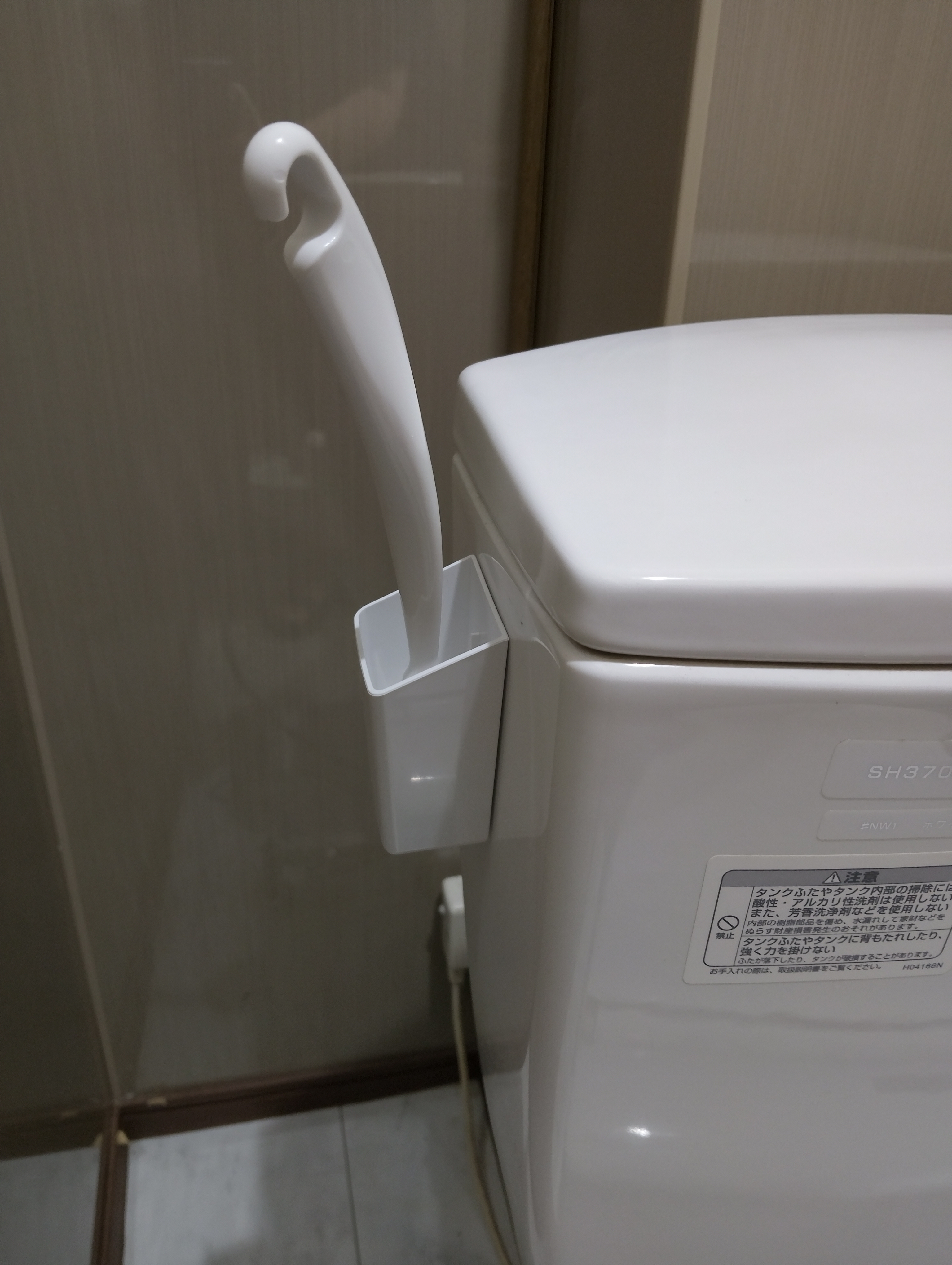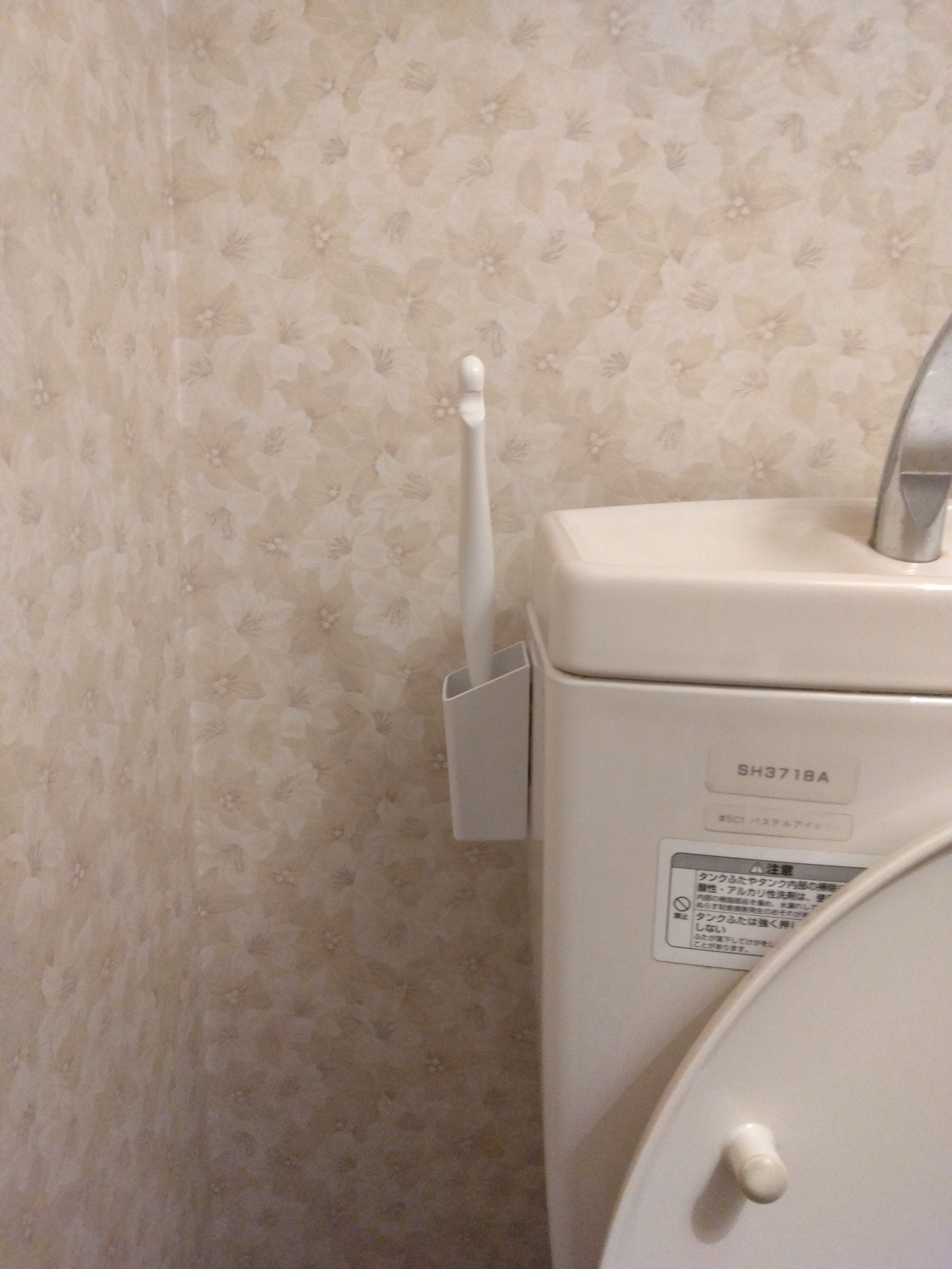 トイレタンクに付けたかったのですが、丸みをおびた形状で、つけてみたものの、すぐに落ちてしまいました。壁面に付けて、安定してくれたので、場所もとらないし、結果オーライ。気になったときにさっと使えるのが、良いです。ブラシの毛足が短いので、擦ったときに水気をはじかないのも良かった。ただ、柄が短くて、便器の深いところを洗うのは、縁に手があたってしまいそうになるのが嫌でした。 |