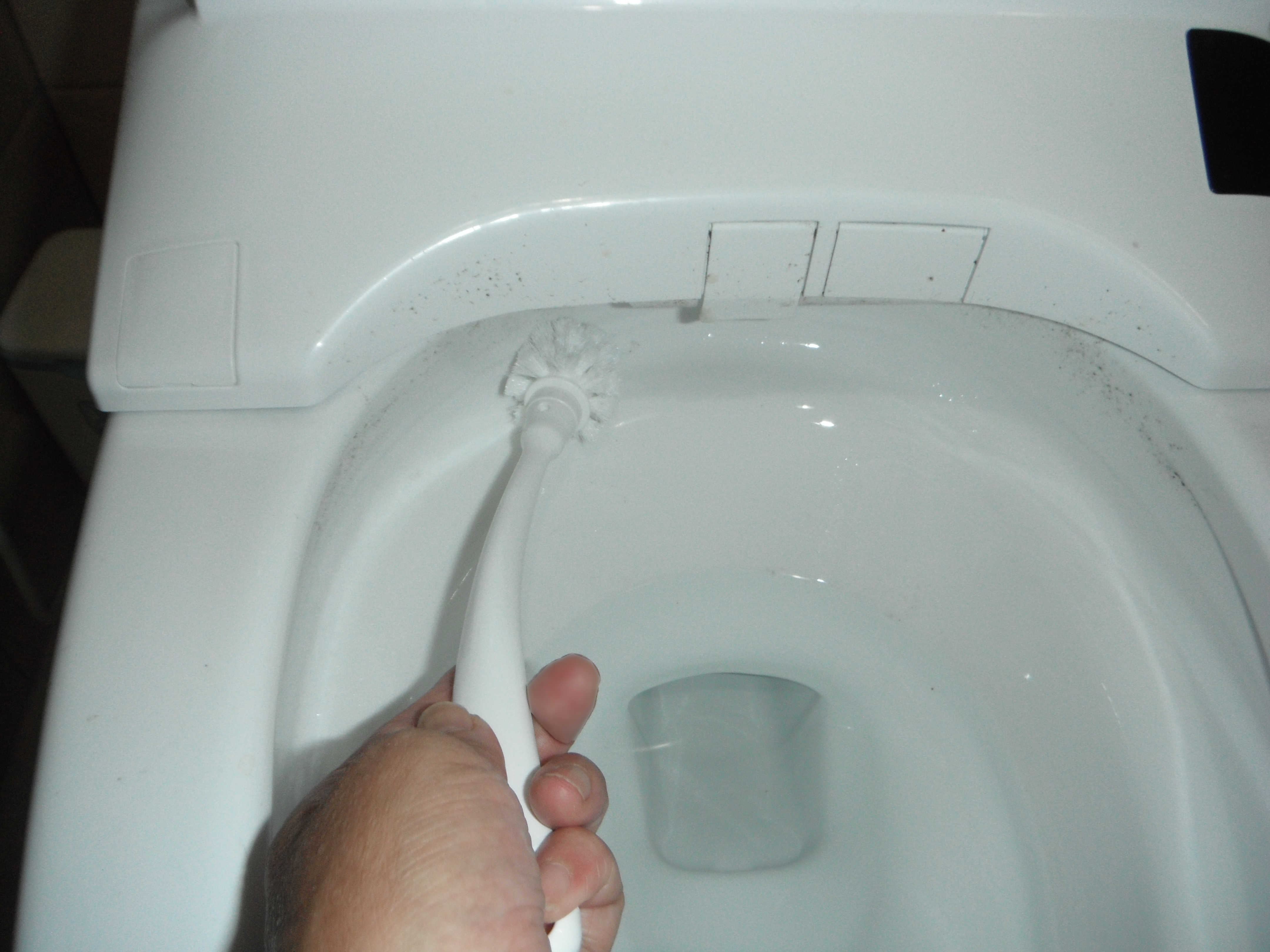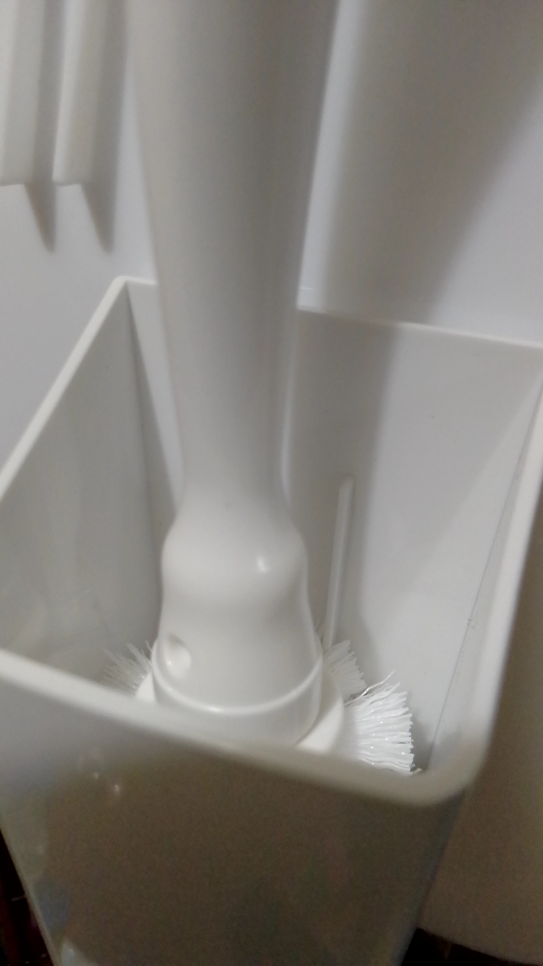 ブラシのケースは、タンクの横に貼り付けられるので、下に置く通常のブラシより使い勝手が良い。 ブラシは、しっかりした堅さで、細身なので便器の内側までしっかり磨ける。1週間使った程度では、通常の毛を植えたブラシと差があるようには見平面部を平面部の清掃にはあまり向いていないように思われる。現状のブラシの一部に少し長めの植毛部を設ければもっと使い勝手が良くなると思われる。 |