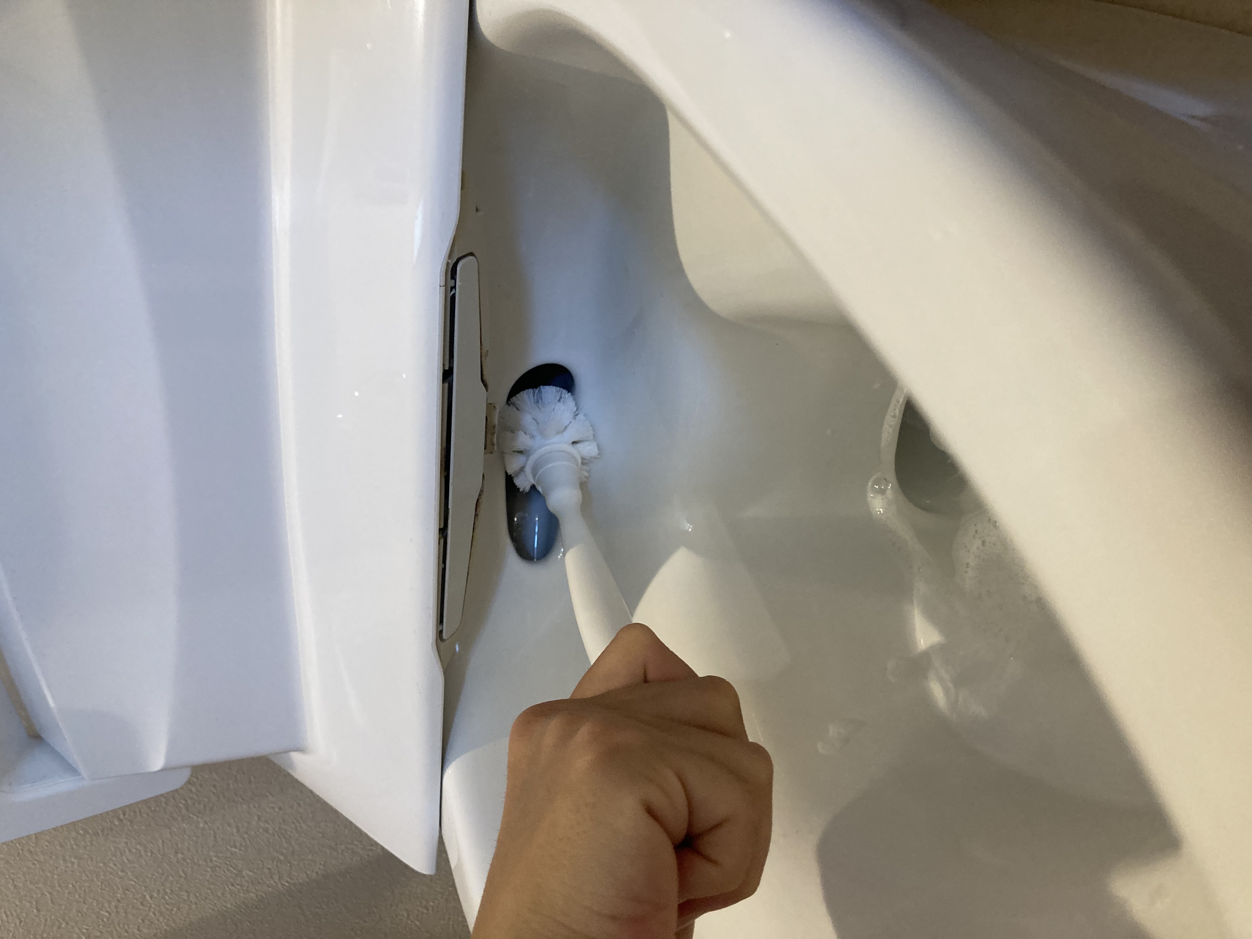 ブラシ部分がコンパクトなので、洗う箇所にうまく力が伝わり、使いやすいです。ただ、先端がもう少し細い方が、より便器のフチの裏側まで届くと思います。 |