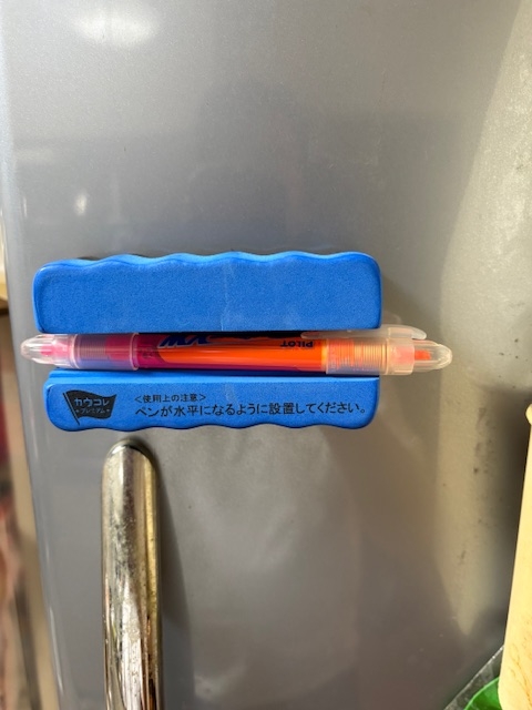 | うちのボードが小さくて多くの文字は書けませんね、でも用はは十分果たせています。ペンが細くてときどき抜けてしまいます。もうすぐふとペンを用意しますね |