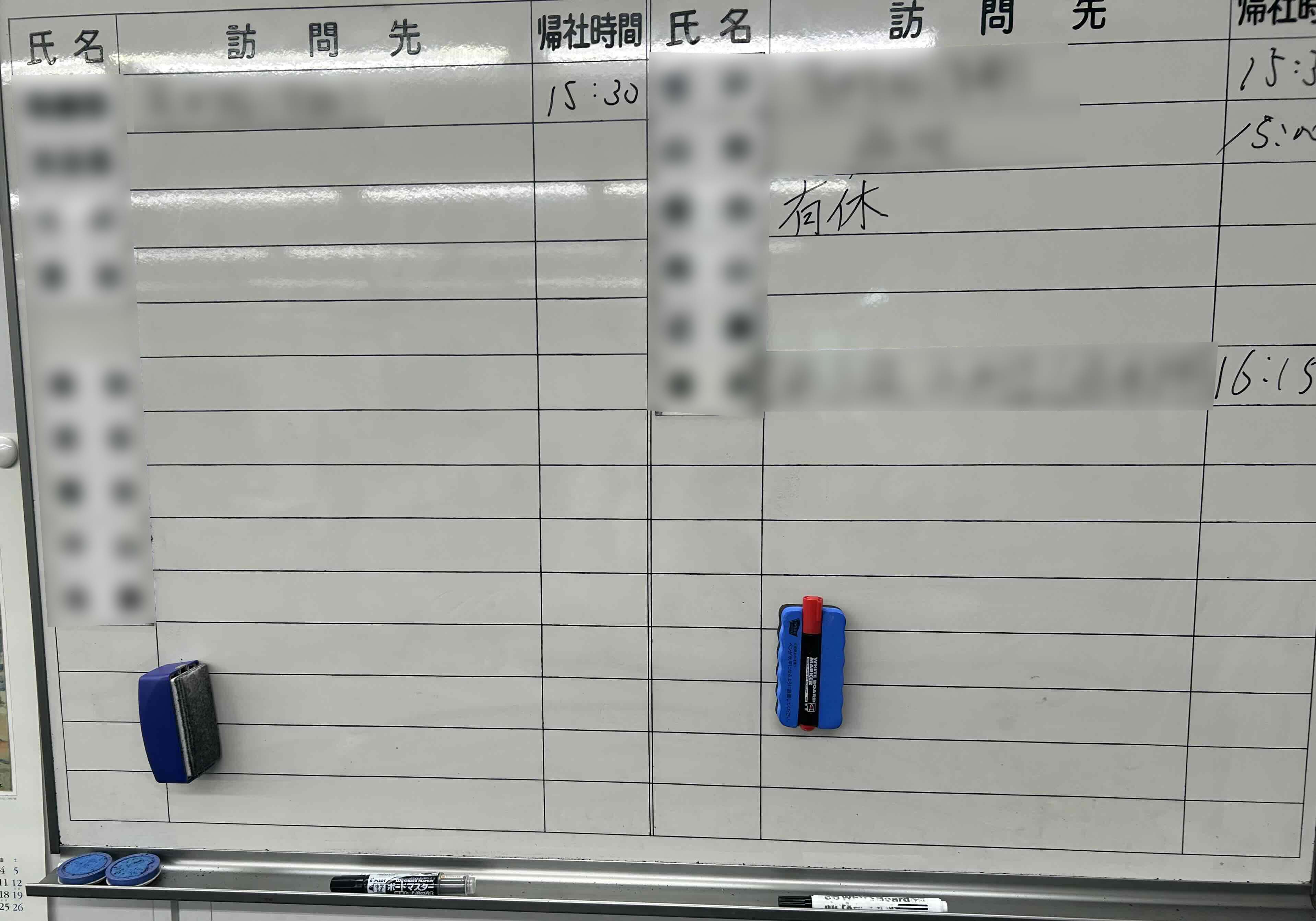 | 会社で使用している「行先予定」のホワイトボードは壁に取り付けてあります。その下には物が置いてあって、イレーザーやペンが落下したときには、取り上げるのが面倒でした。そのときはマジックハンドを使用。これであれば、ボードにそのままくっつくので、落下もなく安心です。 |