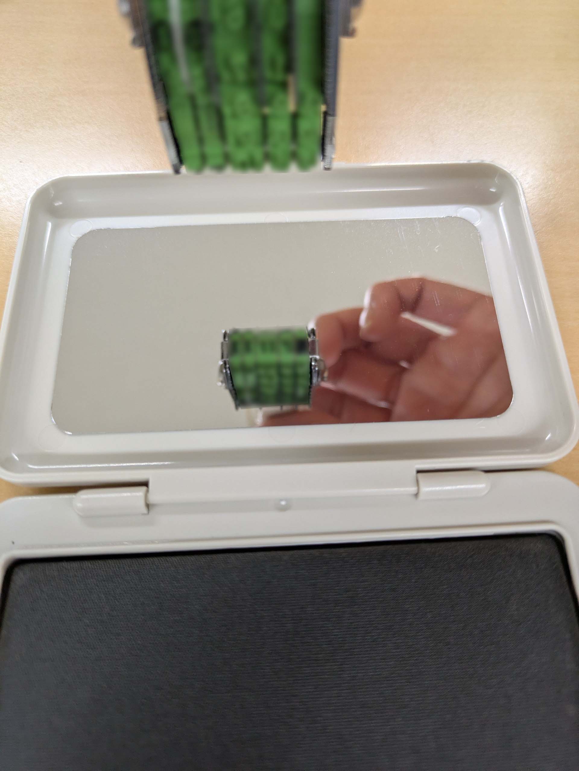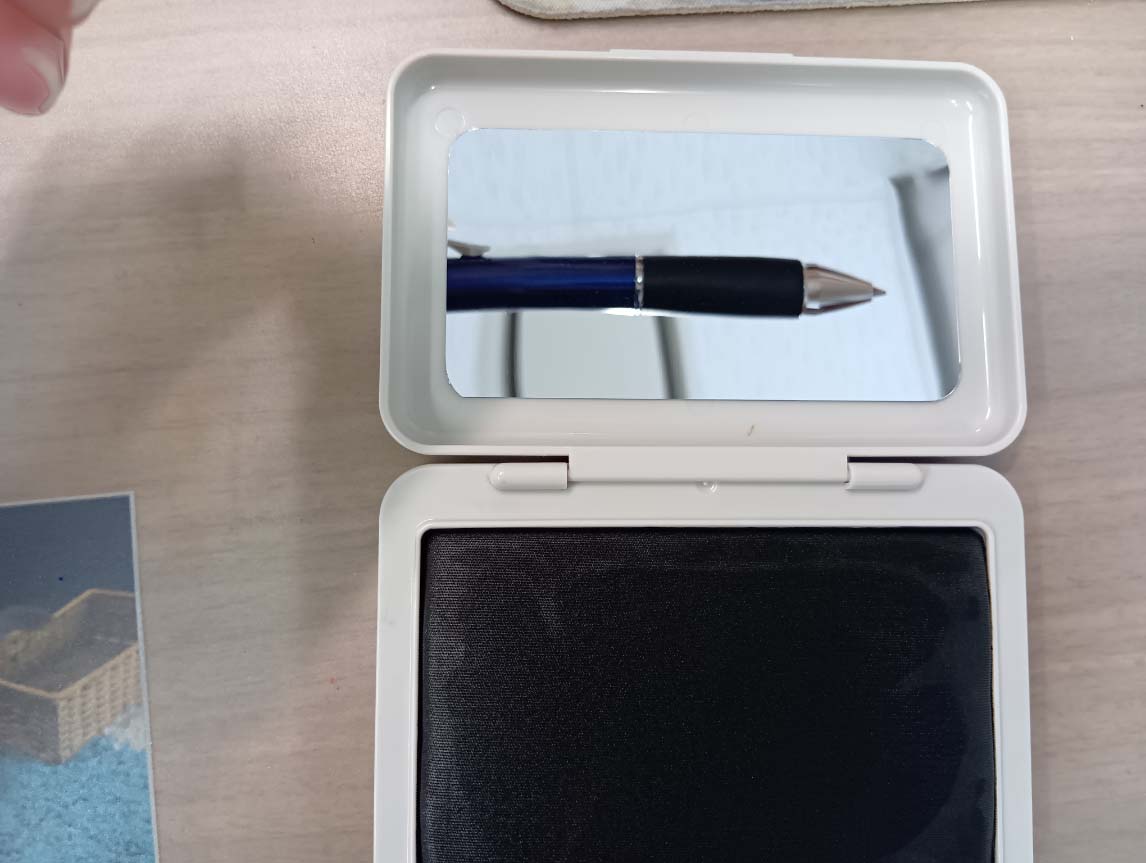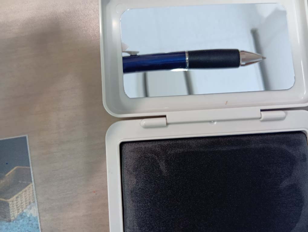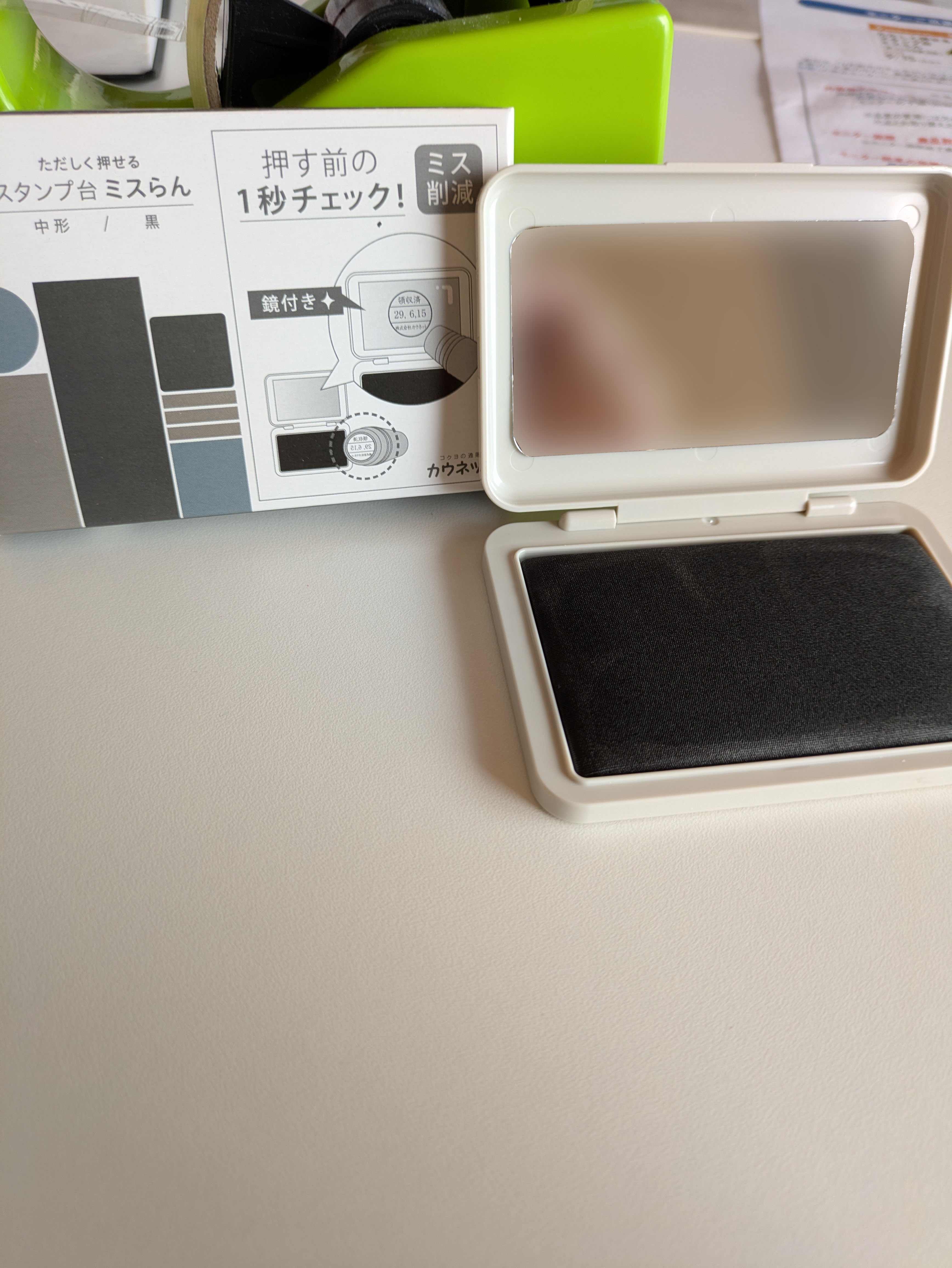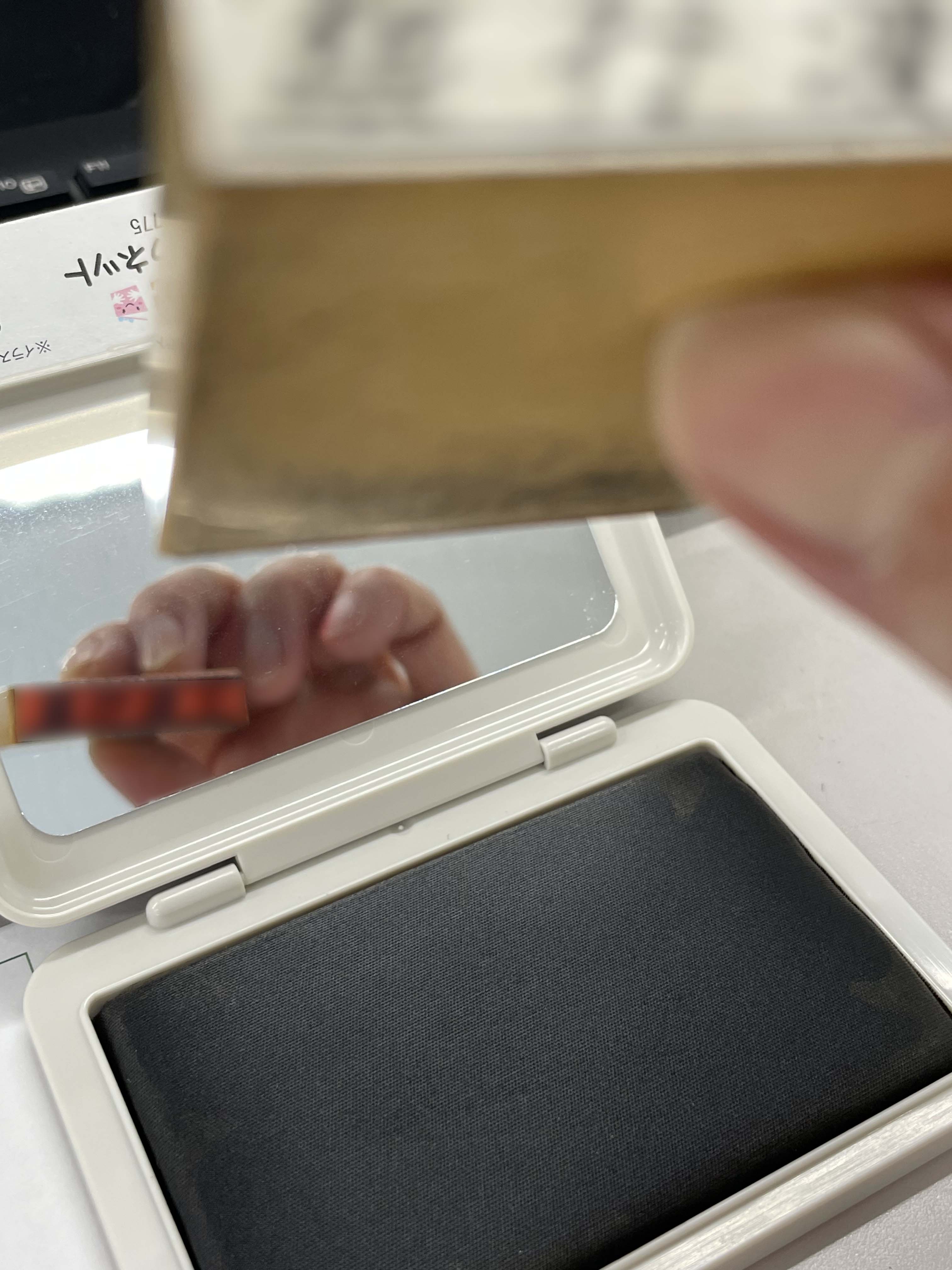 | スタンプ台のフタの部分に付いたミラーシートですが、日付印を押す時にはあまり使いませんでした。映り方がそれほどハッキリしていなかったのと、意識していないと映すのを忘れがちになっていました。押す前に映す癖付けが必要かもしれないと思いました。 |