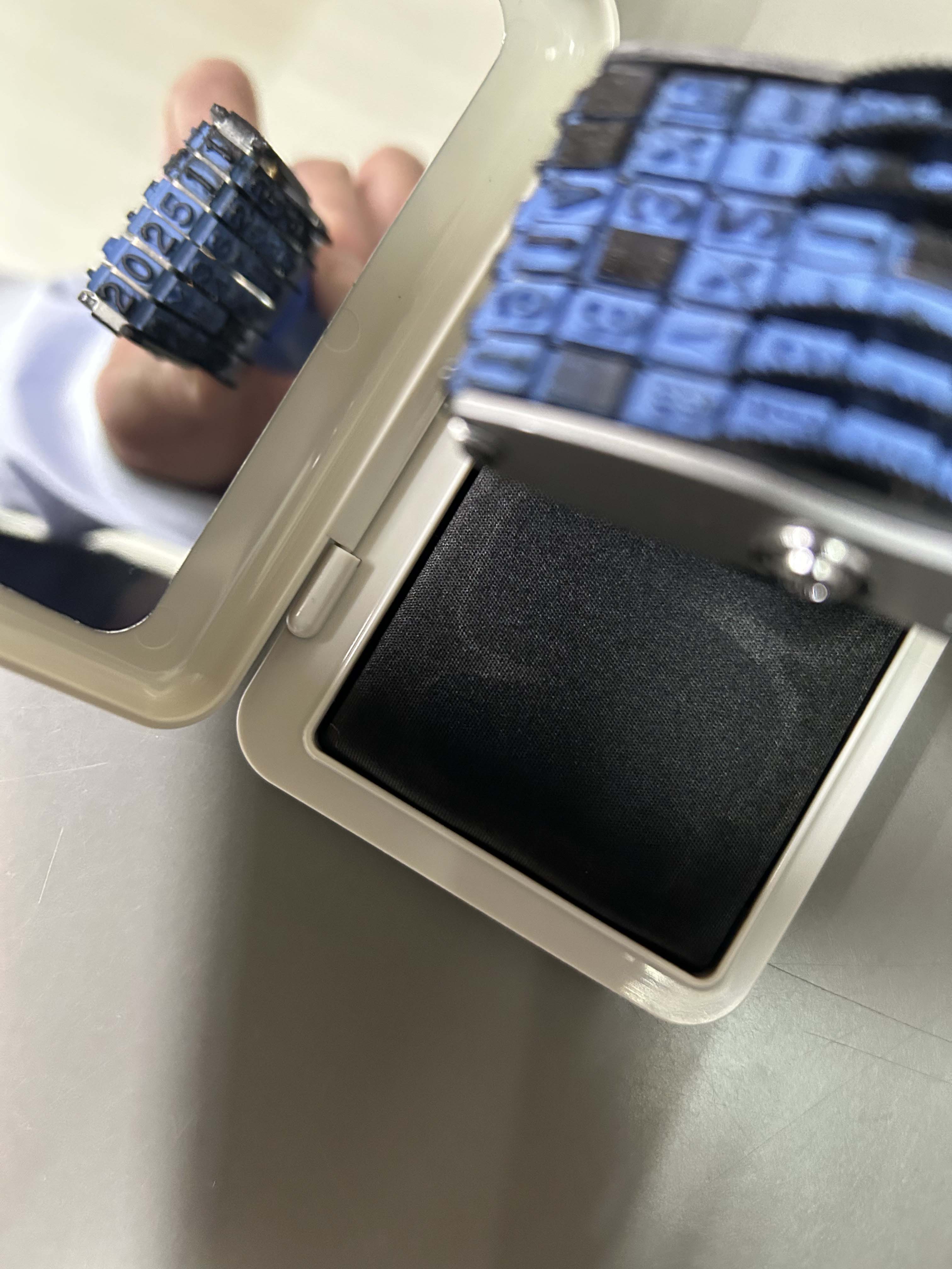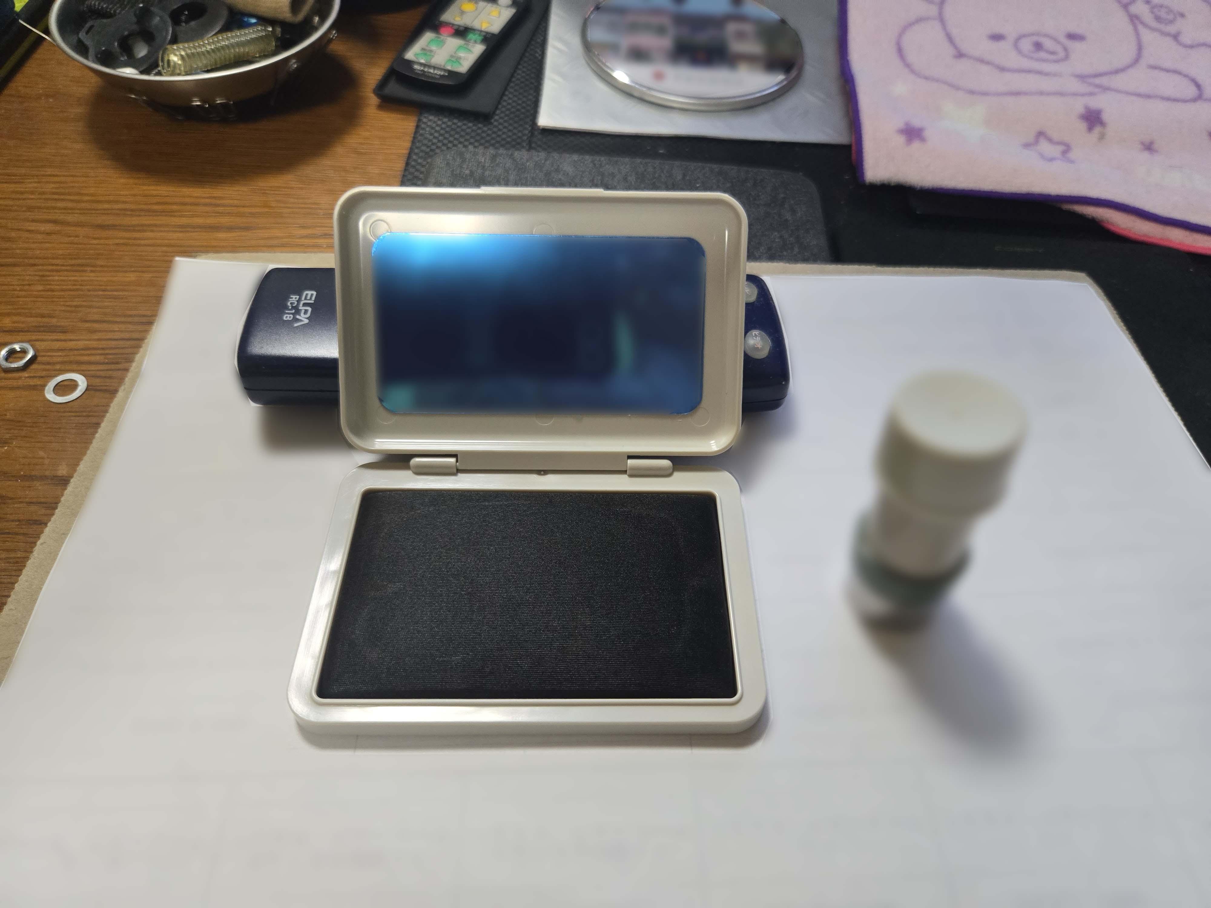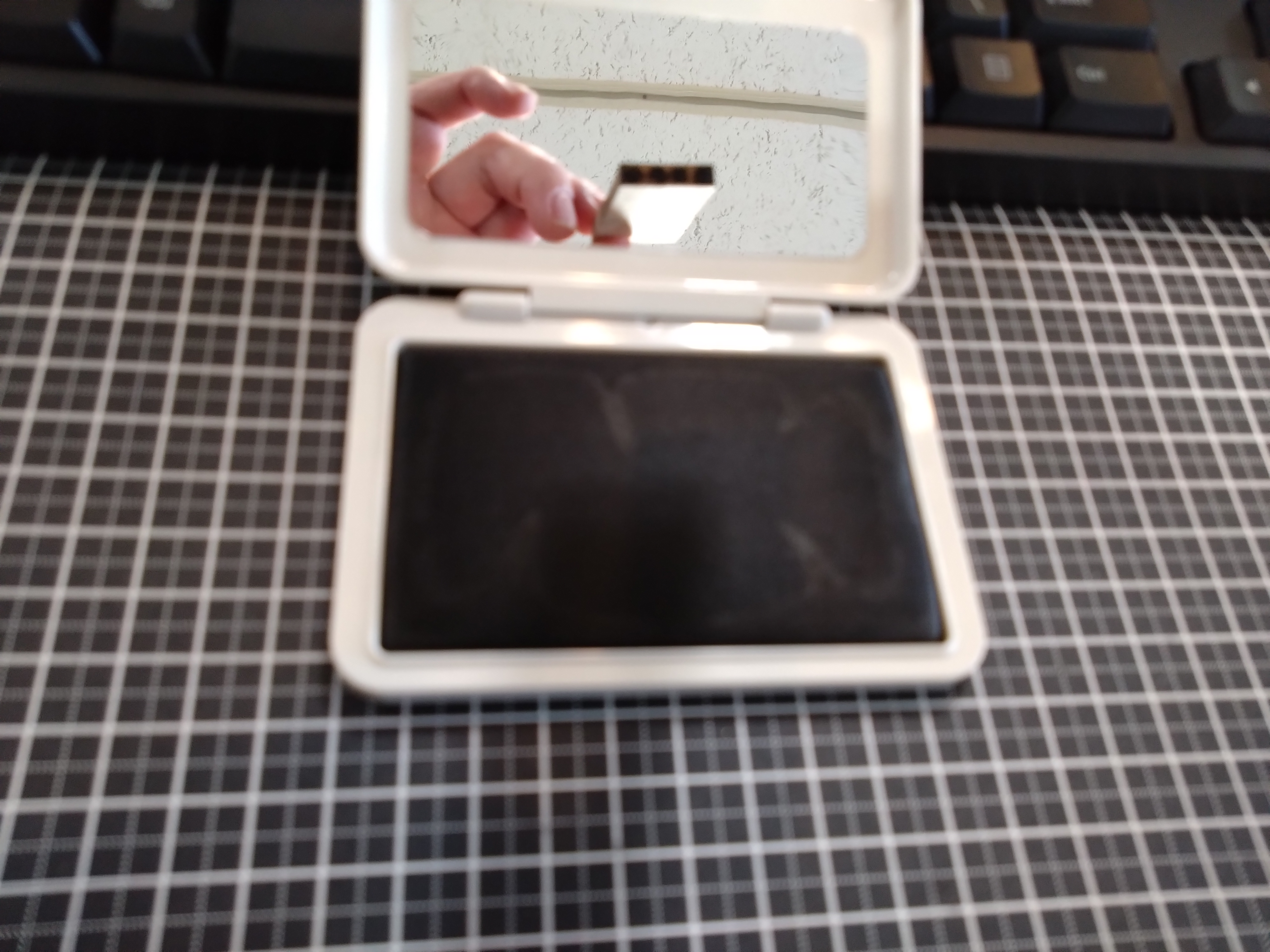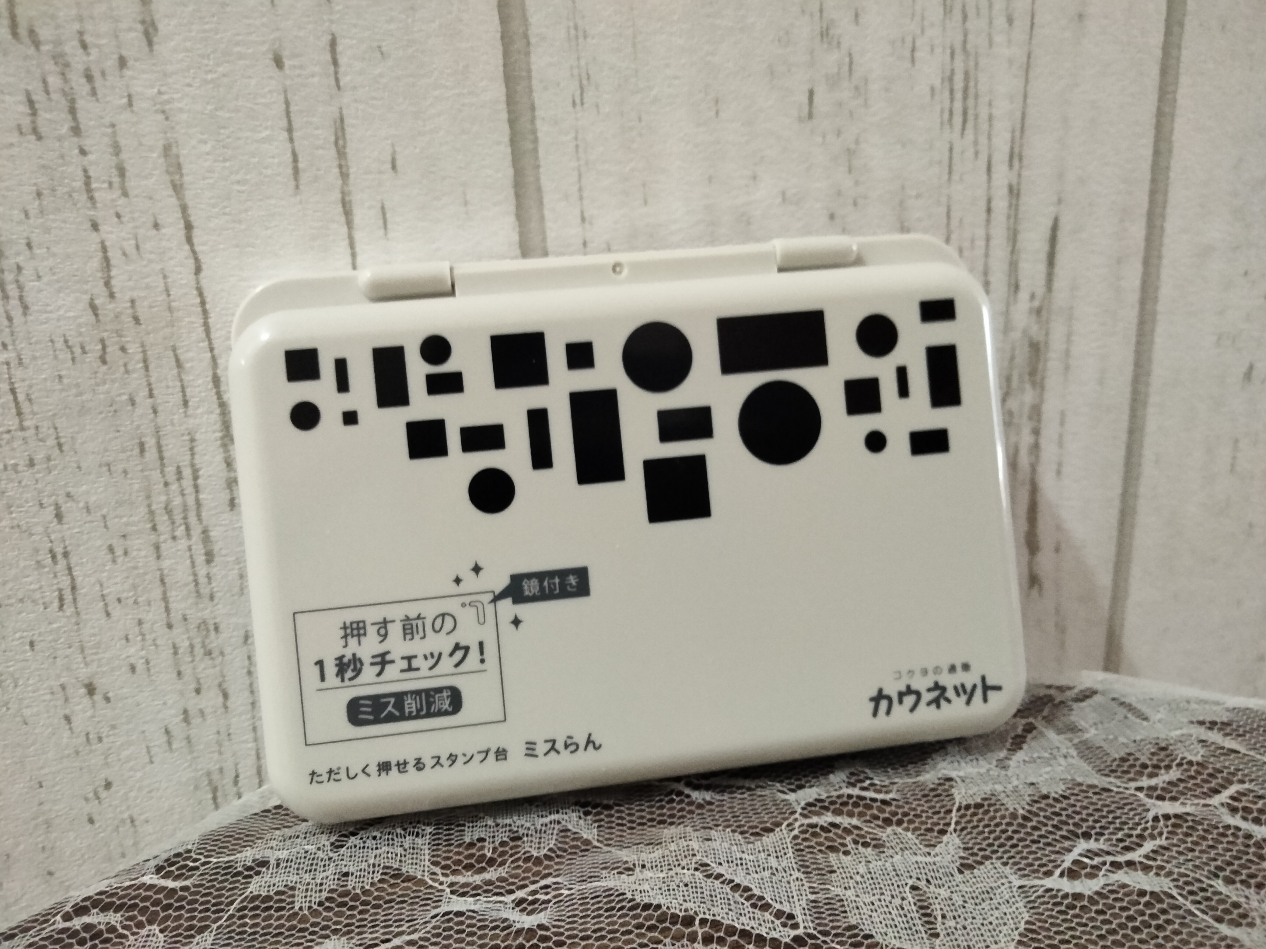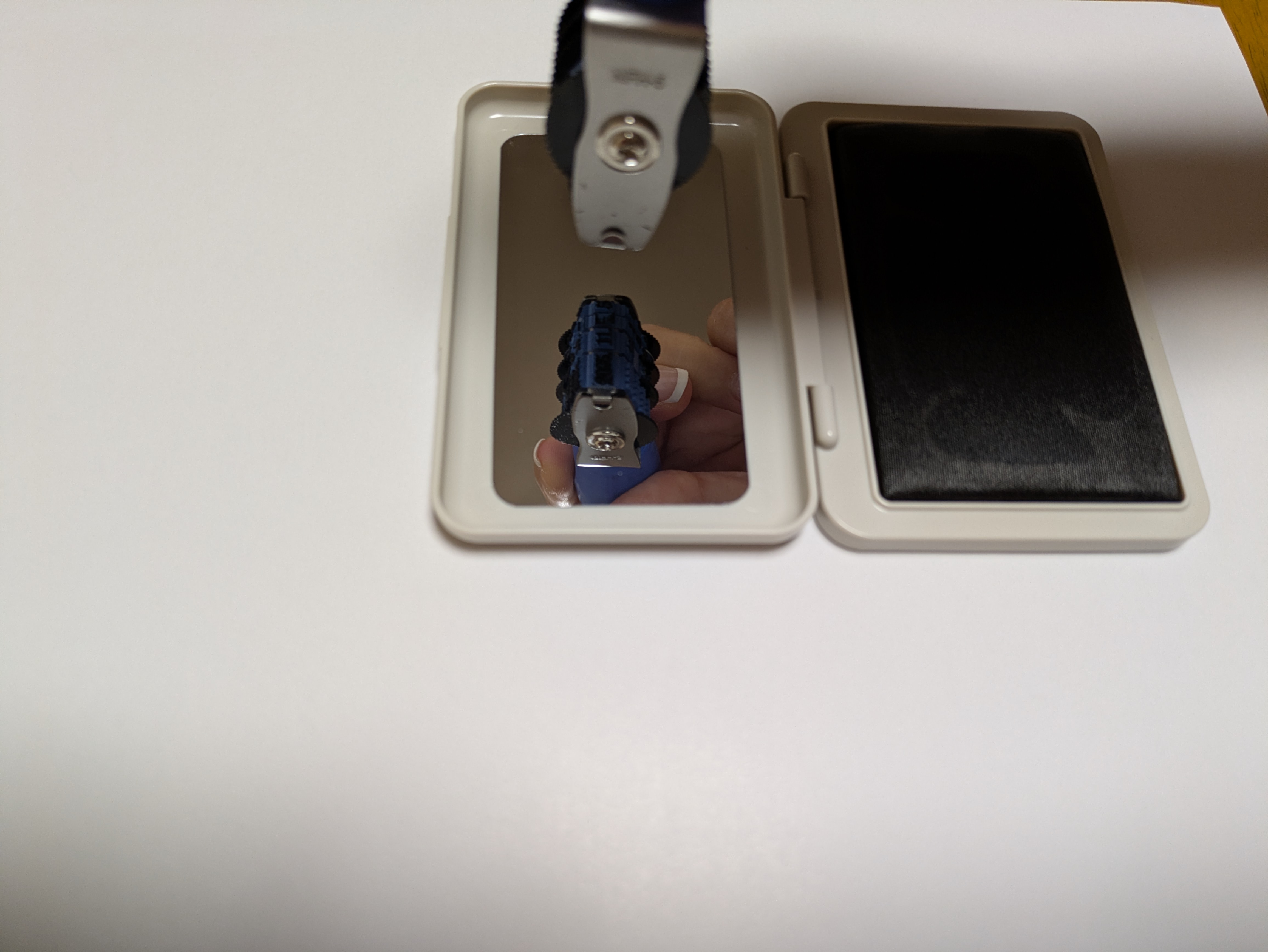 | スタンプ台のフタの部分に付いたミラーシートですが、日付印を押す時にはあまり使いませんでした。映り方がそれほどハッキリしていなかったのと、意識していないと映すのを忘れがちになっていました。押す前に映す癖付けが必要かもしれないと思いました。 |