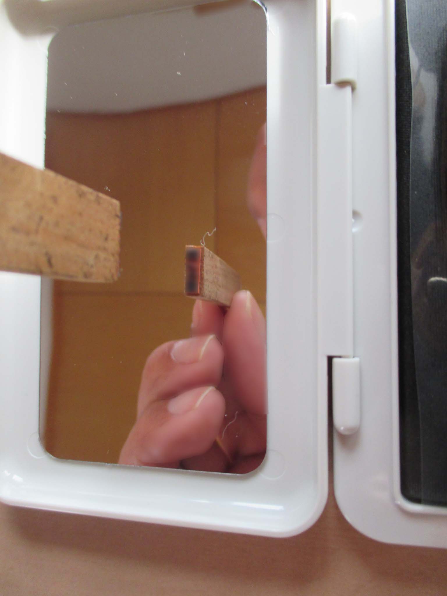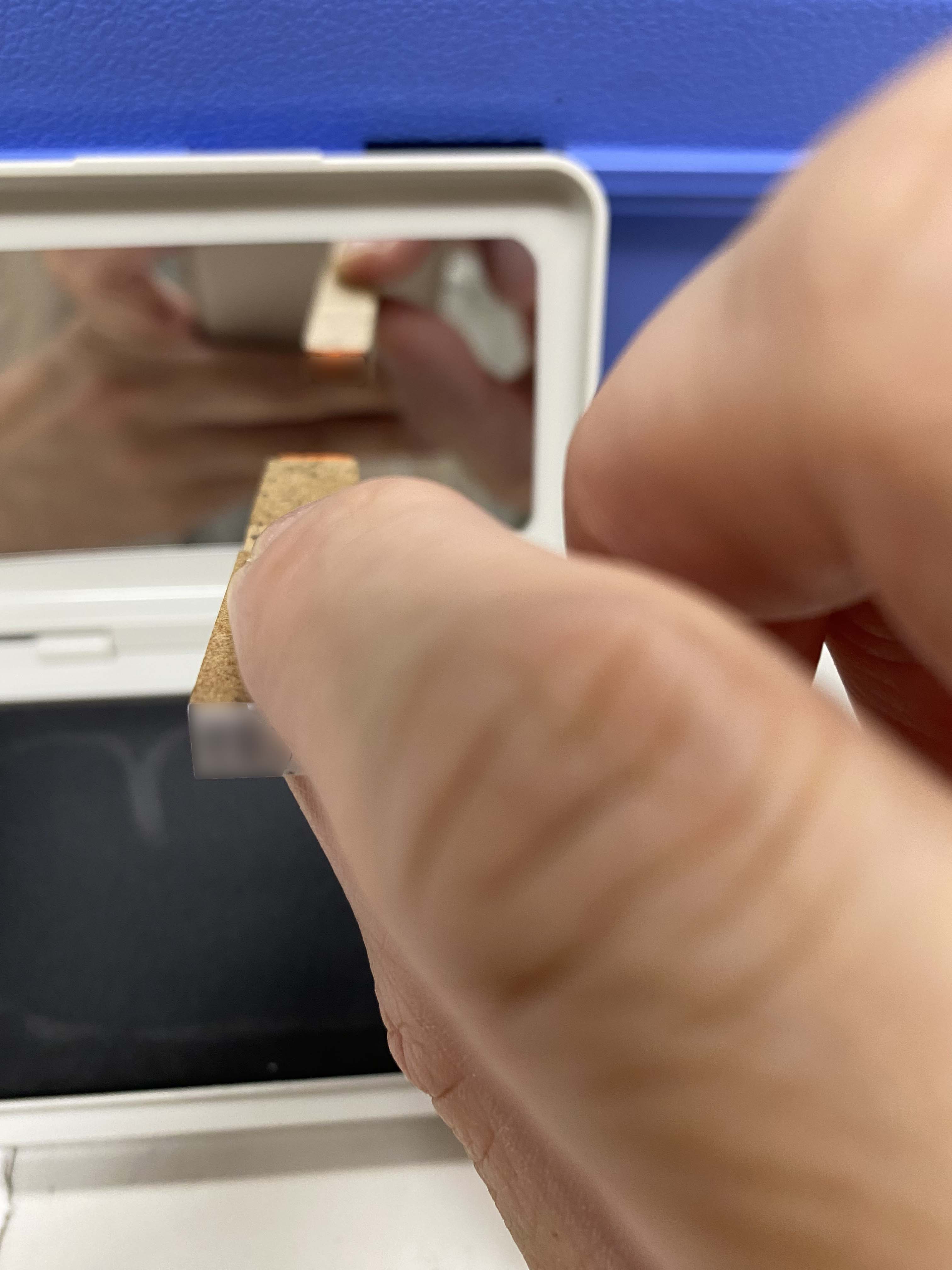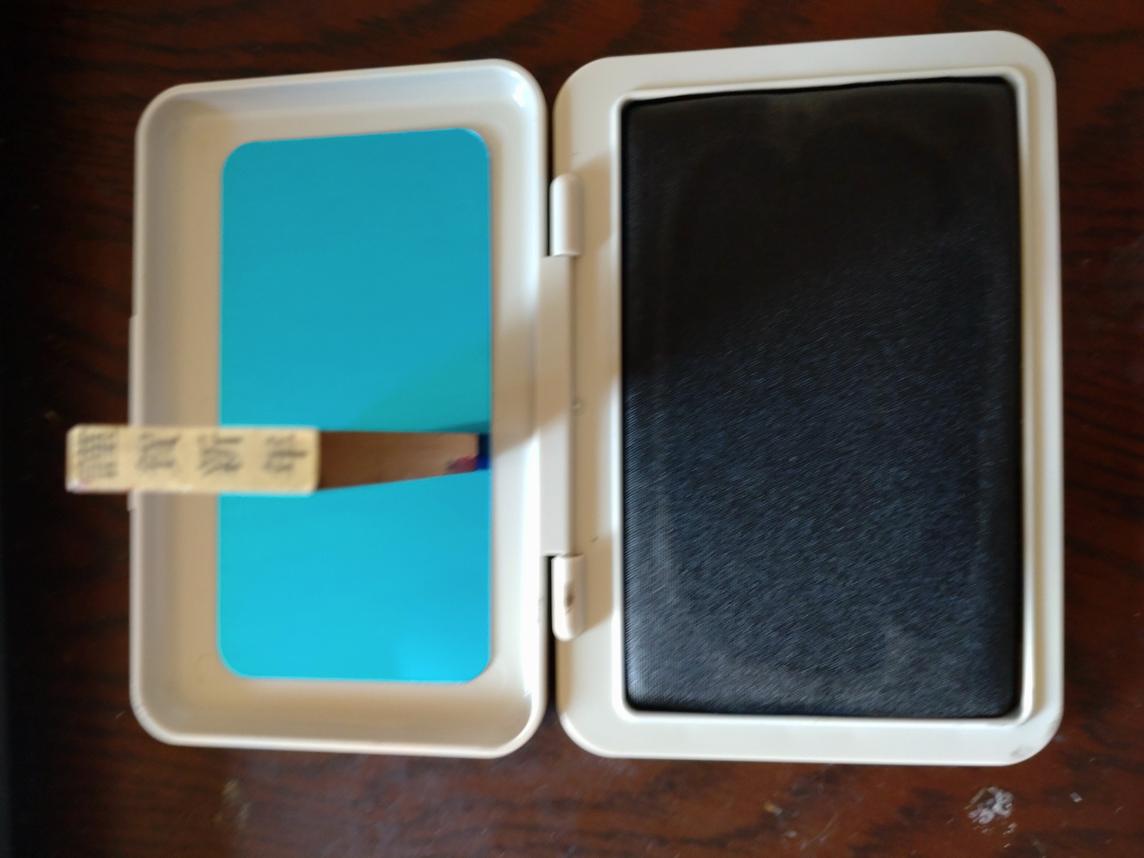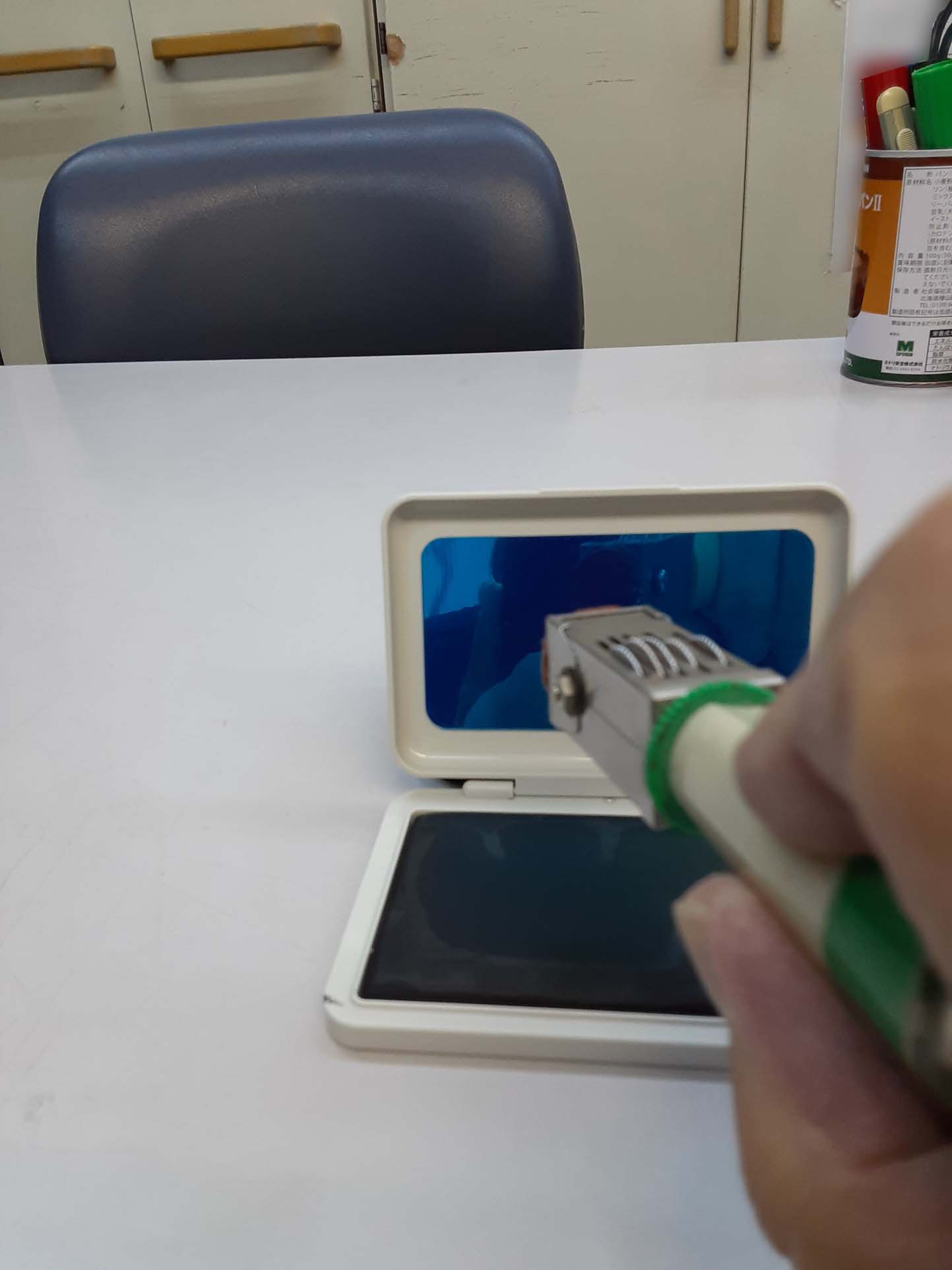 | スタンプ台のフタの部分に付いたミラーシートですが、日付印を押す時にはあまり使いませんでした。映り方がそれほどハッキリしていなかったのと、意識していないと映すのを忘れがちになっていました。押す前に映す癖付けが必要かもしれないと思いました。 |