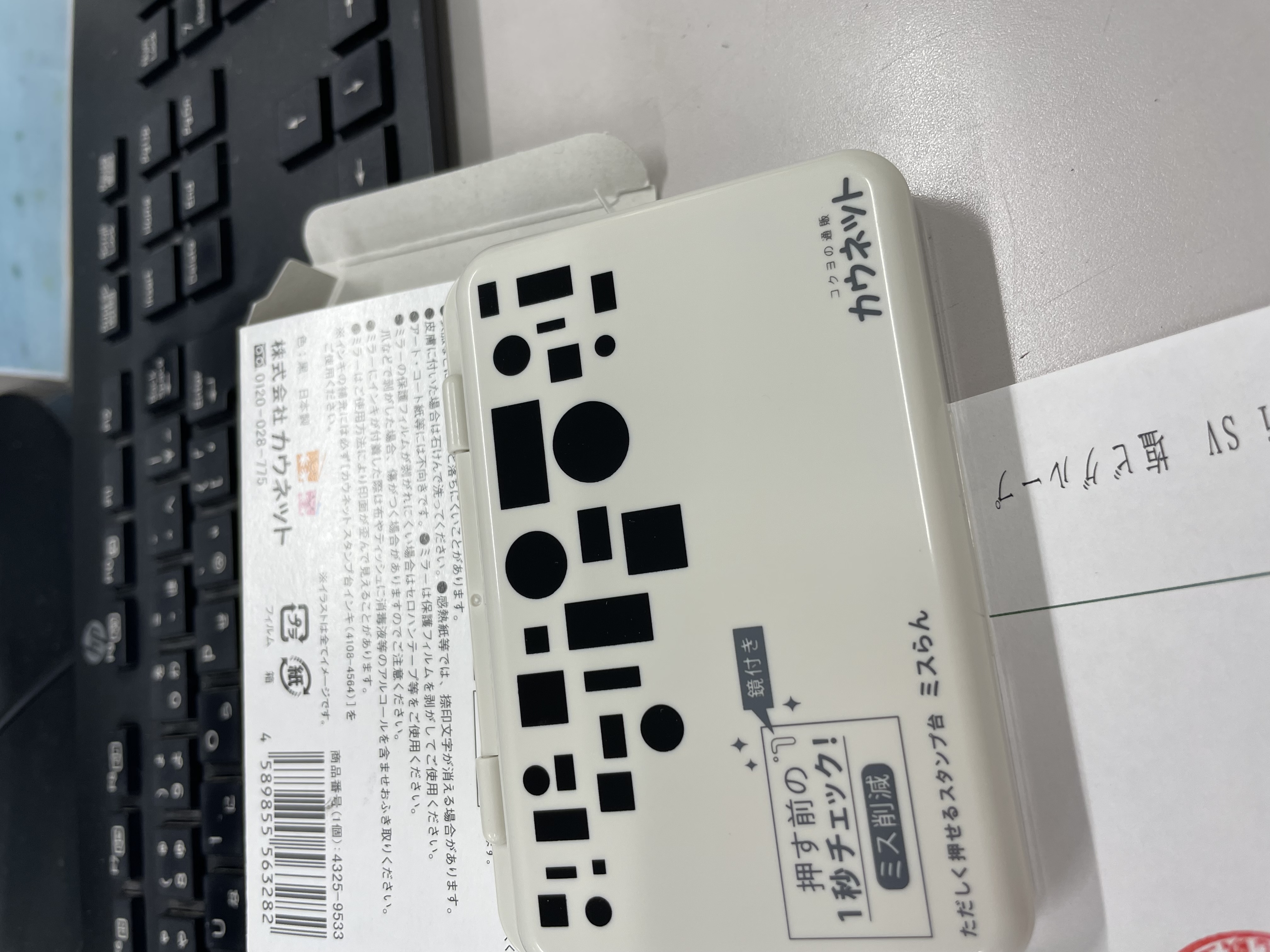 | ・今時のスタンプは押し間違えないように、方向合わせの印面シールが天へ貼ってあるので、ミラー要らない。 ・このミラーを使うとしたら、天に何も印がない昔の印鑑とか、手作り消しゴム判子とか? ・実のところ、ミラーがあると、スマホに自分の顔が映ってゲンナリする気分に近いものがある… ・裏面の滑り止めシールは普通に要るものなで、最初から貼ってあるといいのに。 ・でも、ユーザーが自分でシールを貼る分、単価が下がっているのなら、いっそそれを逆手に「自分で貼って!」と安価を売りにすればよいかも。(だったらミラーも外して、もっと値段を下げてもよいのでは) ・一番便利に感じたのは、裏面の「補充インキについて」のシール。こーゆー心遣いはすごく嬉しい。 ・パッドの押し心地は、なかなか良いです。 ・黒の顔料インクの発色、乾き具合も、悪くない。 |