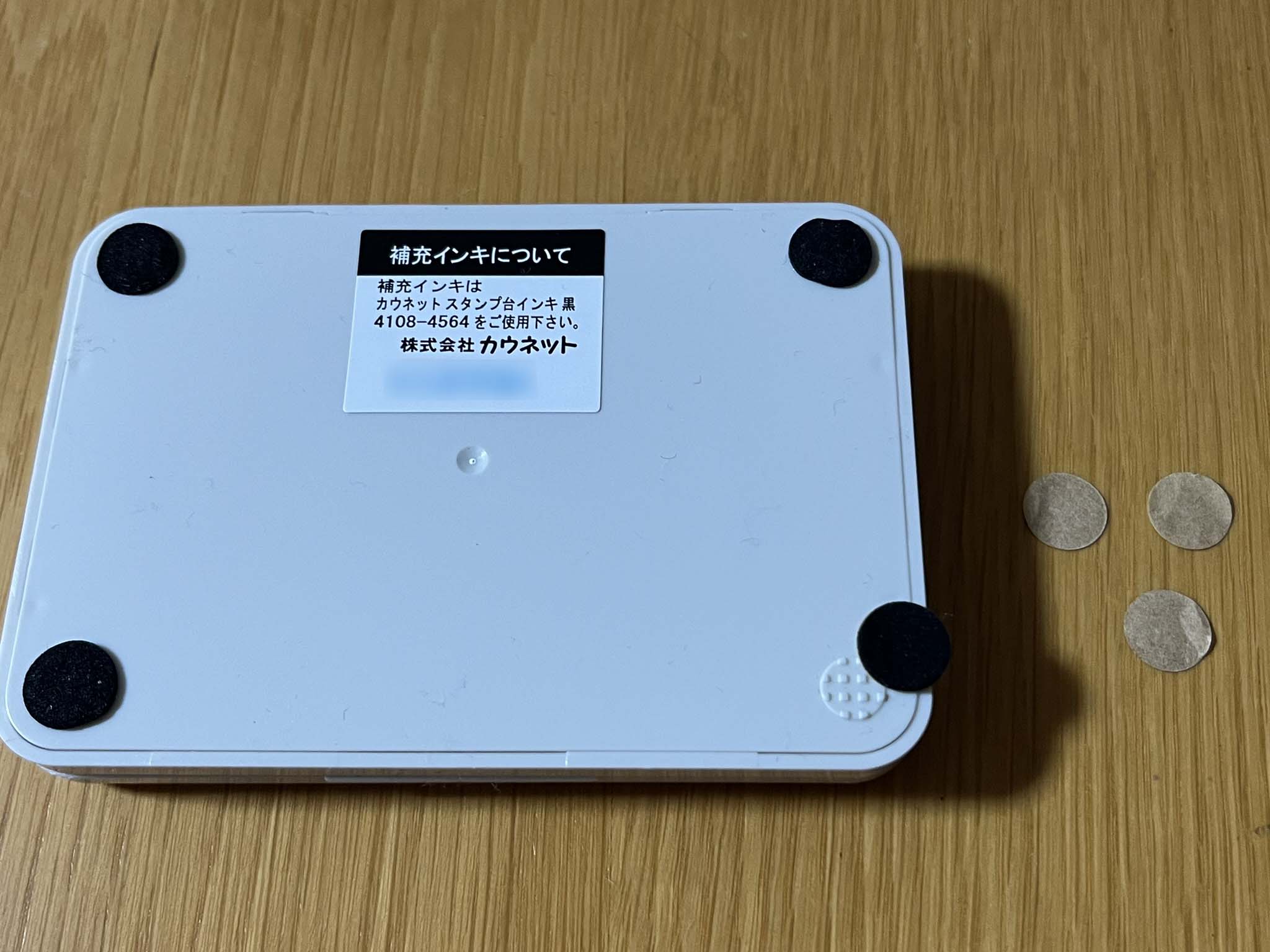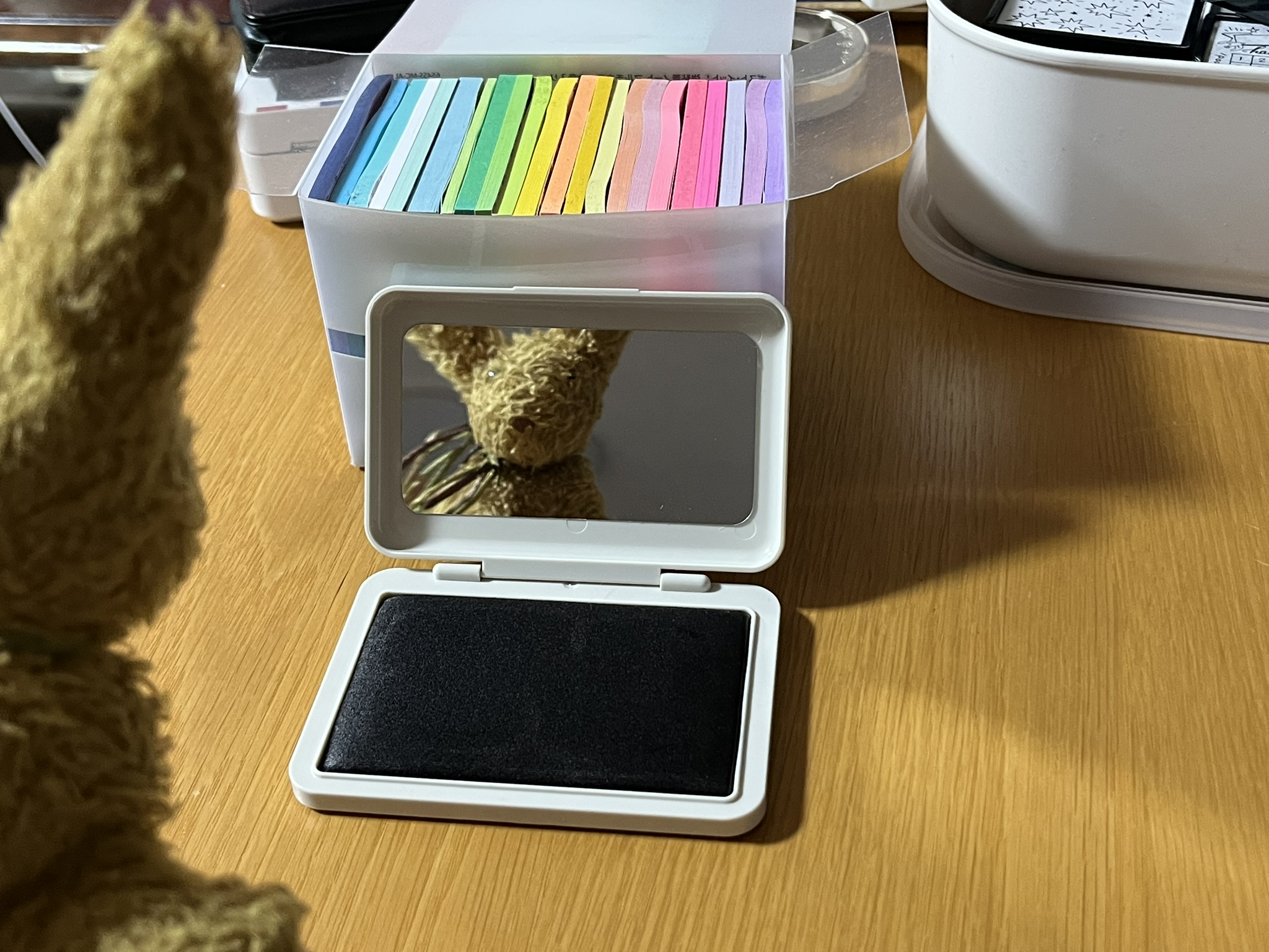 | スタンプ台の裏面に付属品のテープを張るとスタンプ台の安定感がある。鏡も押し間違えの確認になる。いいですよ。 |