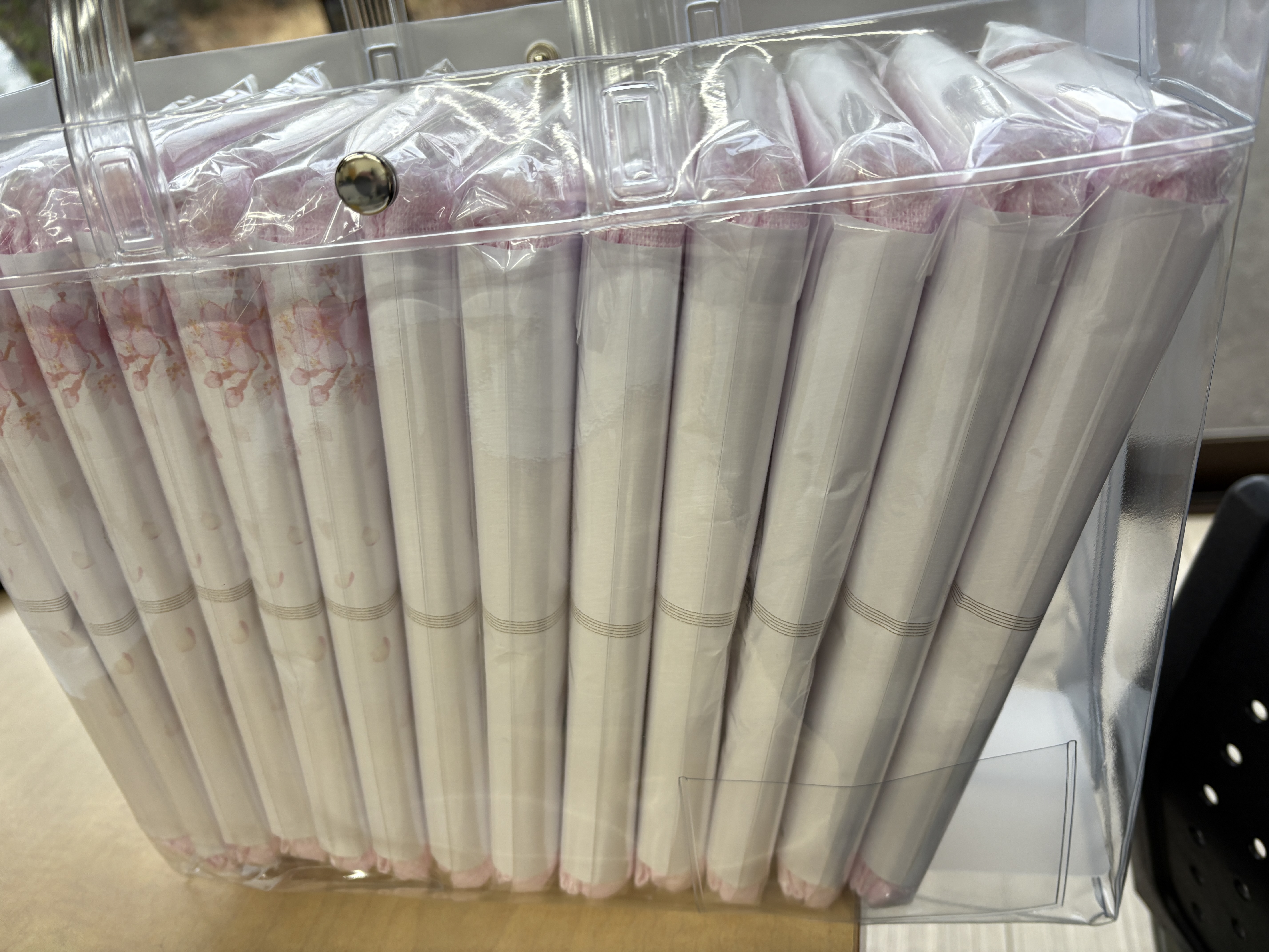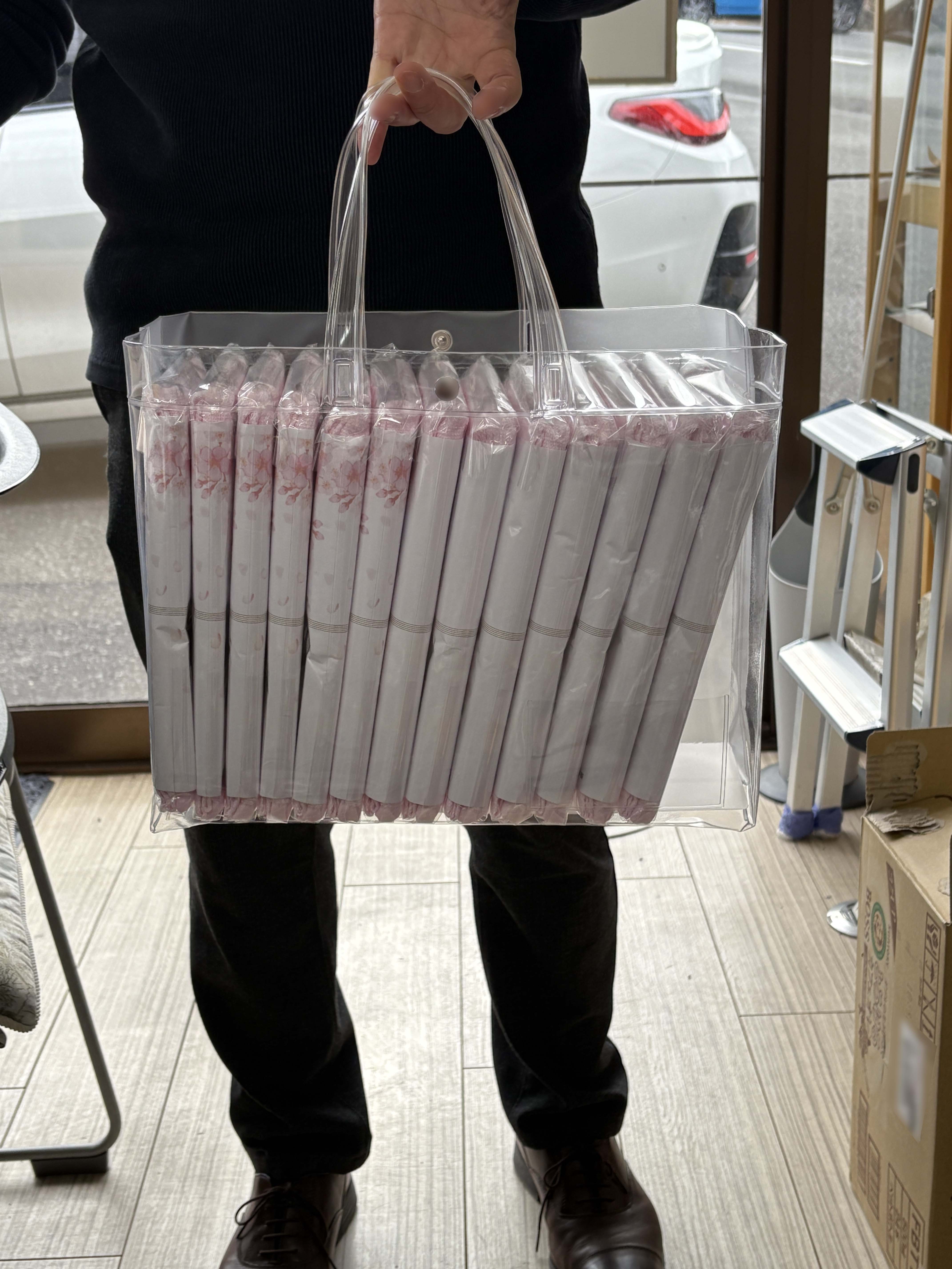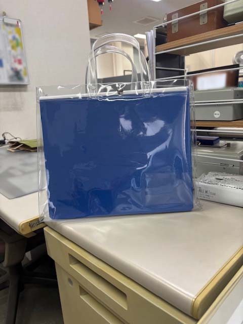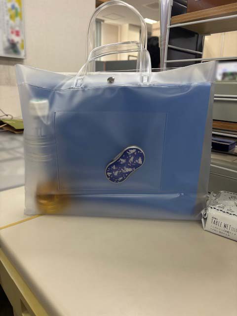 | 大きな会社ですとバックをロッカーに入れて社内ではシースルーバックを持ちますが弊社は小さな会社ですのでタオルを入れて販促に使用しております。 |