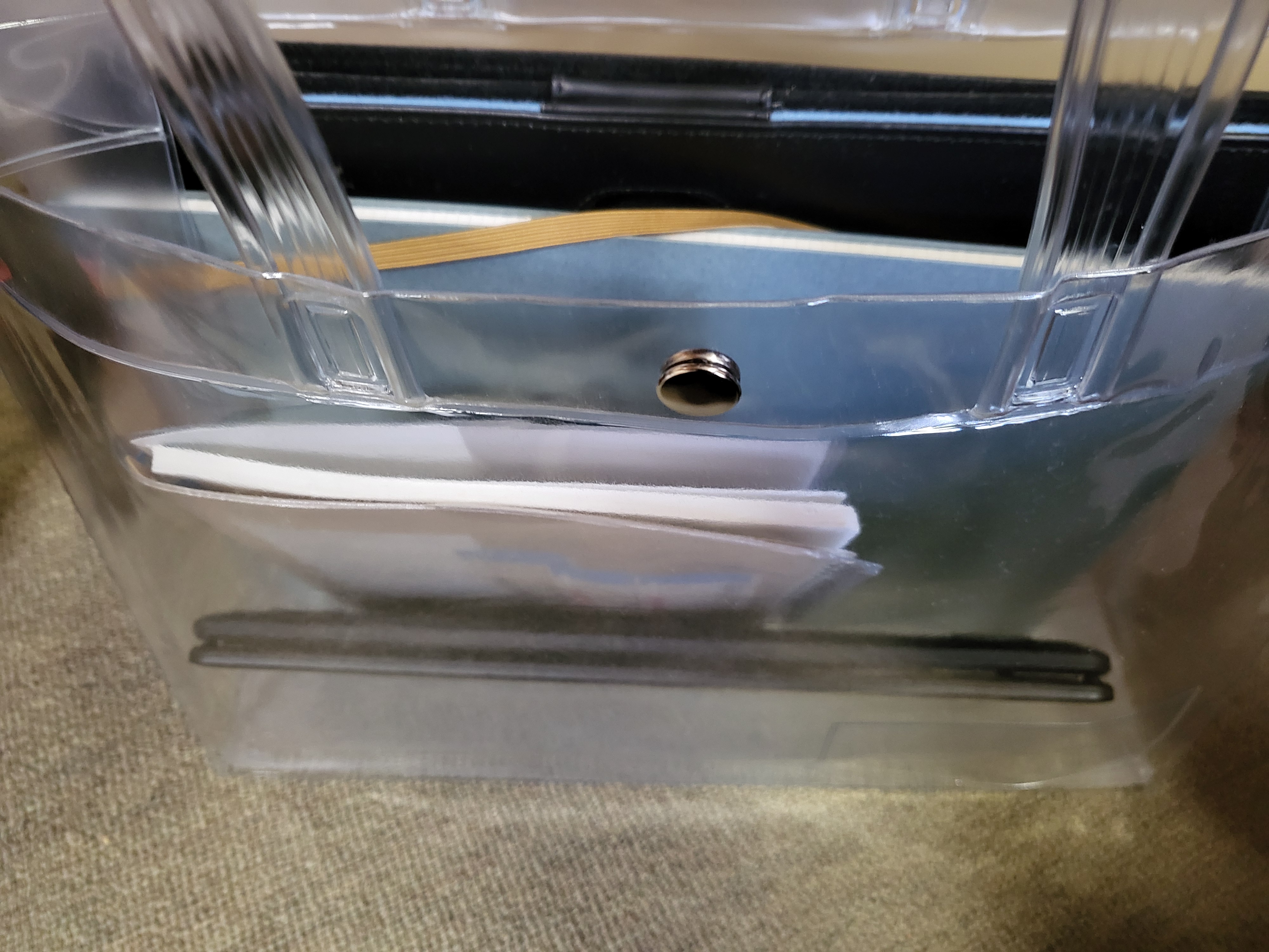 | A4ファイルが丁度入るので、会議室に移動して会議の時に資料を入れています。結構入り、中身が見えるので忘れもののチェックがしやすいです。半透明側は中身がぼんやりとしか見えないので、ちょうどいい塩梅です。 |