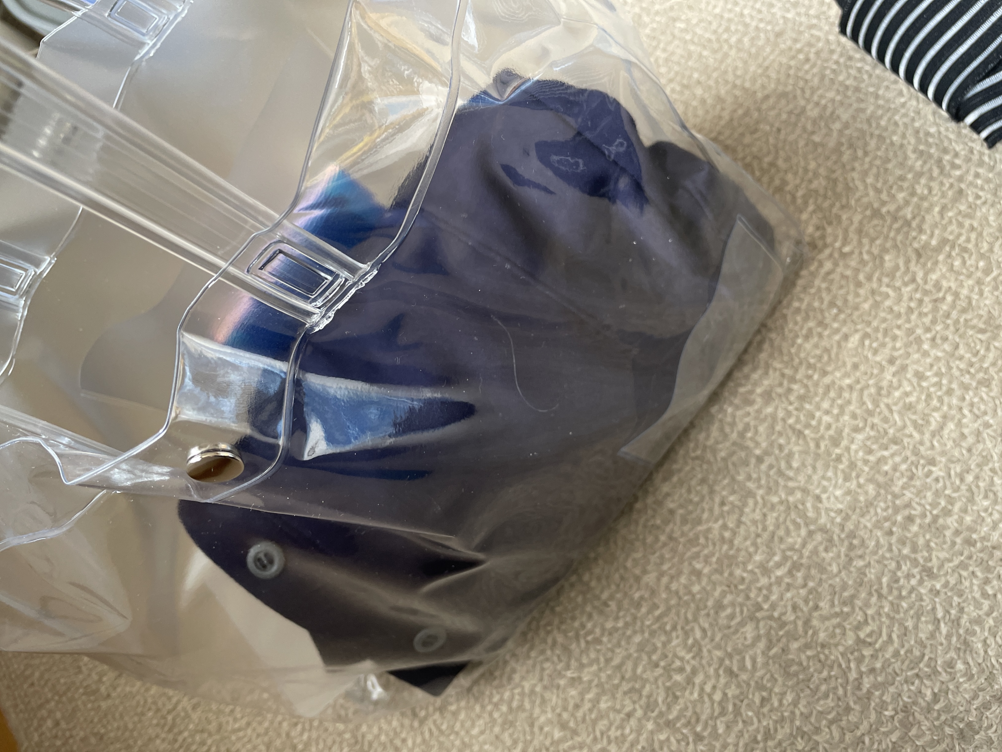 | 小学生の時に使用したプールバッグのような感じでとても軽いです。ちょっと中身が見えすぎる気がします。中身透け透けじゃない方がいいかも。 |
