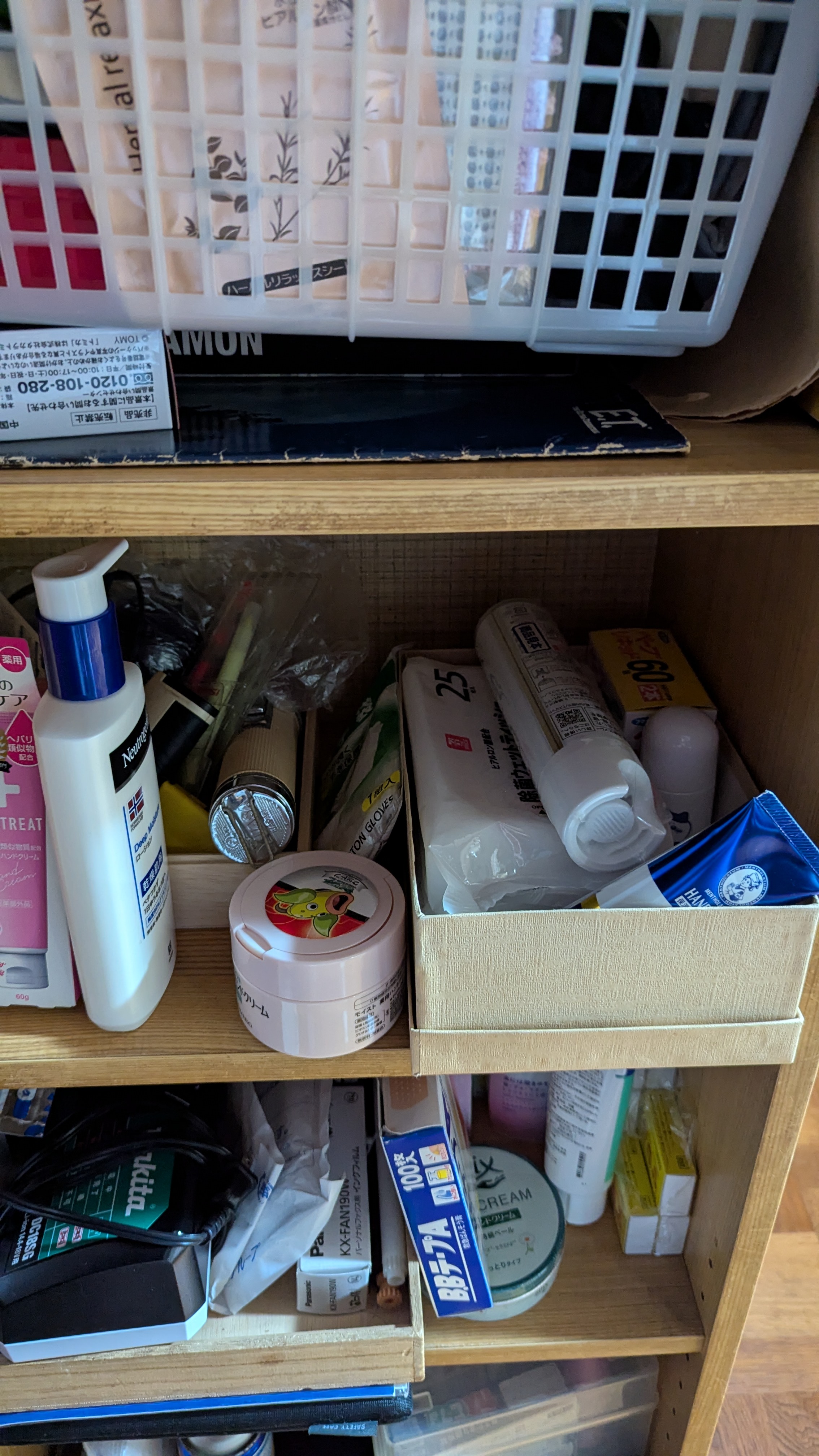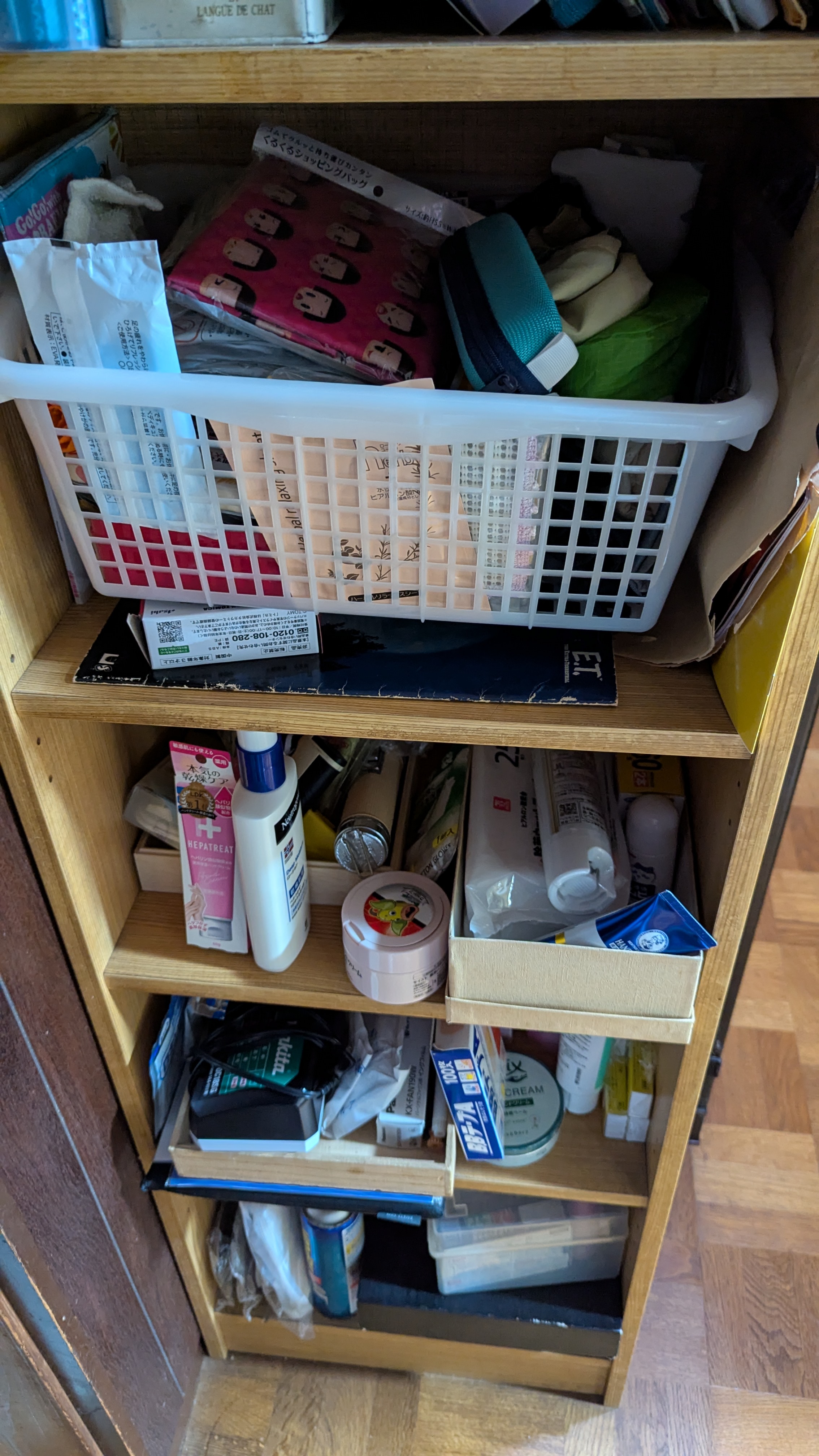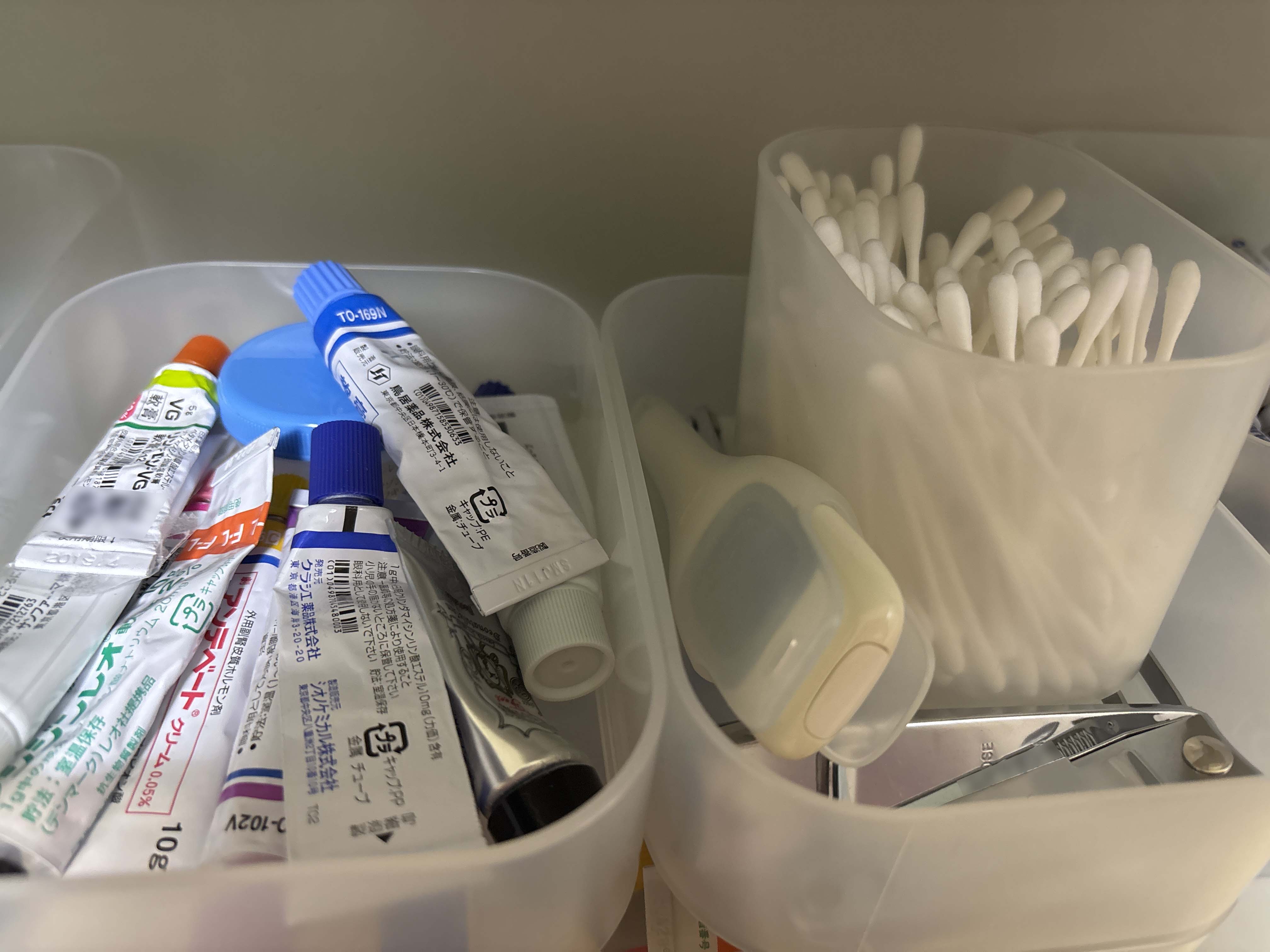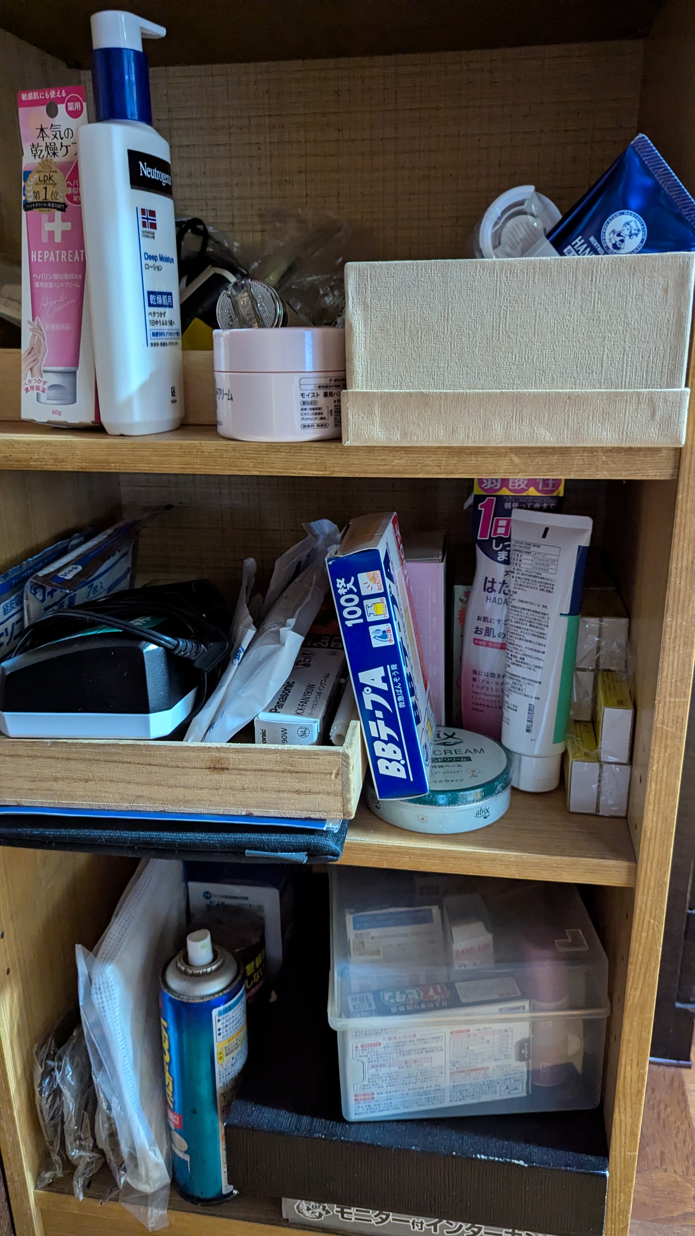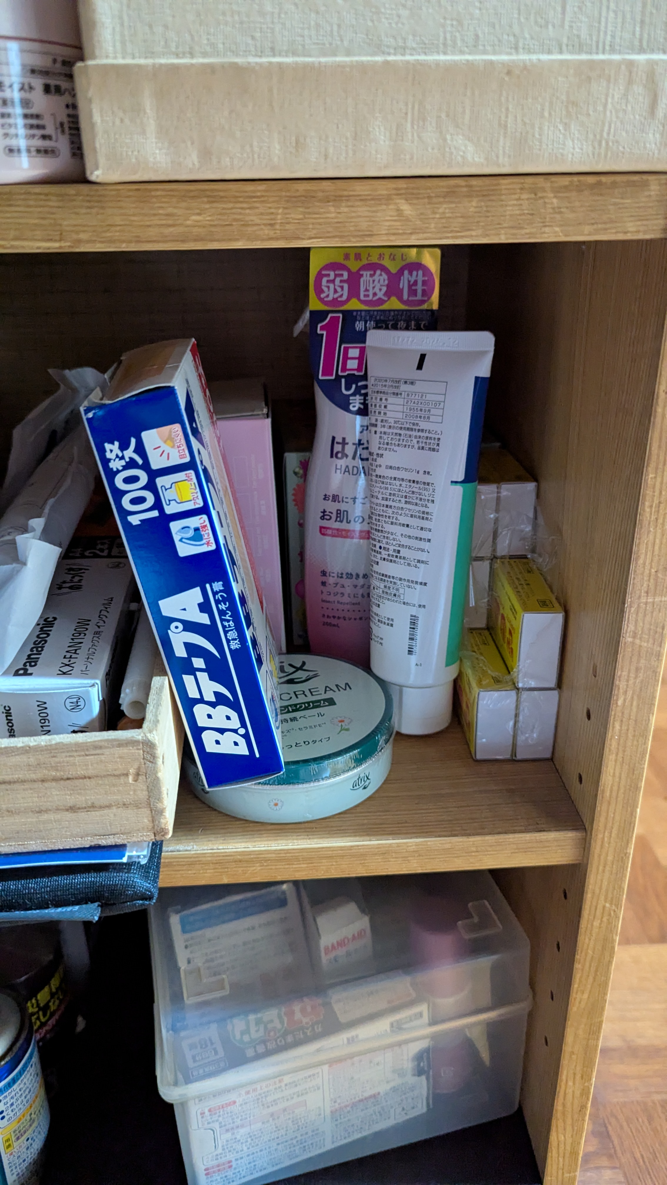 | 湿布や冷えピタ、保湿クリームなどを置いております。棚の下3段を専用の置き場にしております。虫避けや使い捨てカイロなどが、かさばります。 |