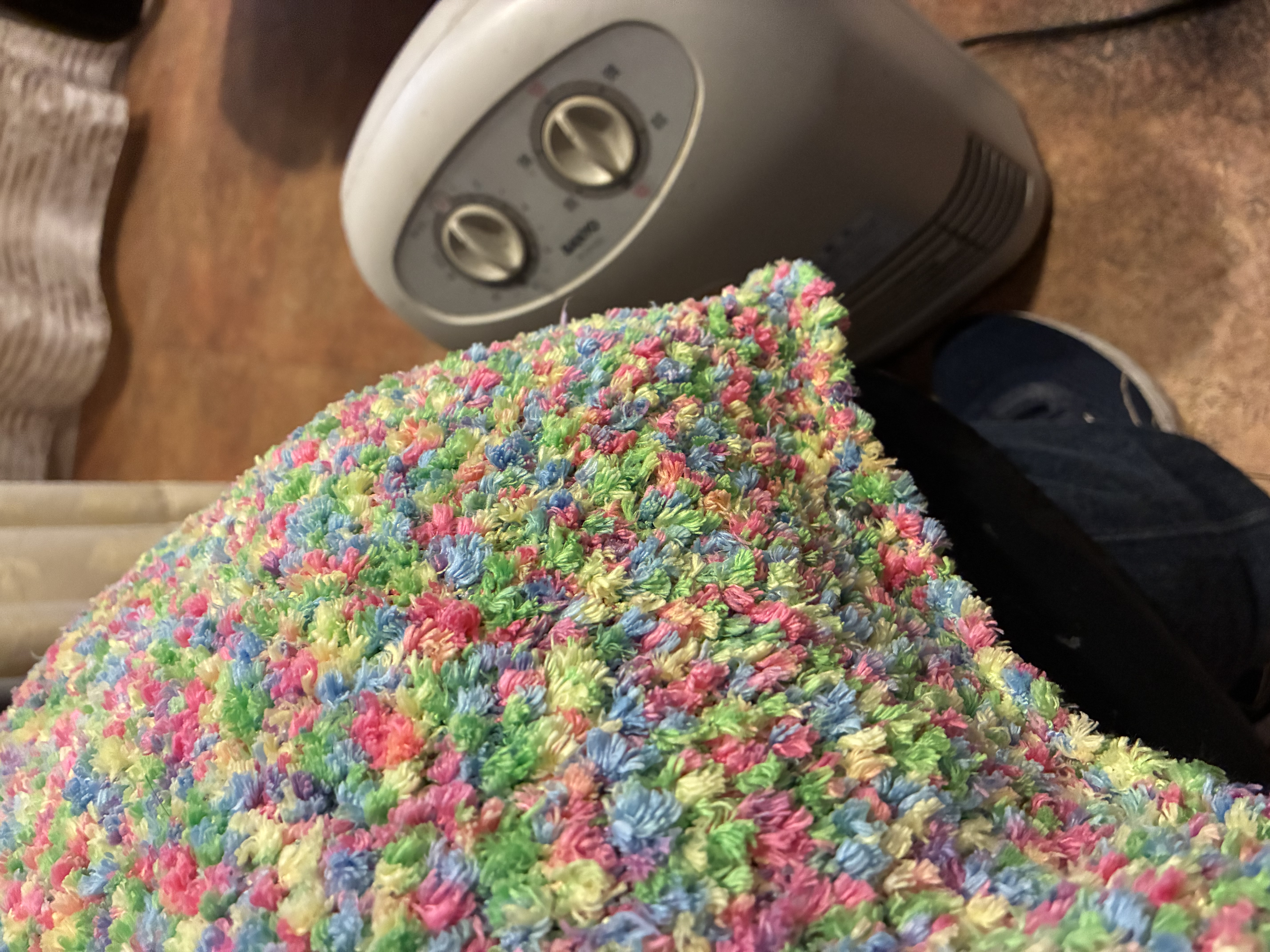 | ひざかけをして足元ヒーターをつけると、こたつのような温かさで1日中かかせません。 |