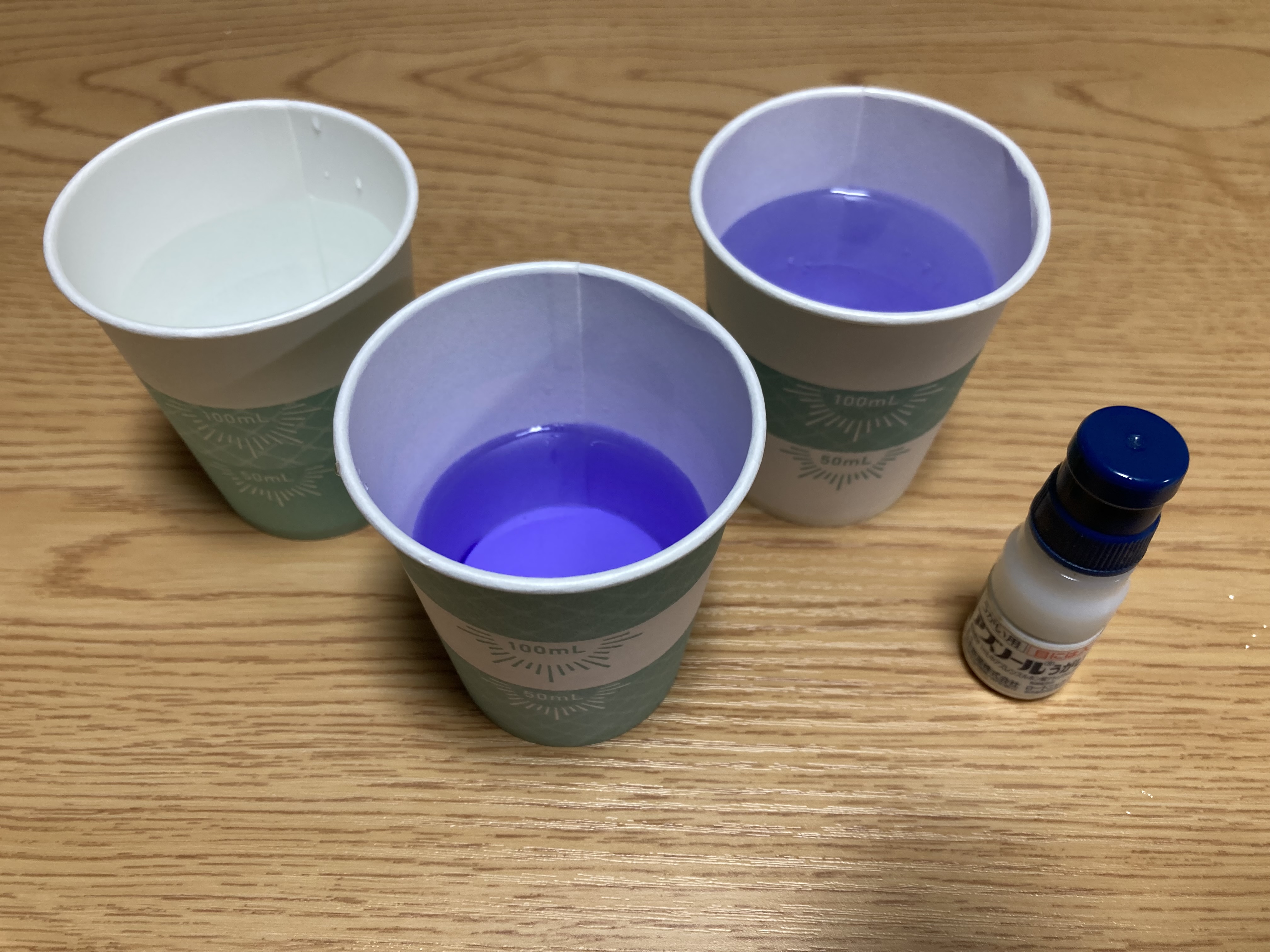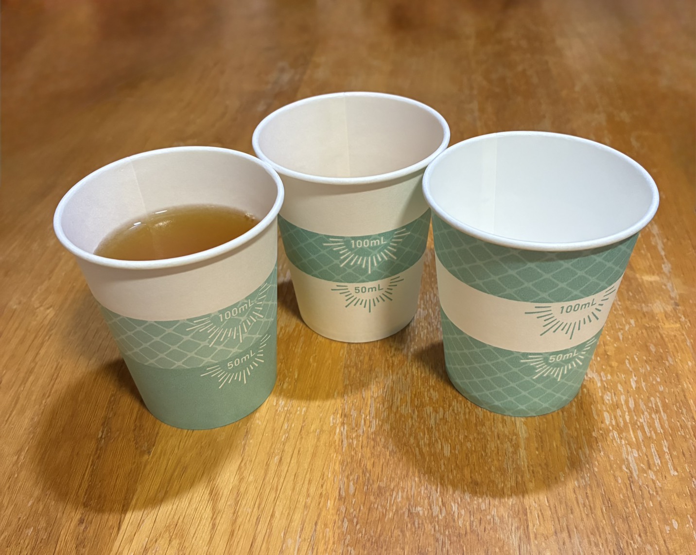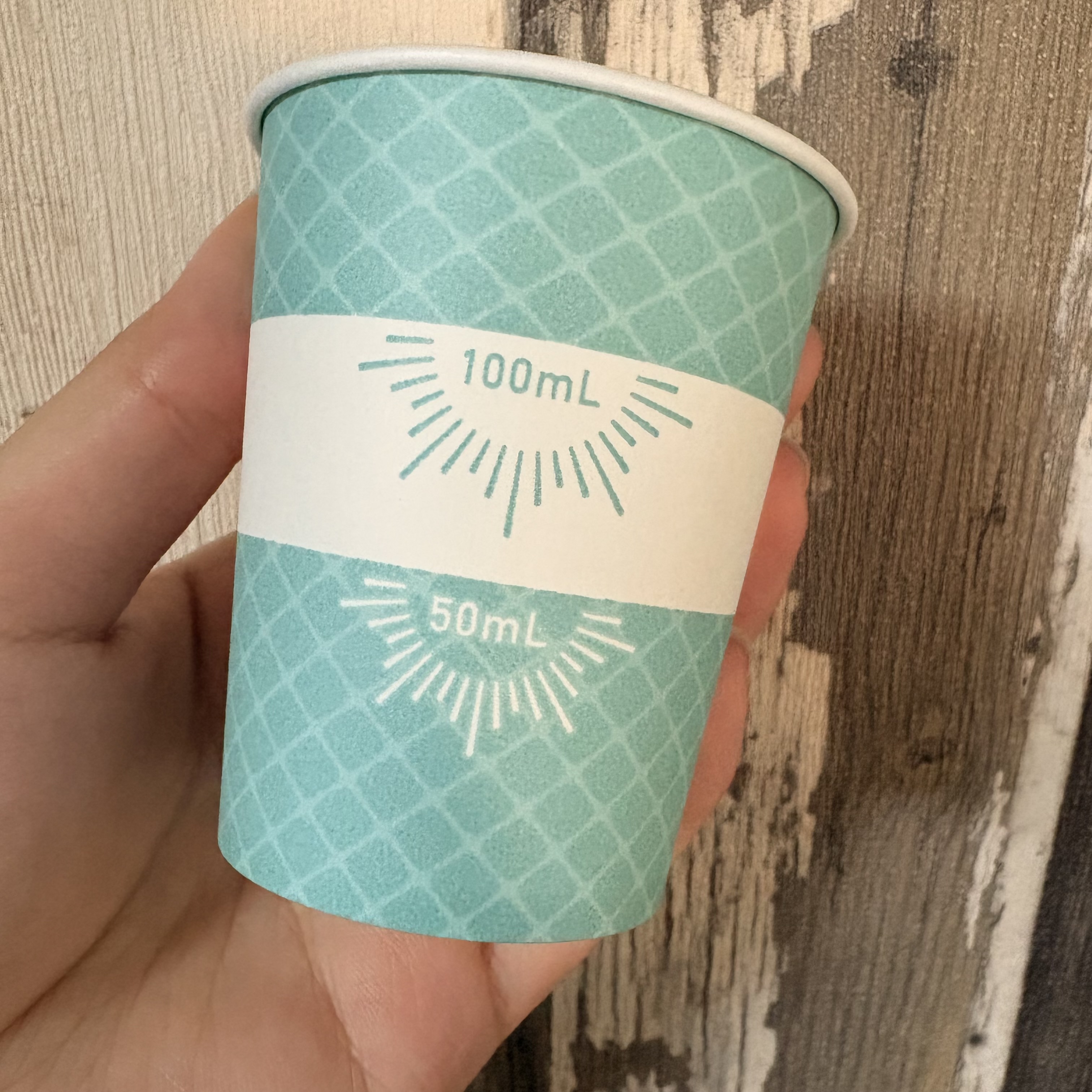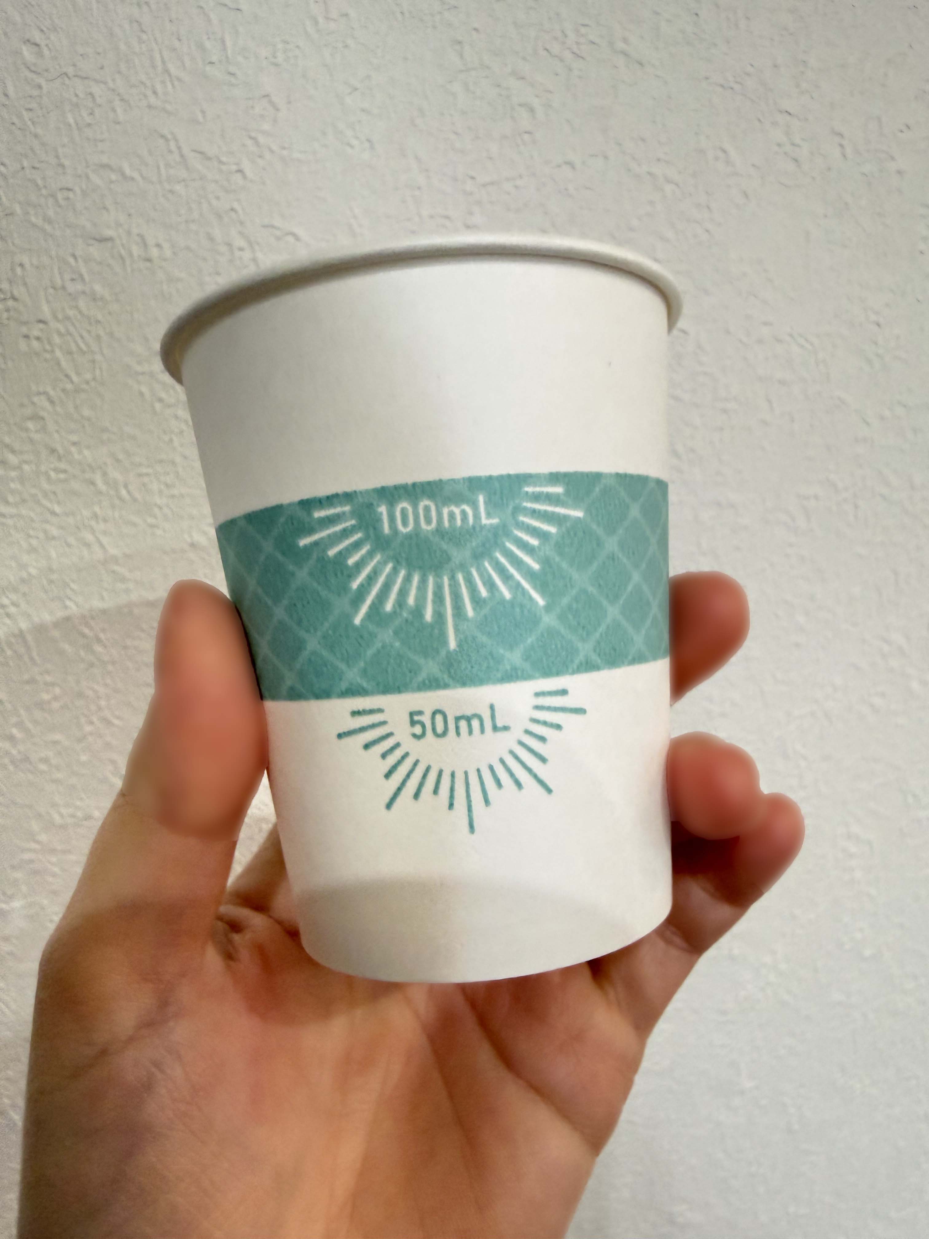 | 初め気づきませんでしたが、紙コップ3パターン入っていました。メモリの代わりに帯状のラインで分量をわかるようにしていてデザインは良いと思います。照明の明るいところだと紙コップの内側からうっすら先ほどのラインが裏うつりするので、ここのラインだから50かとか100かと判断できますが、照明が少し暗めのところだとそれができないのでちゃんと分量を見ようとすると一度平たいところに置いてコップの外のメモリをみて内側から覗く感じになるのでかえって時間がかかってしまう気もしました。3つのデザインの中で1番計量しやすかったものは真ん中に白いライン、上下が緑のチェックのものでした。うがいとなるとうがい薬の濃度はそこまで神経質にはかってませんでしたが、医療機関や飲食店の配置されるようなイメージであれば、外側の見た目かわいいデザインより内側にラインか点や線で50.100なら目印がついてから方が使いやすいと感じました。個人的にはうがい用よりも企業などでサンプリングする場合が使い勝手が良さそうな気がしました。 |