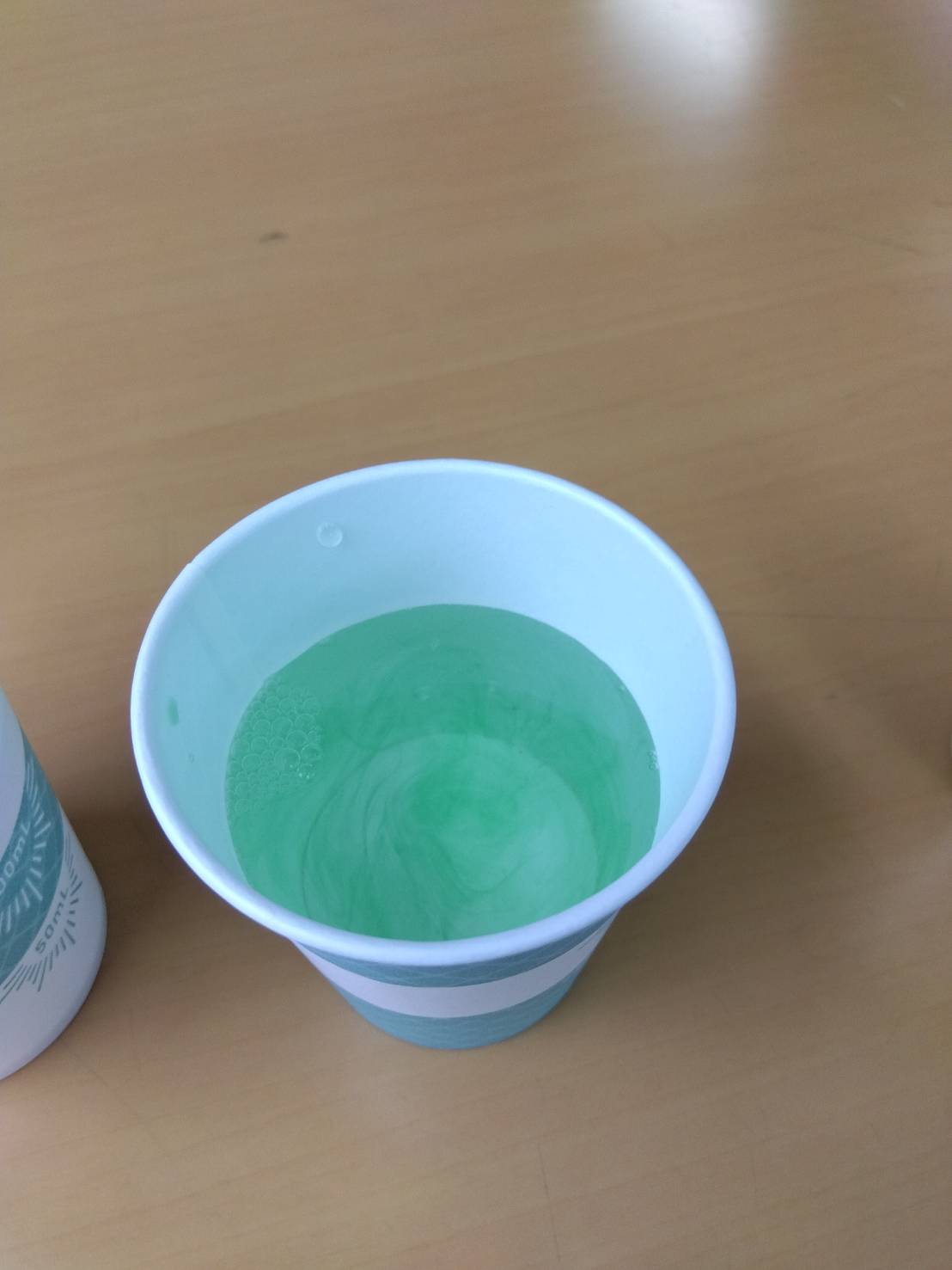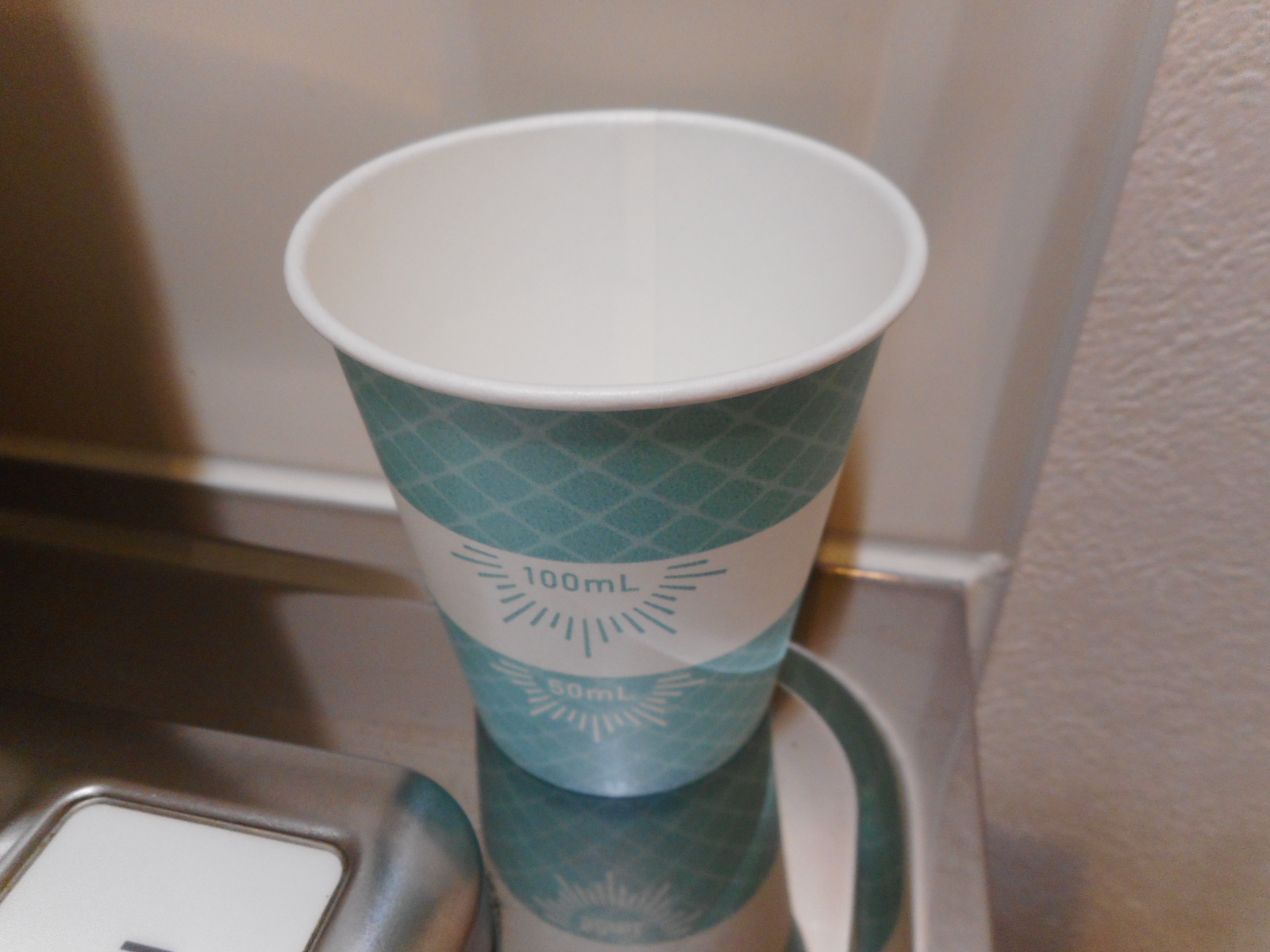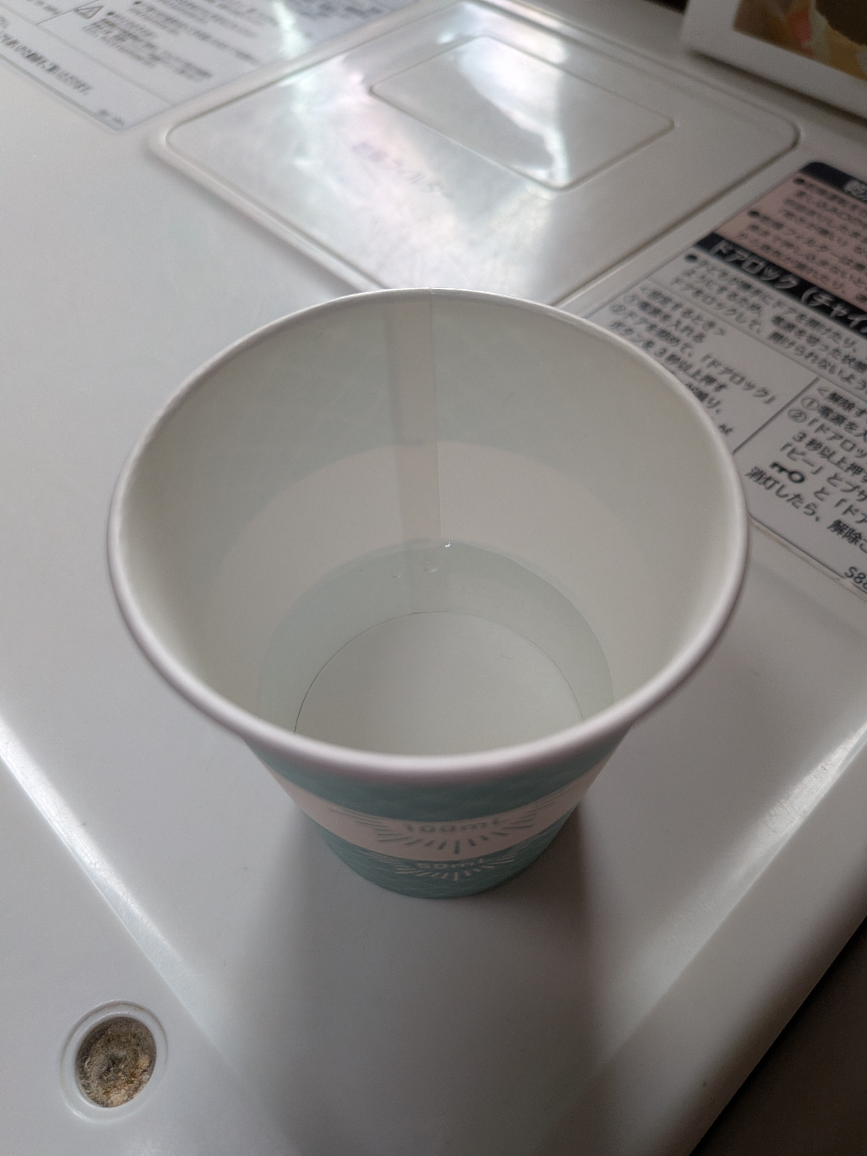 | 初め気づきませんでしたが、紙コップ3パターン入っていました。メモリの代わりに帯状のラインで分量をわかるようにしていてデザインは良いと思います。照明の明るいところだと紙コップの内側からうっすら先ほどのラインが裏うつりするので、ここのラインだから50かとか100かと判断できますが、照明が少し暗めのところだとそれができないのでちゃんと分量を見ようとすると一度平たいところに置いてコップの外のメモリをみて内側から覗く感じになるのでかえって時間がかかってしまう気もしました。3つのデザインの中で1番計量しやすかったものは真ん中に白いライン、上下が緑のチェックのものでした。うがいとなるとうがい薬の濃度はそこまで神経質にはかってませんでしたが、医療機関や飲食店の配置されるようなイメージであれば、外側の見た目かわいいデザインより内側にラインか点や線で50.100なら目印がついてから方が使いやすいと感じました。個人的にはうがい用よりも企業などでサンプリングする場合が使い勝手が良さそうな気がしました。 |