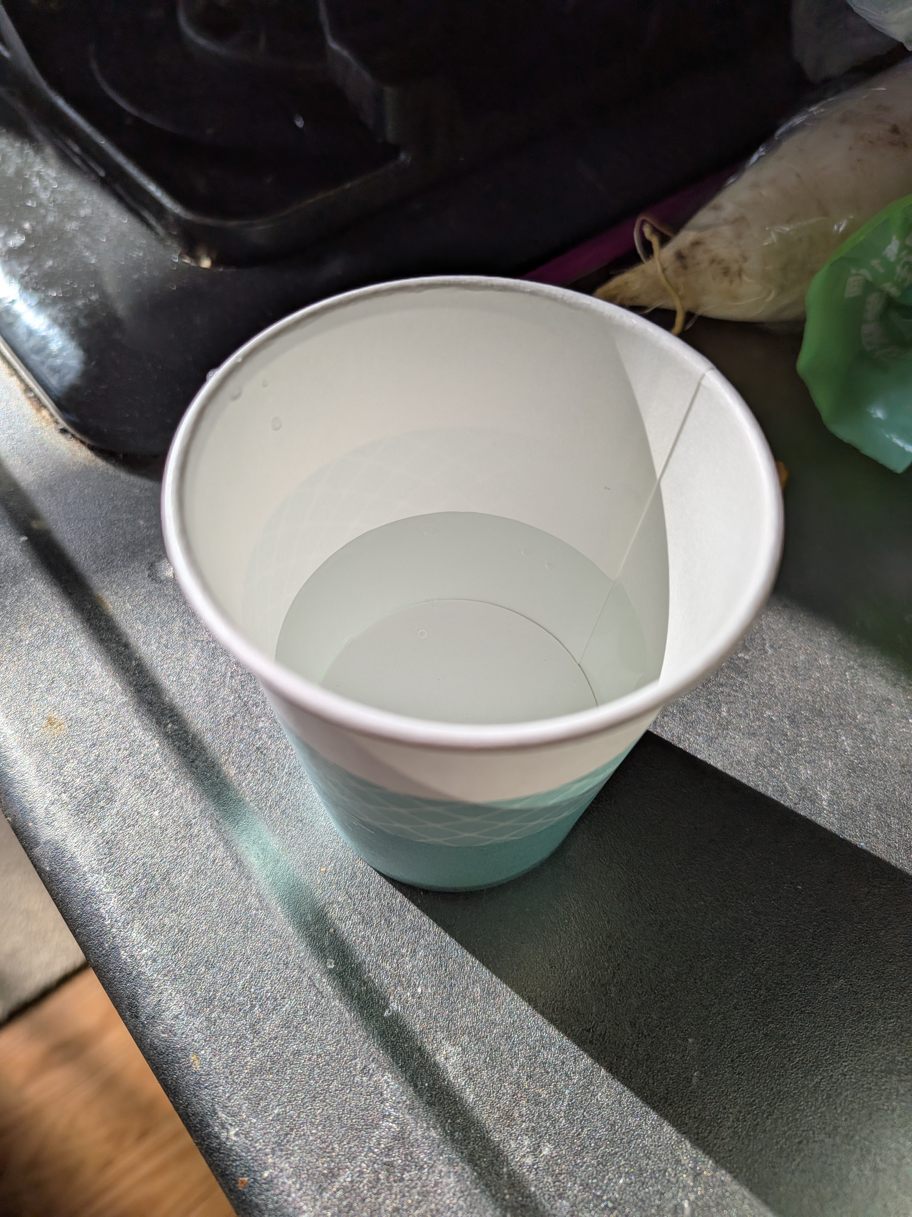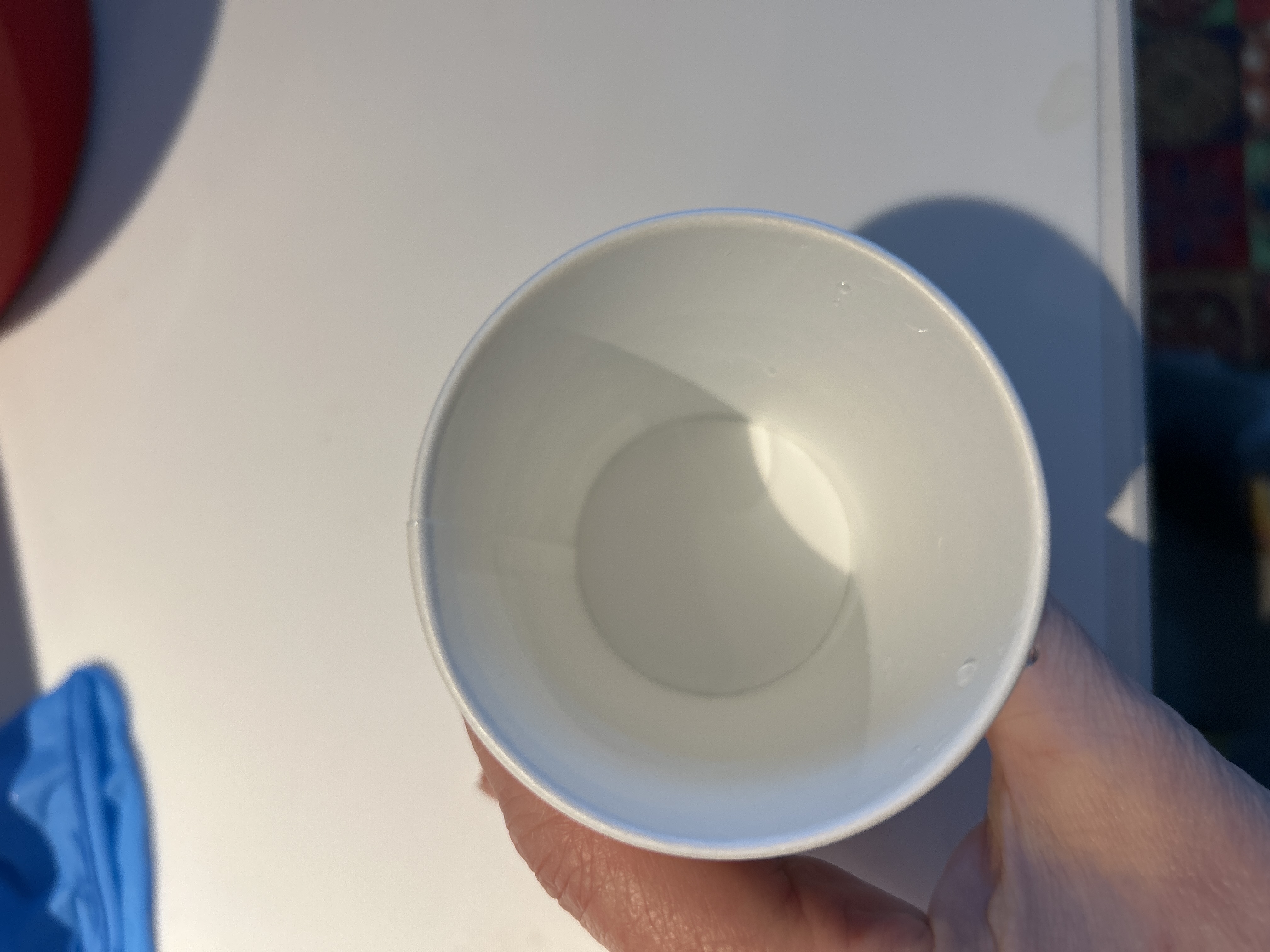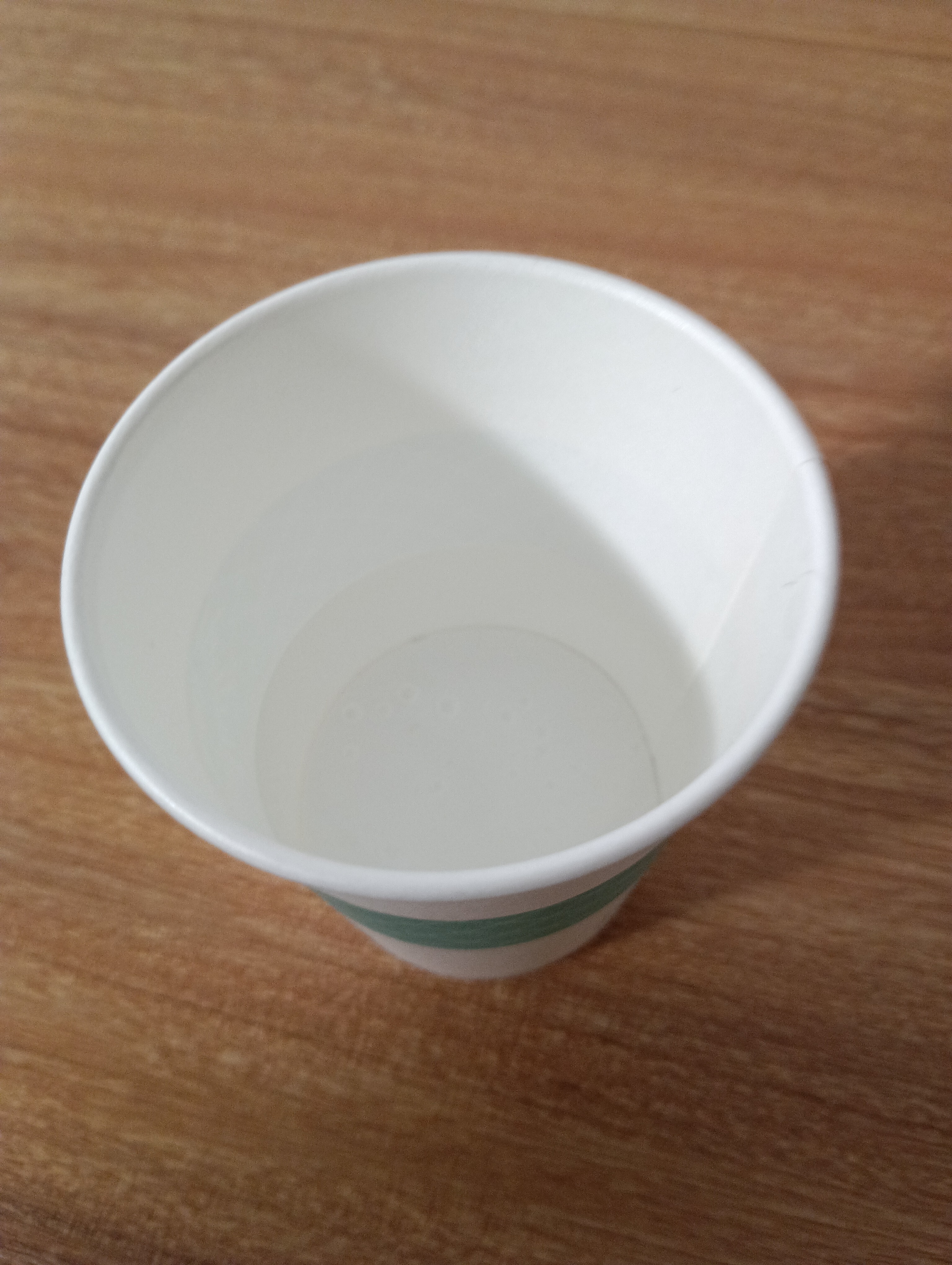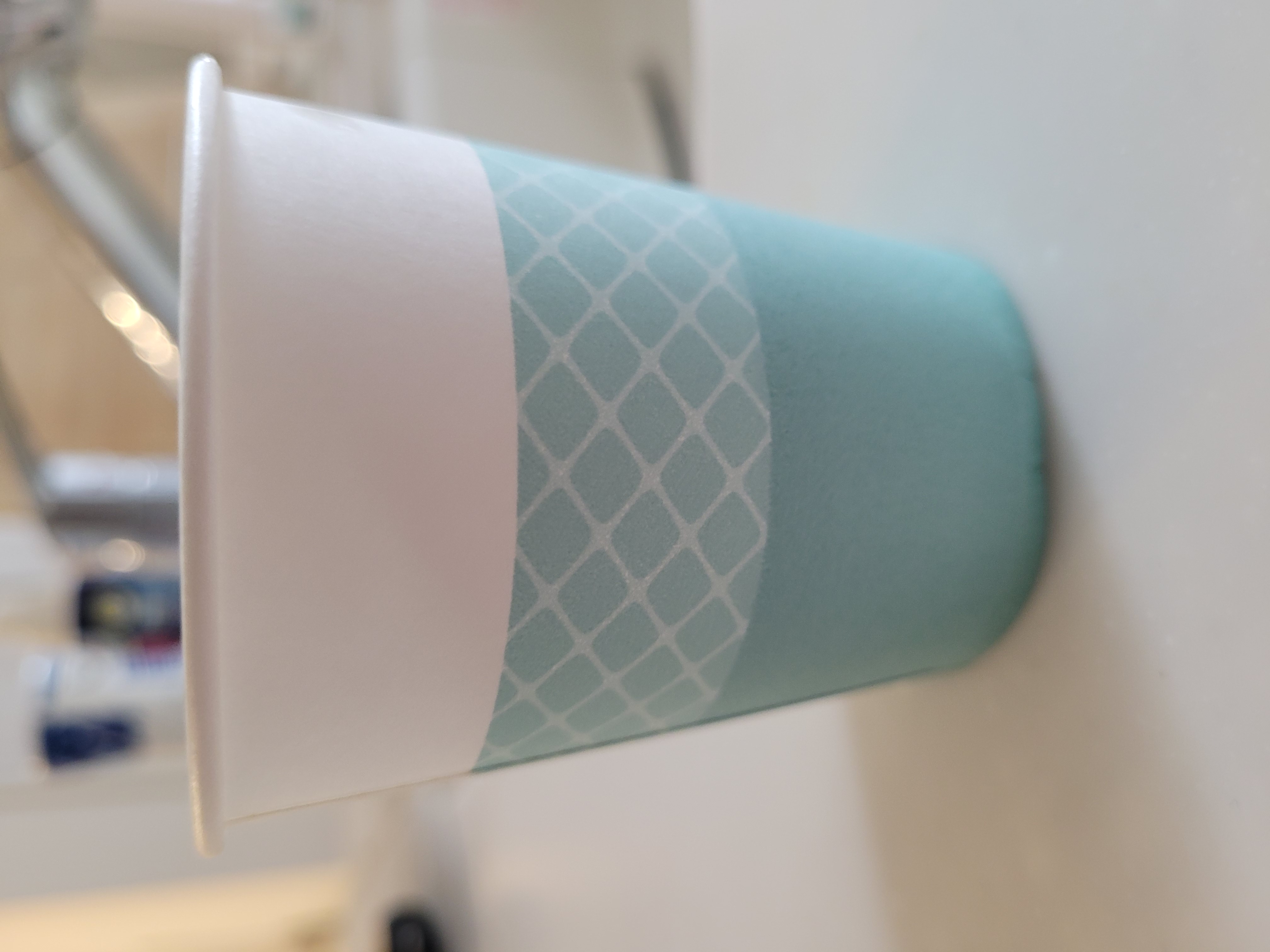 | 初め気づきませんでしたが、紙コップ3パターン入っていました。メモリの代わりに帯状のラインで分量をわかるようにしていてデザインは良いと思います。照明の明るいところだと紙コップの内側からうっすら先ほどのラインが裏うつりするので、ここのラインだから50かとか100かと判断できますが、照明が少し暗めのところだとそれができないのでちゃんと分量を見ようとすると一度平たいところに置いてコップの外のメモリをみて内側から覗く感じになるのでかえって時間がかかってしまう気もしました。3つのデザインの中で1番計量しやすかったものは真ん中に白いライン、上下が緑のチェックのものでした。うがいとなるとうがい薬の濃度はそこまで神経質にはかってませんでしたが、医療機関や飲食店の配置されるようなイメージであれば、外側の見た目かわいいデザインより内側にラインか点や線で50.100なら目印がついてから方が使いやすいと感じました。個人的にはうがい用よりも企業などでサンプリングする場合が使い勝手が良さそうな気がしました。 |