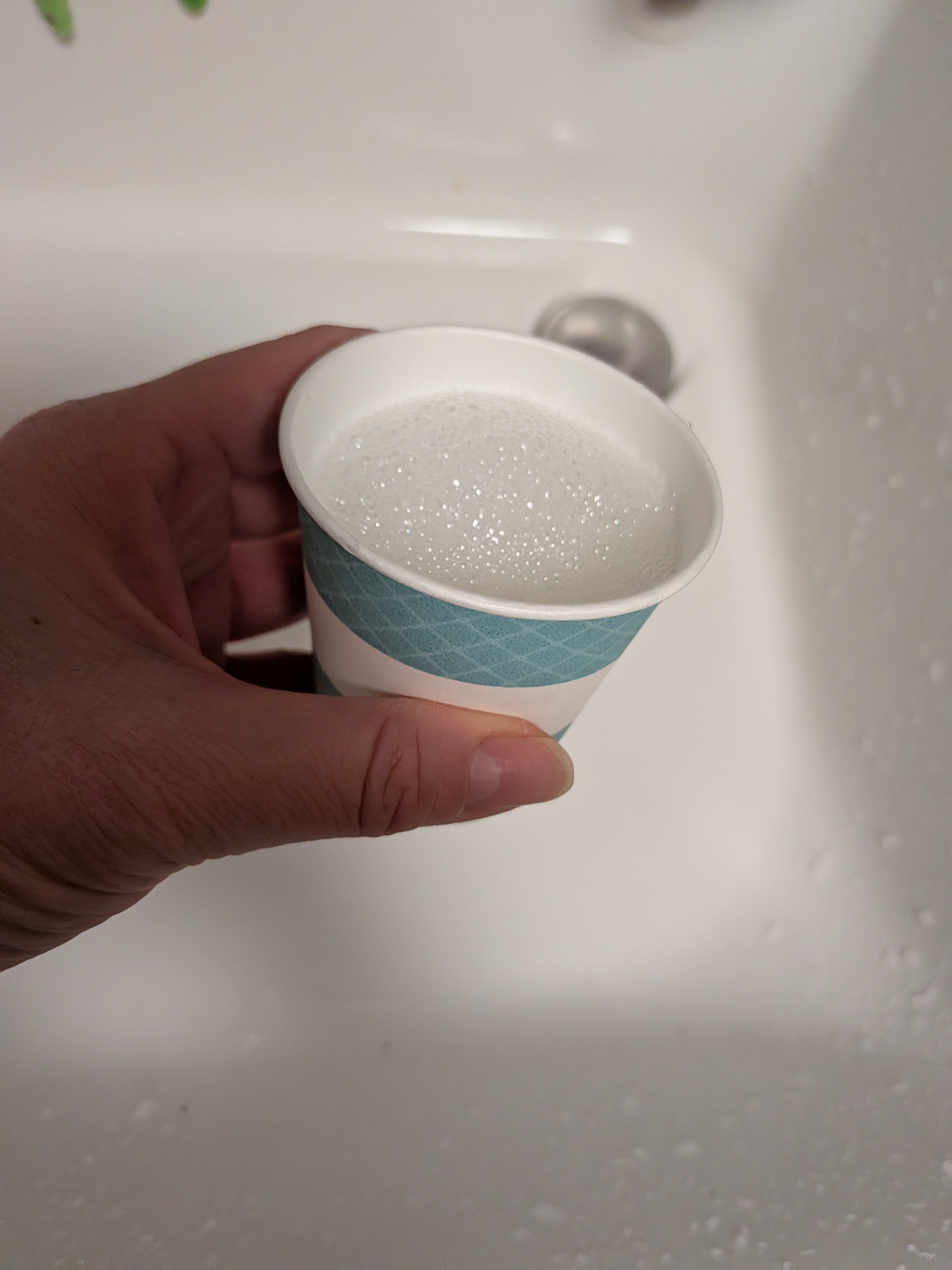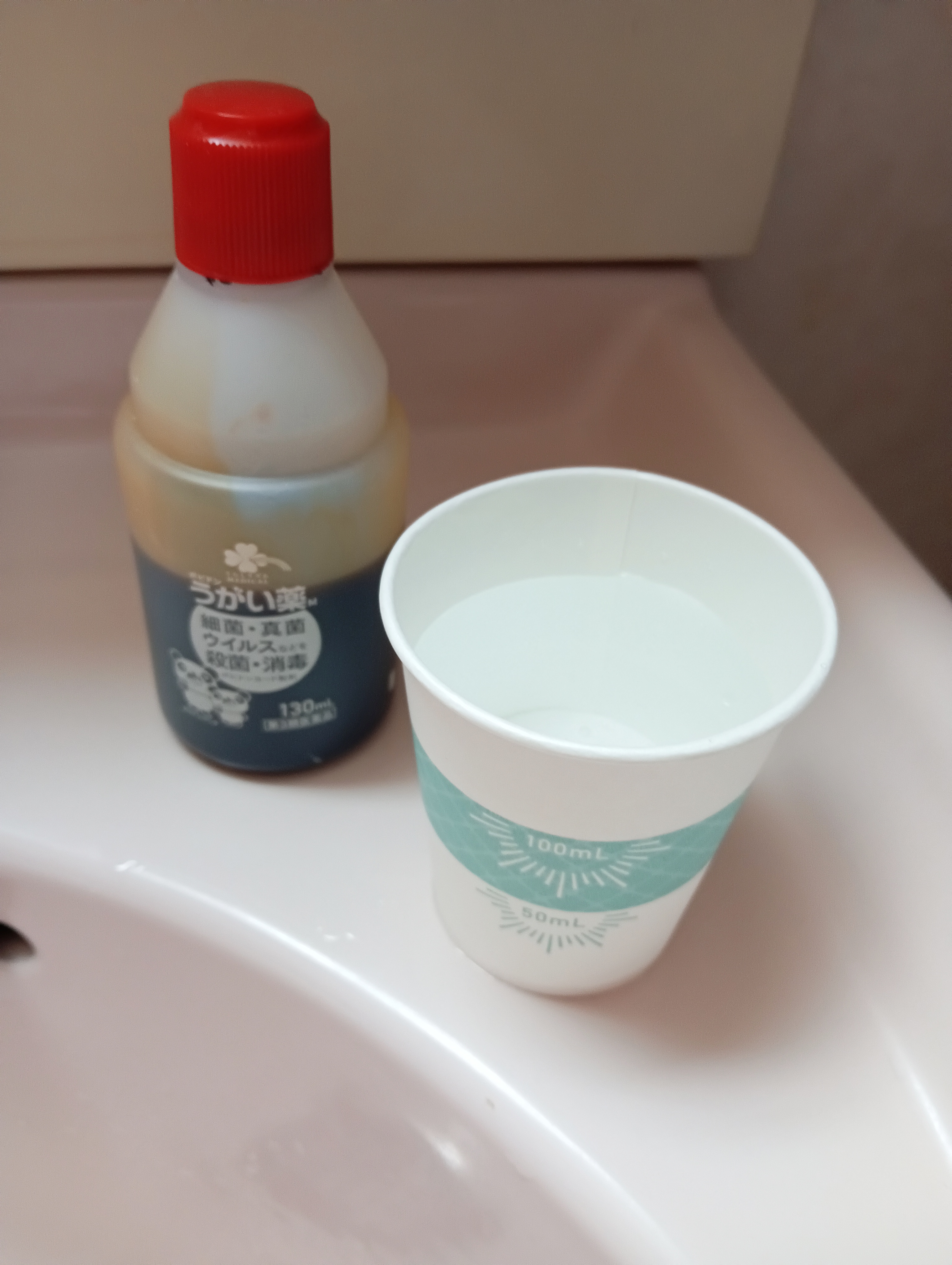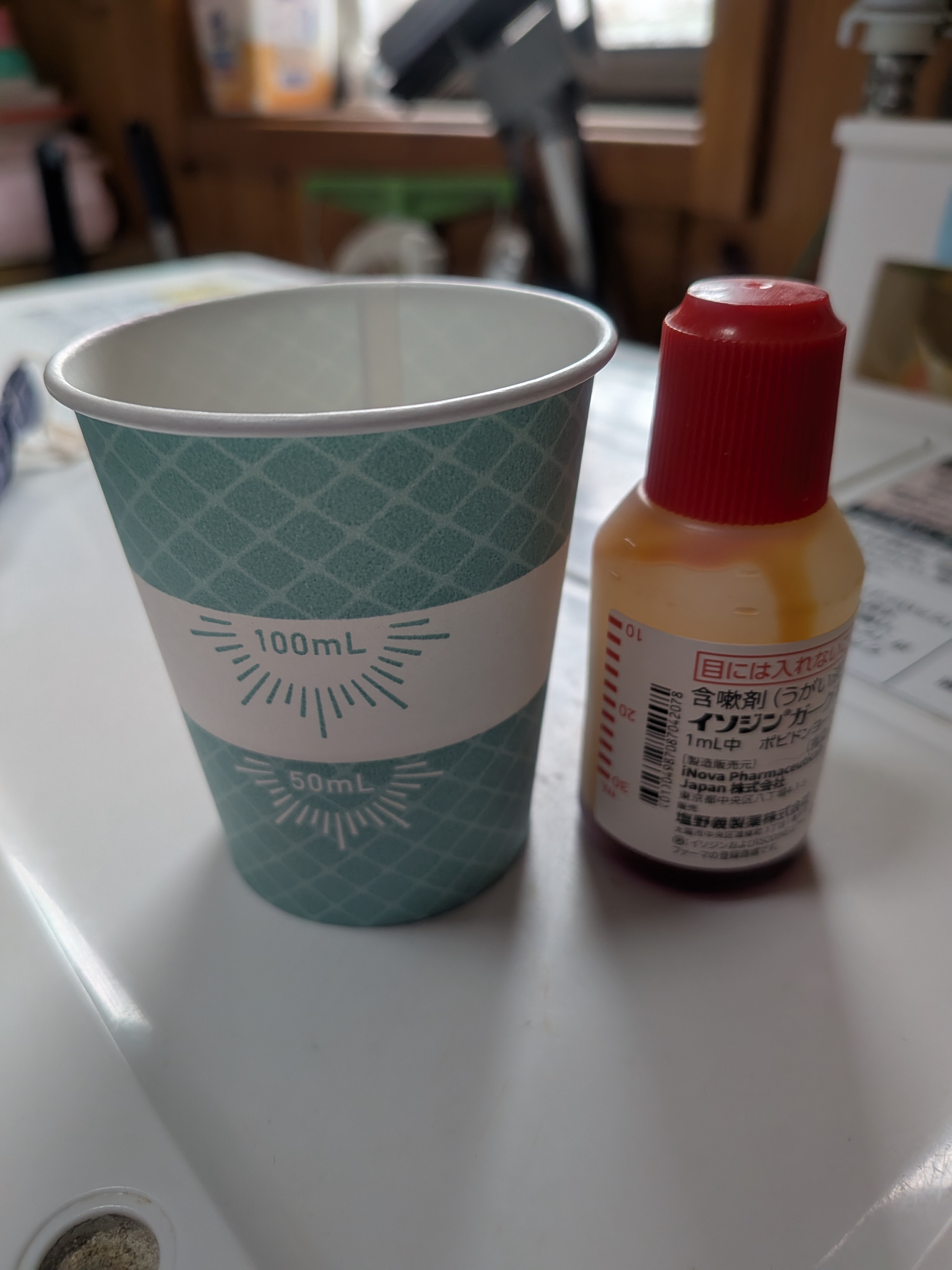 | うがい薬をいれる紙コップとのとこですが、見た目にはおしゃれでわからないところが良いかと思いました。 また、色使いもよくお気に入りです。 紙質は柔らかいほうで待つ時に少しへこみそうでしたが、1回切りでコーヒーなど、長い時間入れて置いておくものでもないのでこれでもよいかと思います。 だだ、「紙コップにうがい薬を入れか場合は先に水をいれてください」の印刷はいらないかと思いました。また、私の使ううがい薬は60㎖のお水で希釈する薬でしたので、⭐︎でも・などメモリーの印があれば60㎖の水を入れやすいかと思います。今回は電気の光を通しておおよそ60㎖かなと判断をしました。 計量カップにも使えますし、使い方は色々かと思います。3種類の模様もかわいいです。これからも頑張ってください。 |