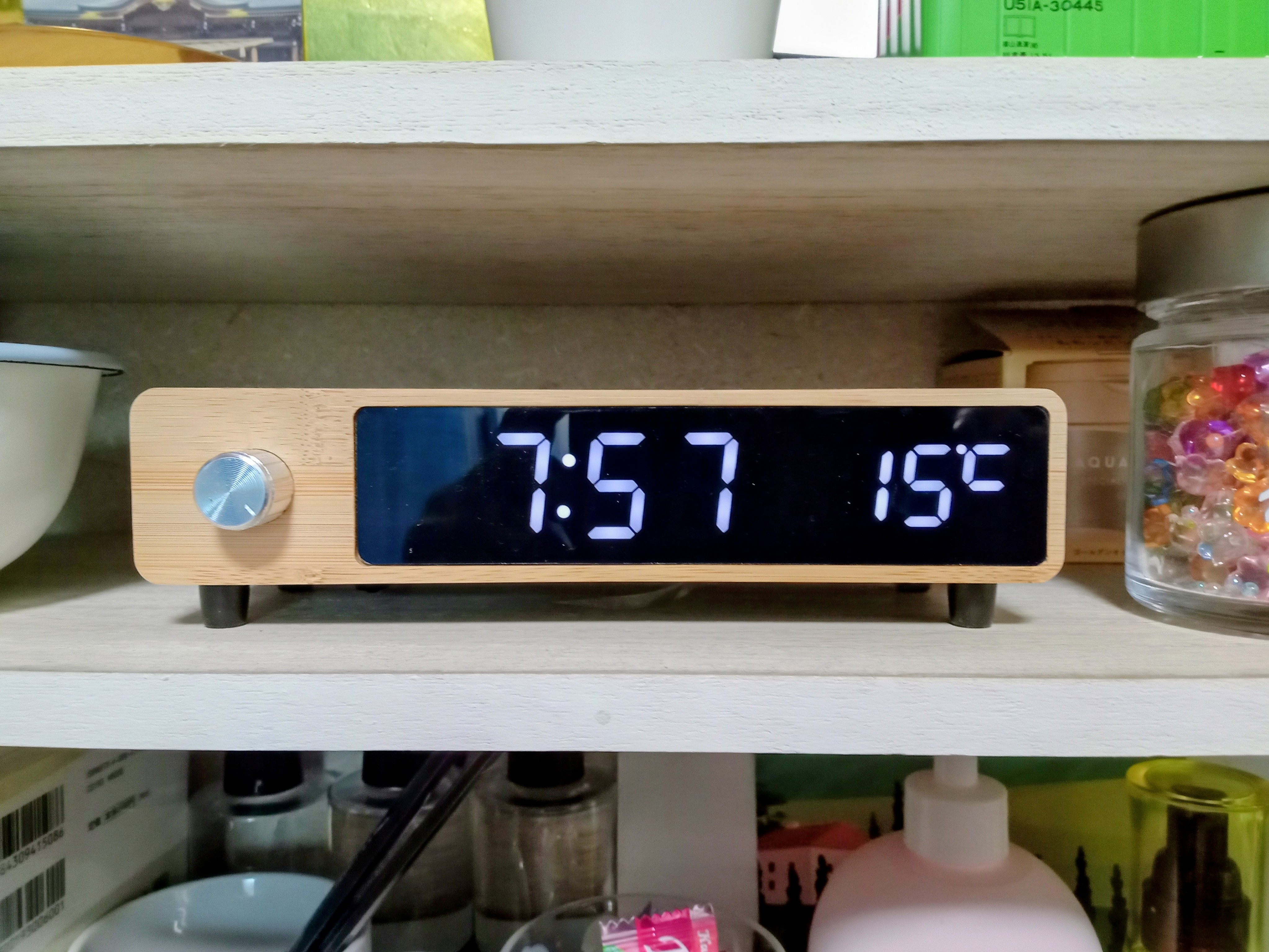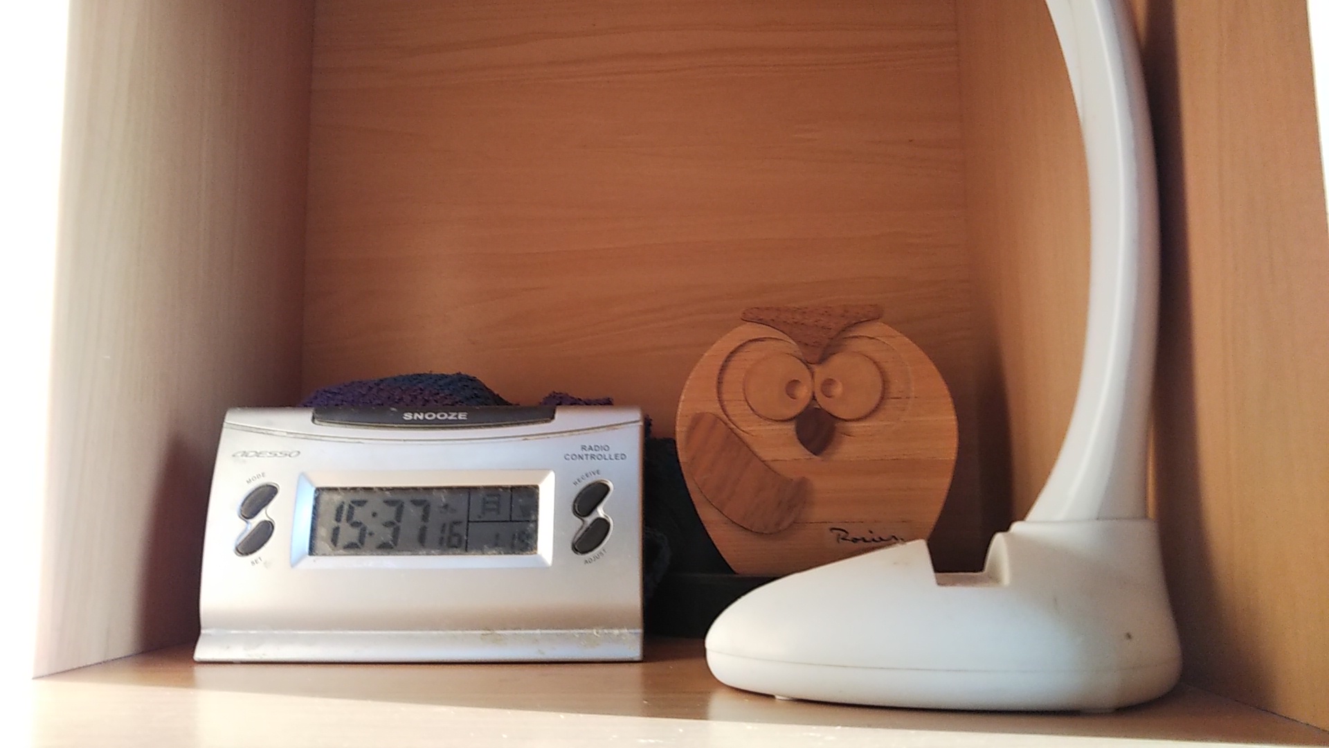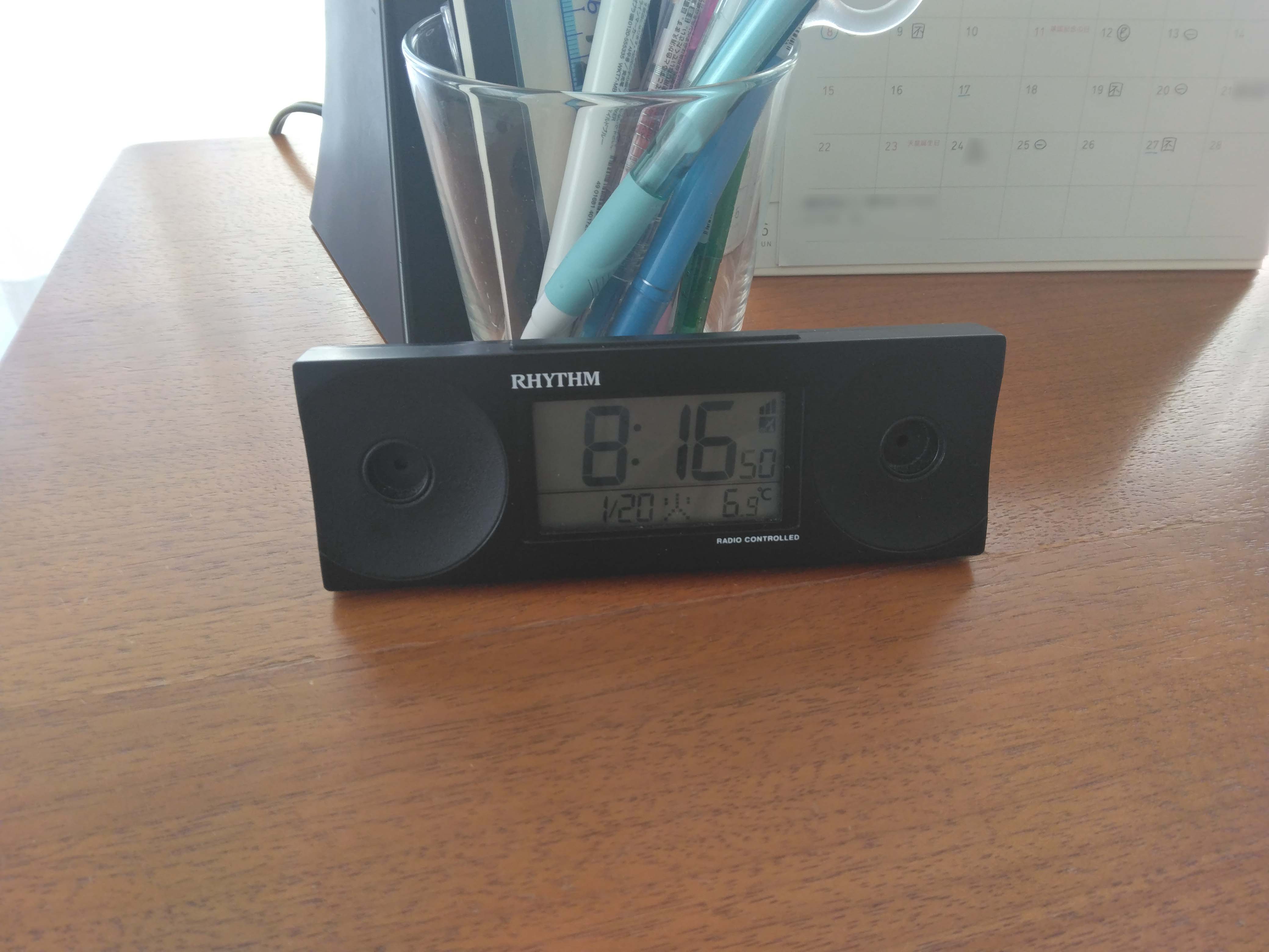 | 日中は机の上に置いています。 目覚まし時計なので、寝るときは枕元に移動します。 |