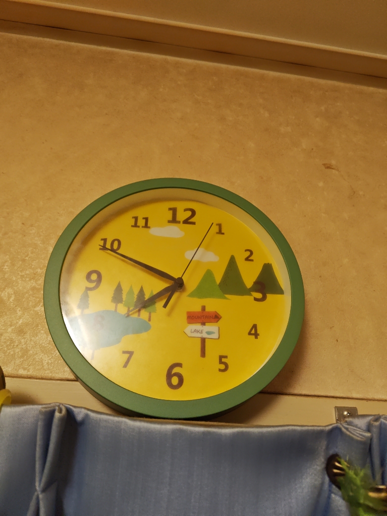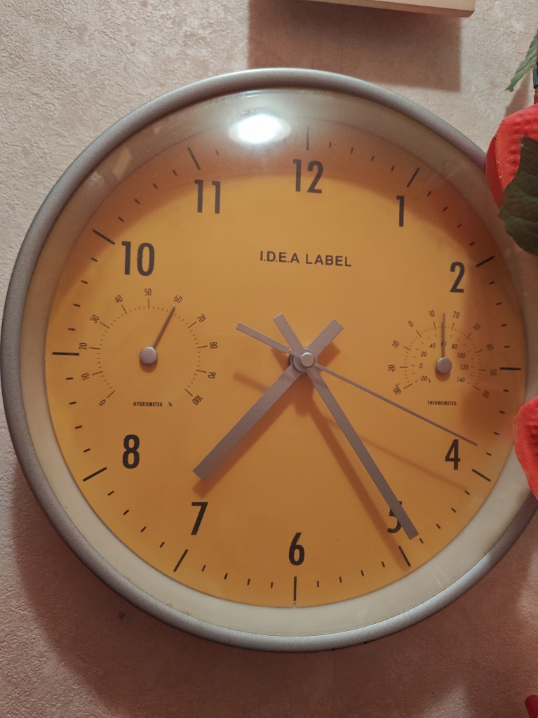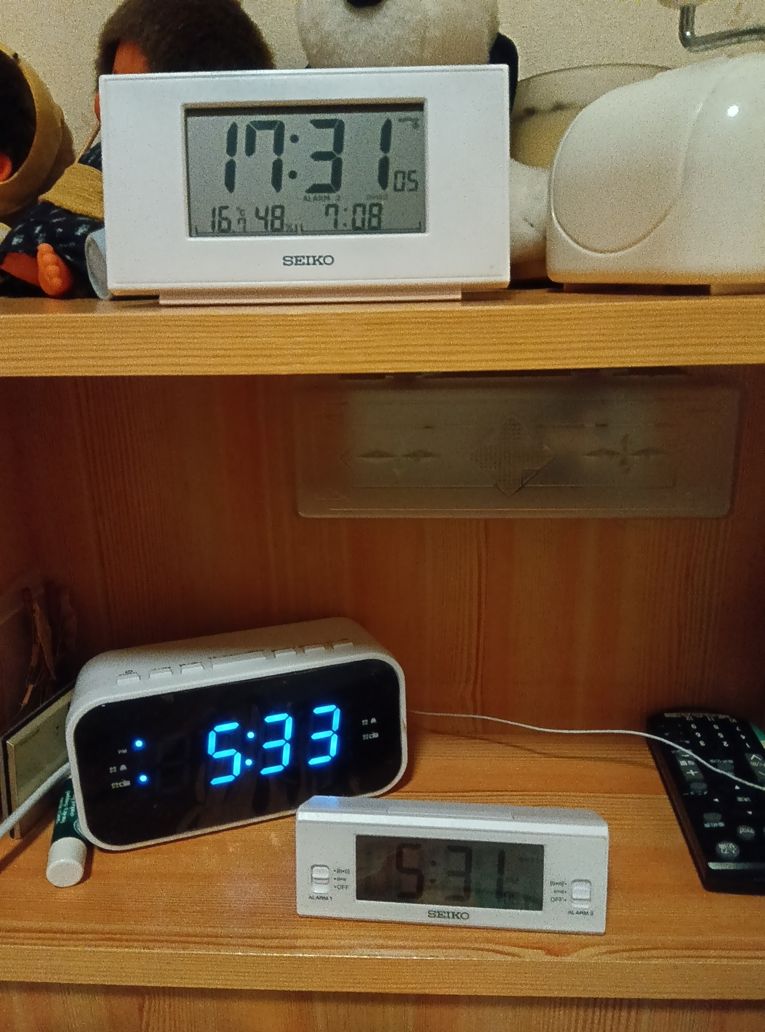 | 1、リビングの掛け時計(電波時計) 2、台所の掛け時計 3、寝室の置き時計(目覚まし時計として使っています) |