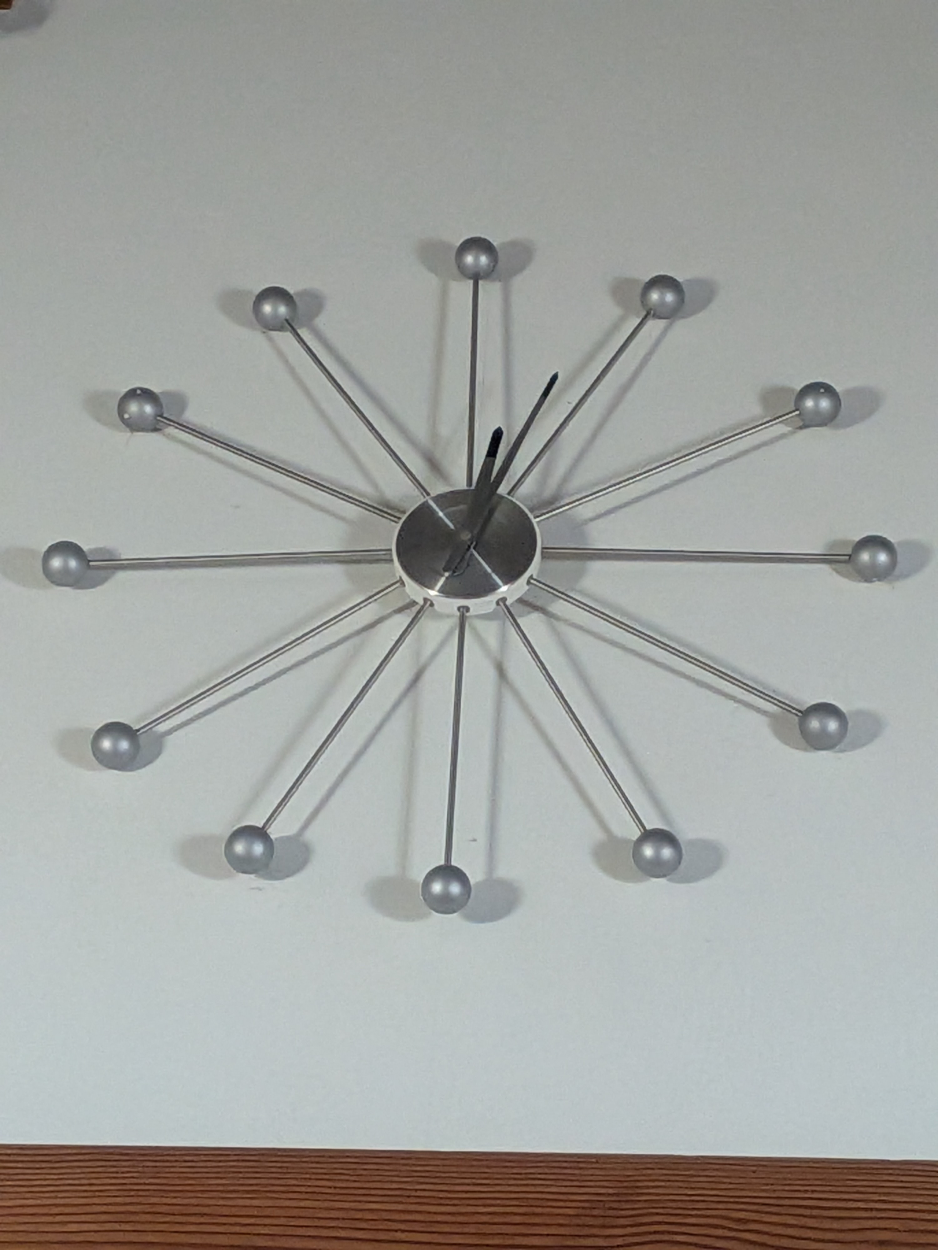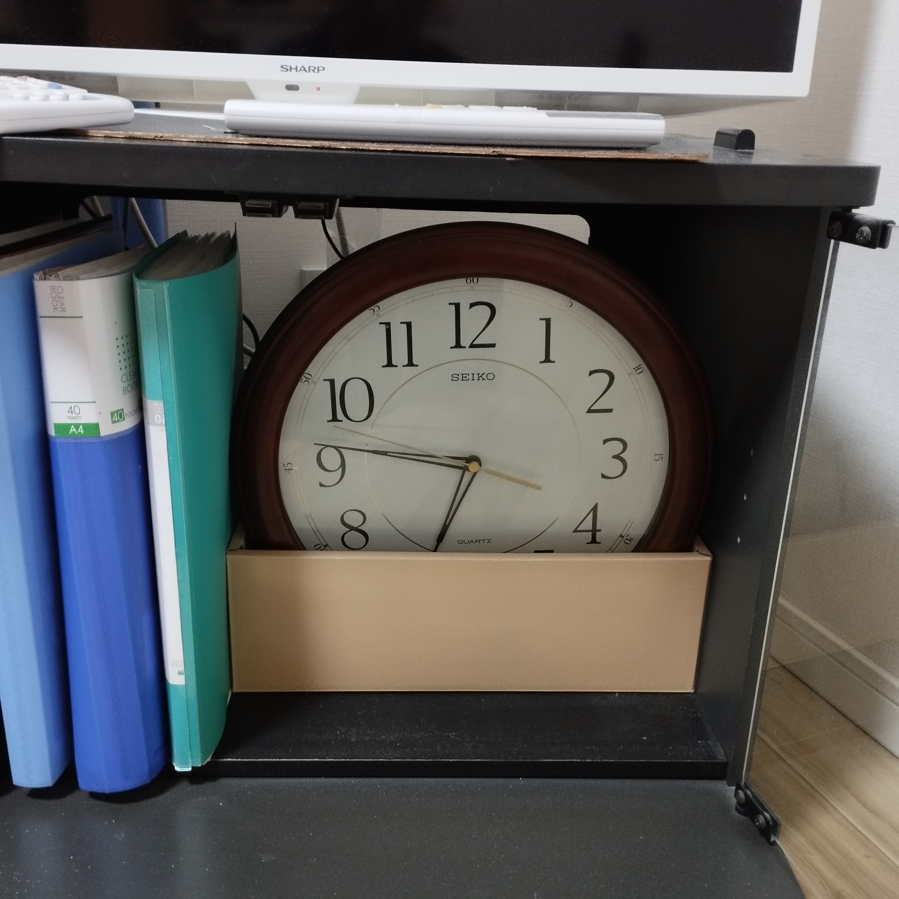 | 今の集合住宅のリビングには、傷めずにフックを取り付けられそうな壁がなく、試行錯誤の末、テレビ台の下に収めたので全体が見られません。大きな時計はわかりやすいので、それでも重宝しています。 |