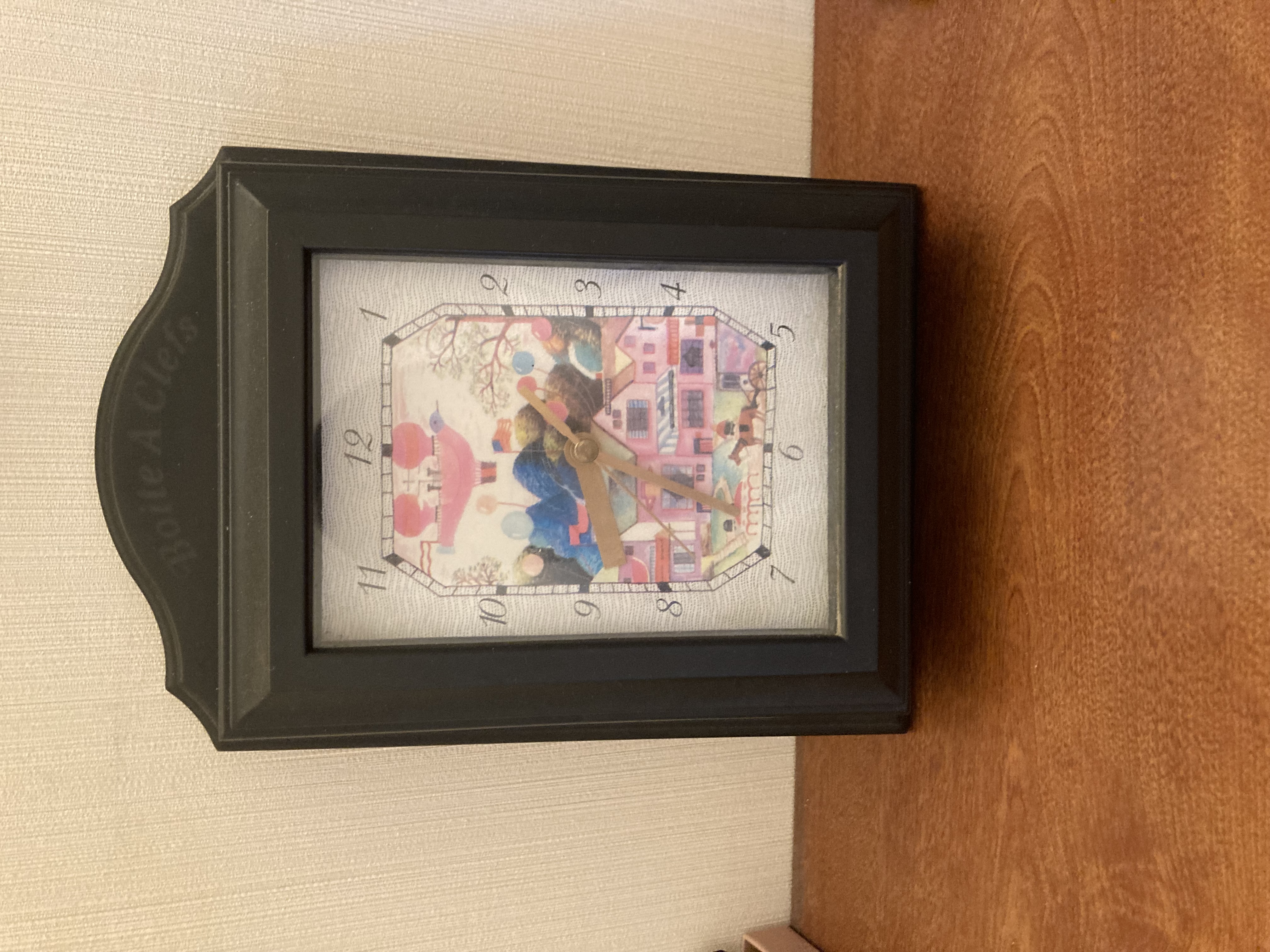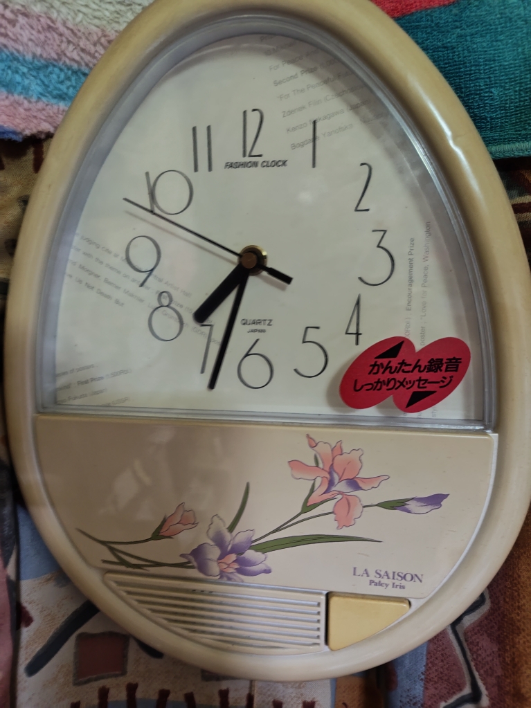 | 小さめの置き時計です。いつも 戸棚に置いてます。写真に写る時刻は1時37分でした。 |