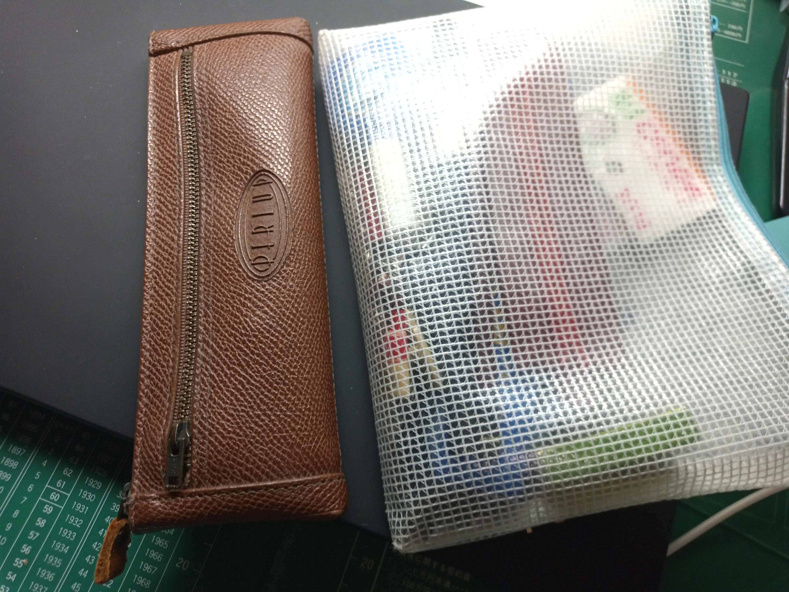 | お気に入りの茶色のペンケースと筆記用具以外のものも色々入れるビニールポーチ |