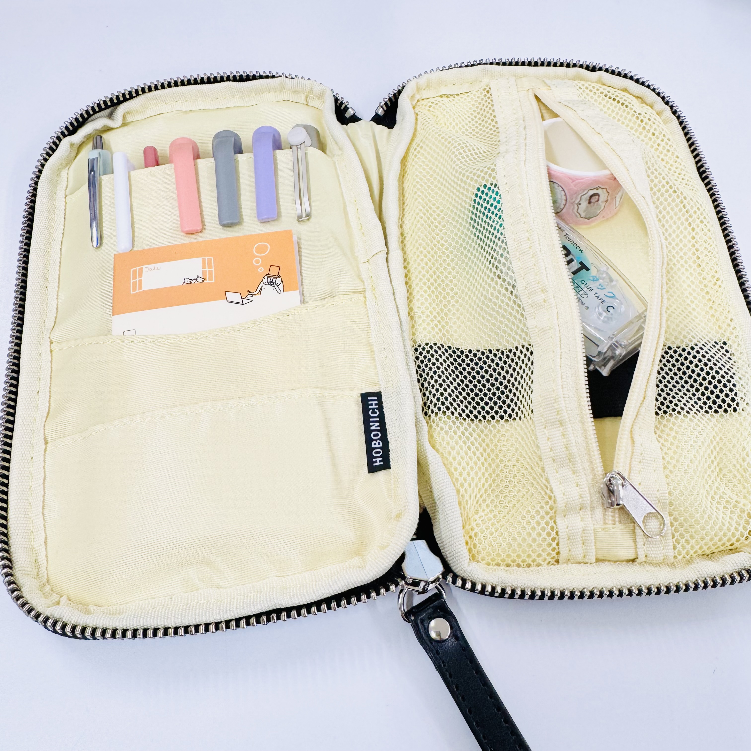 | たっぷり収納できるので、付箋やペンを入れて楽しんでいます。正直ここまで使わないのですが、楽しいので。 |