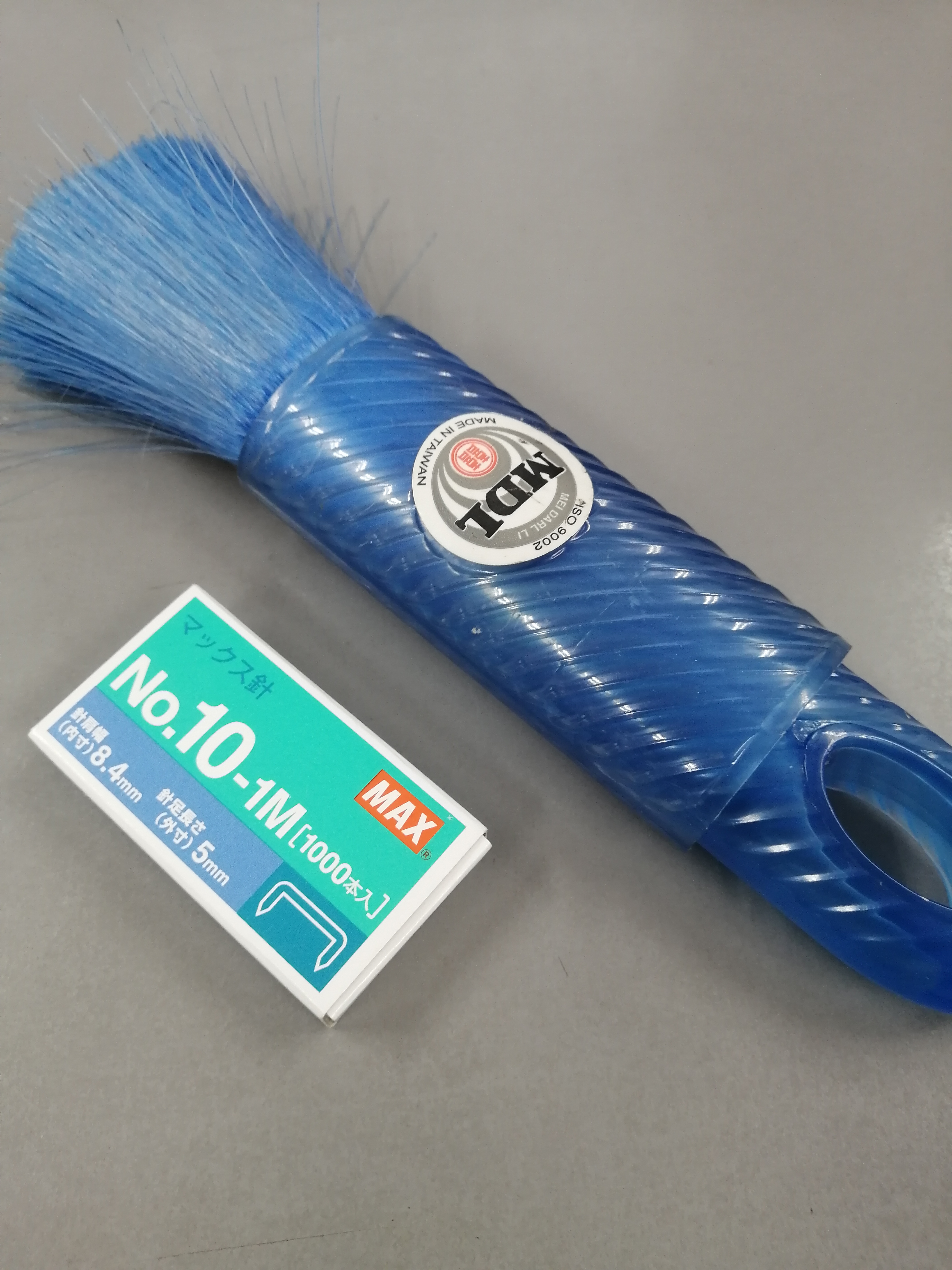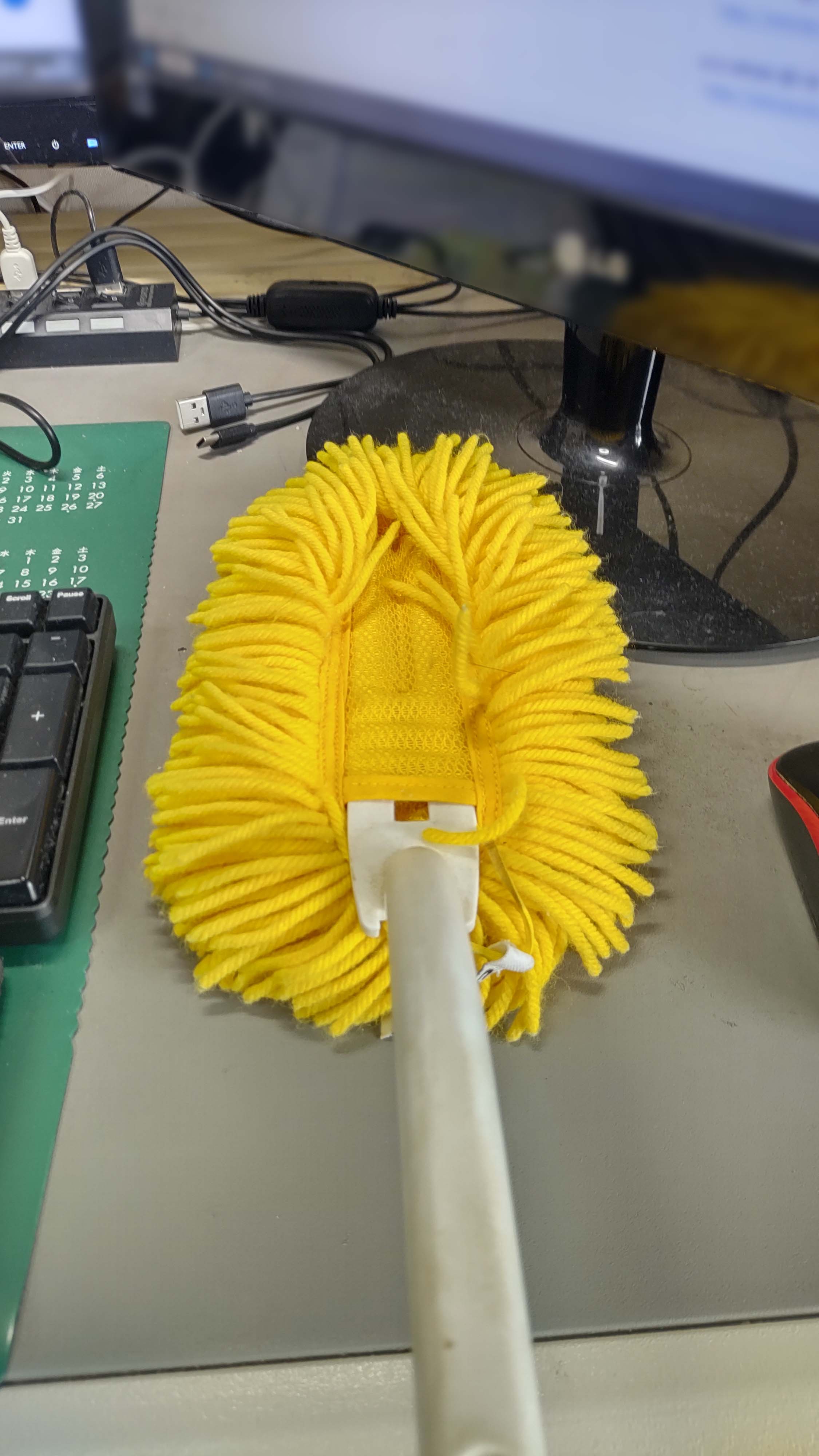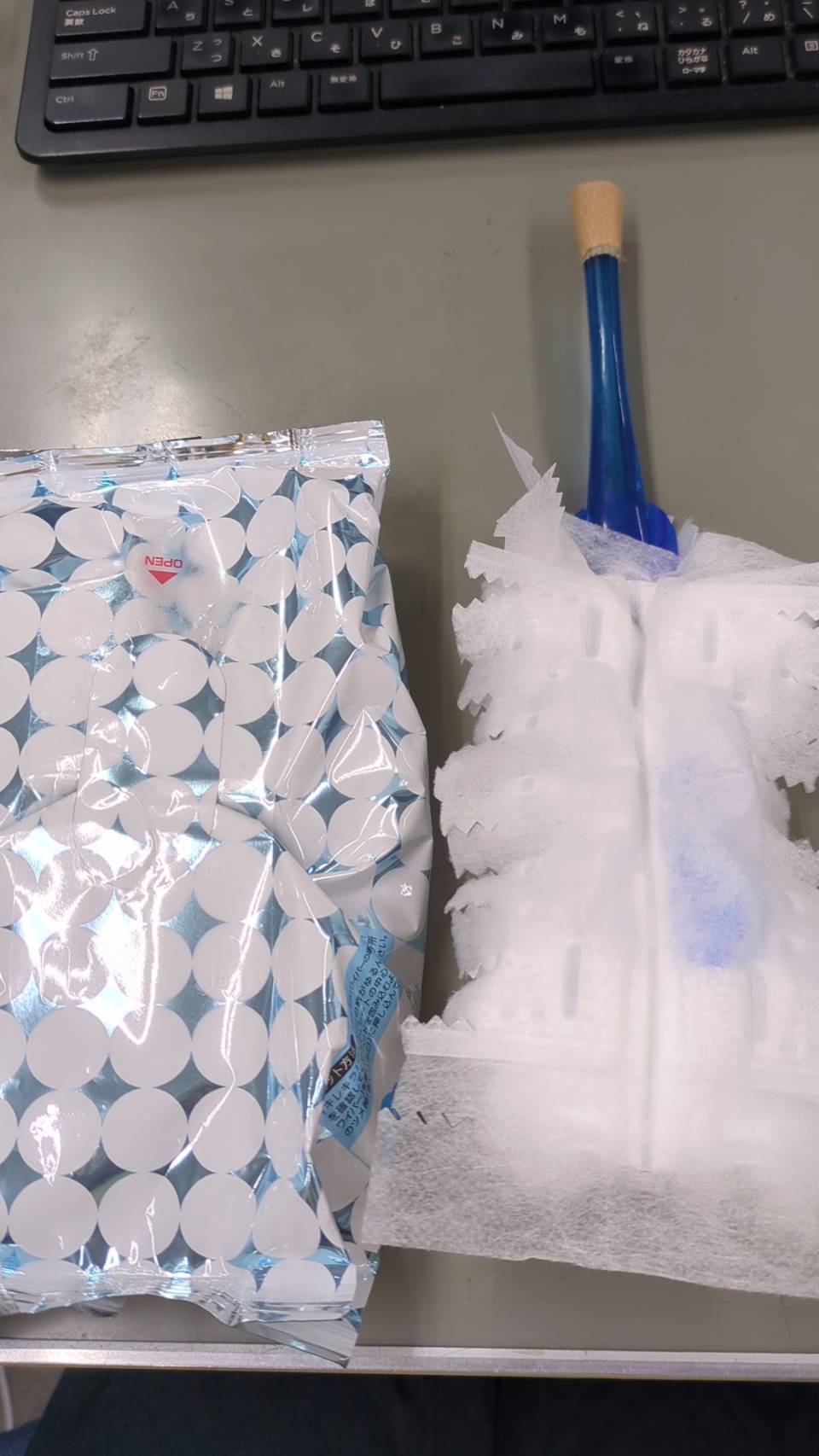 | 市販のクイックワイパーを持ち込んでます。取替は会社に買ってもらってます。そして、私が来た時から机の中に有ったキーボード掃除するブラシ。意外と働いてくれます。 |
