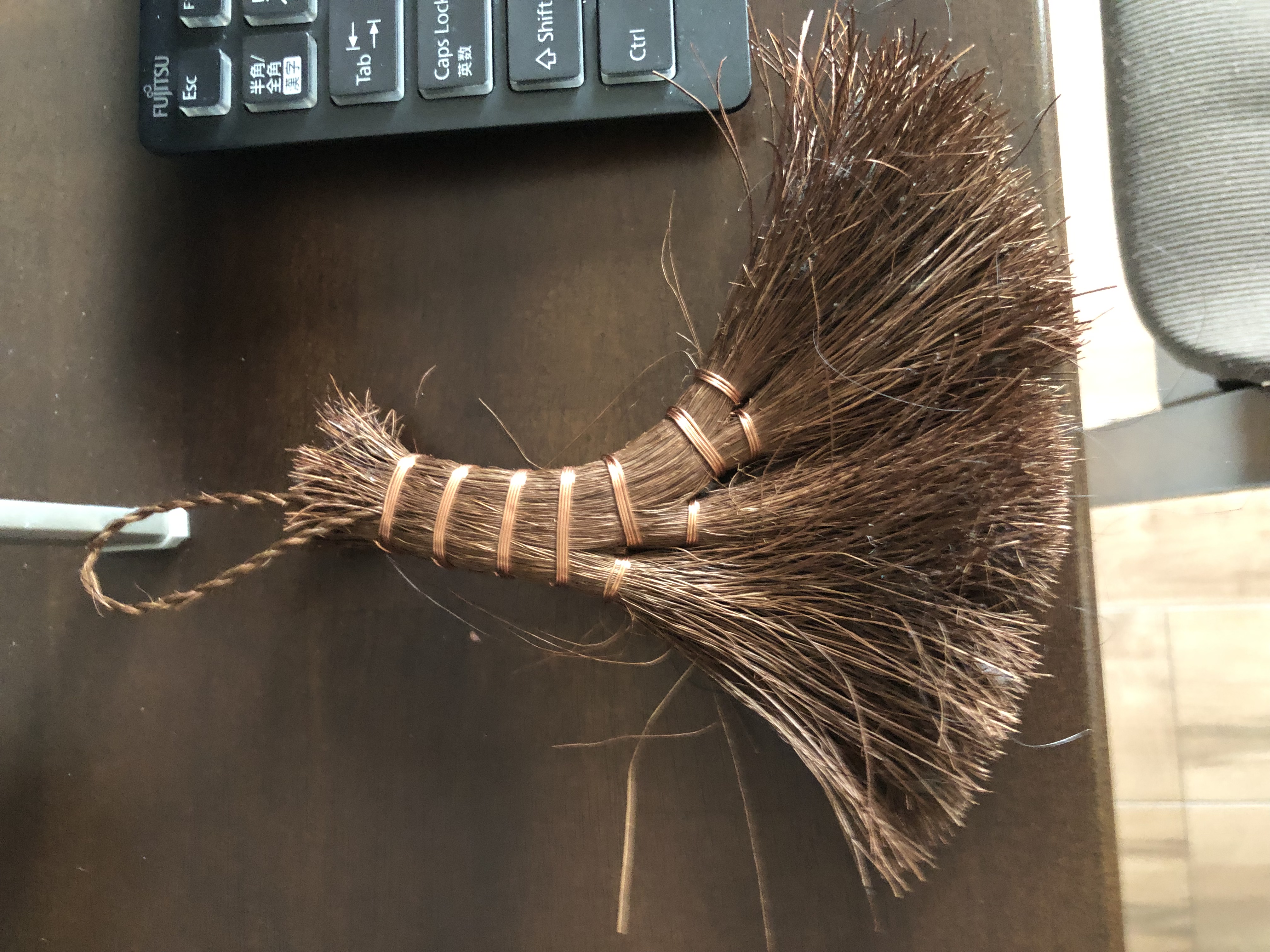 | 職場のデスク周りの掃除には、この小さな棕櫚の箒を愛用しています。 選んだポイントは、やはり天然素材ならではの風合いと、キーボードの隙間にもスッと入るしなやかさです。化学繊維のモップと違い静電気が起きにくいので、ホコリをしっかり集めてくれる実用性の高さも気に入っています。 毎日、仕事の開始前と終わりにササッと掃くのが日課。手になじむ感覚が心地よく、掃除というよりは「整える」時間として楽しんでいます |