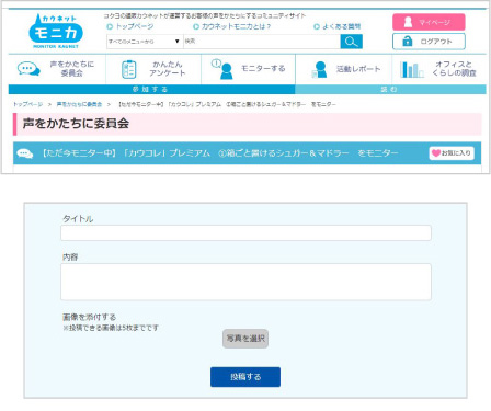 商品に同梱している「モニター手順書」に記載のQRコード、または、カウネットモニカ「声をかたちに委員会」の[ただ今モニター中]のついた該当商品ページから、写真投稿をお願いします。