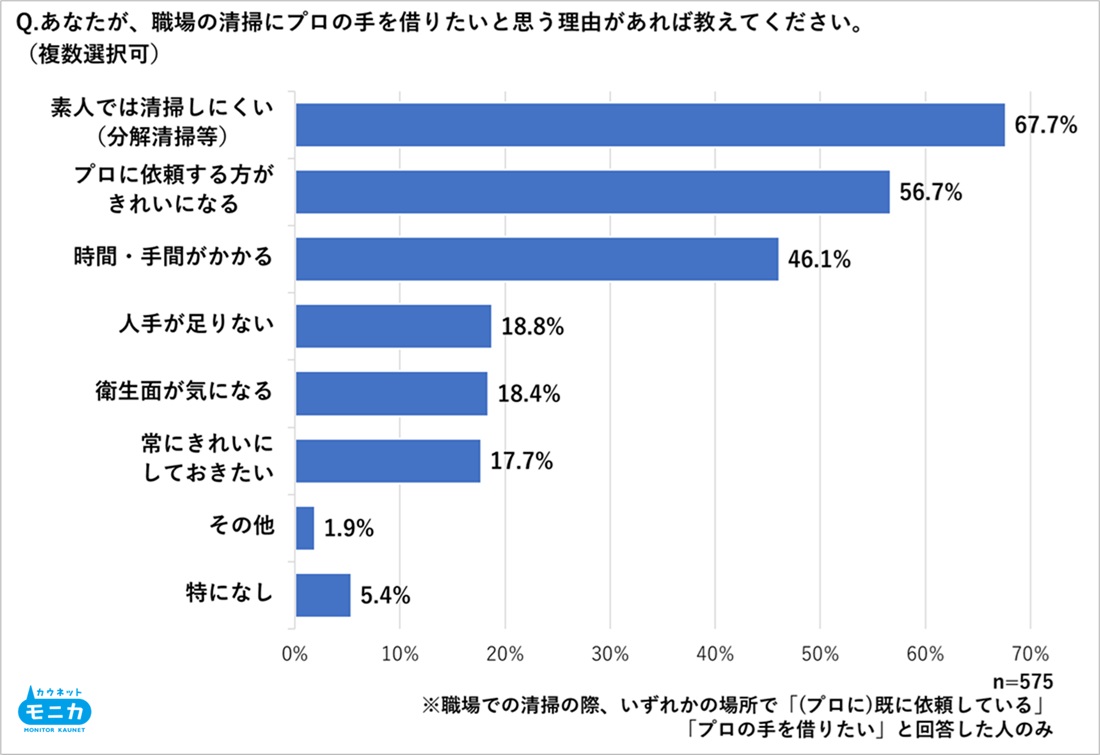 ・職場の清掃をプロに依頼したい主な理由は「素人では清掃しにくい」「プロに依頼する方がきれいになる」。