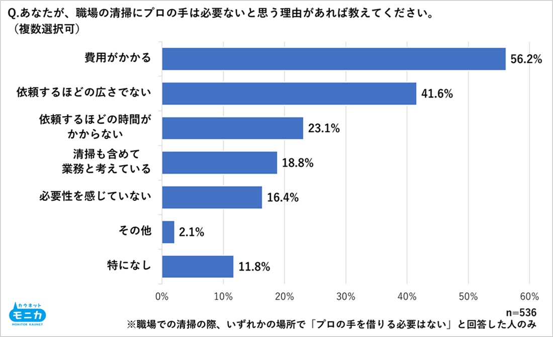■職場にプロ清掃が必要ない主な理由は「費用がかかる」「広さが小規模」。