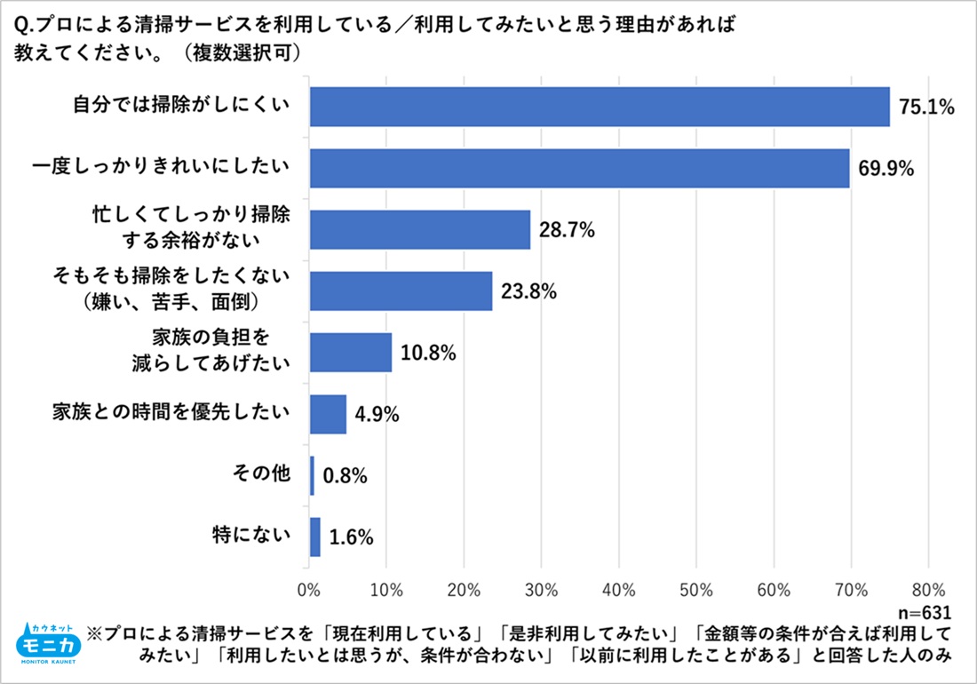 ・自宅の清掃をプロに依頼したい主な理由「自分では掃除がしにくい」「一度しっかりきれいにしたい」。