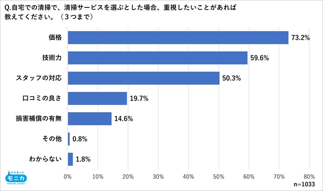 自宅で清掃サービスを利用する際に重視したい点については、「価格」が最多で73.2%と、コスト意識の高さが際立ちました。次いで「技術力」(59.6%)、「スタッフの対応」(50.3%)が続き、清掃の質や接遇の良さも重要視されていることがうかがえます。一方、「口コミの良さ」(19.7%)や「損害補償の有無」(14.6%)といった要素は一定の関心を集めつつも、相対的には重視度が低くなっています。全体として、価格とサービスの質の両立が求められており、利用者の期待値は「手頃で、かつきれいにしてくれること」に集約されているといえそうです。