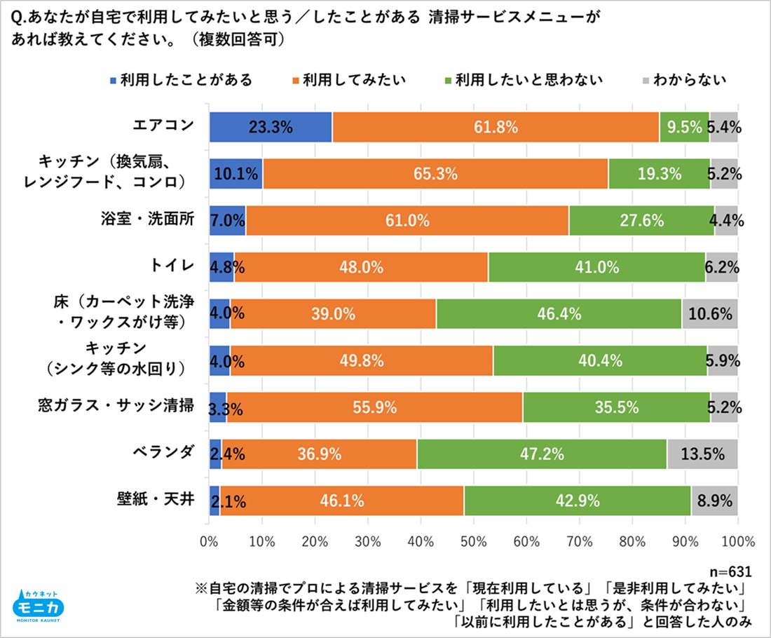 自宅の清掃サービスで「利用してみたい」とされるメニューは、「キッチン(換気扇、レンジフード、コンロ)」が最も高く65.3%、次いで「エアコン」61.8%、「浴室・洗面所」61.0%、「窓ガラス・サッシ」55.9%など、専門的なスキルや労力が必要とされる箇所が上位を占めました。一方で実際の利用経験は「エアコン」23.3%以外はいずれも2〜10%程度にとどまっています。実利用はまだ限定的ではありますが、利用意向は非常に高いことがわかる結果となりました。