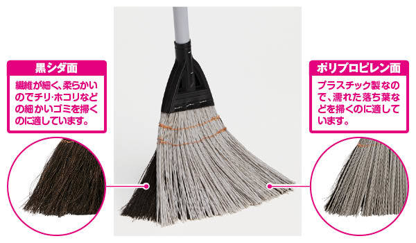 - 会社フロアはほうきで取れるゴミがあり、掃除機とは違った掃除ができました。会社倉庫は取れにくい大きめのゴミや石等が取れやすくなりました。自宅玄関前のゴミや石等は掃きにくいので、シダとポリプロピレンのほうきを使い分けていましたが、一本で使い分けできてよいです。また、長さもよく、使いやすいです。